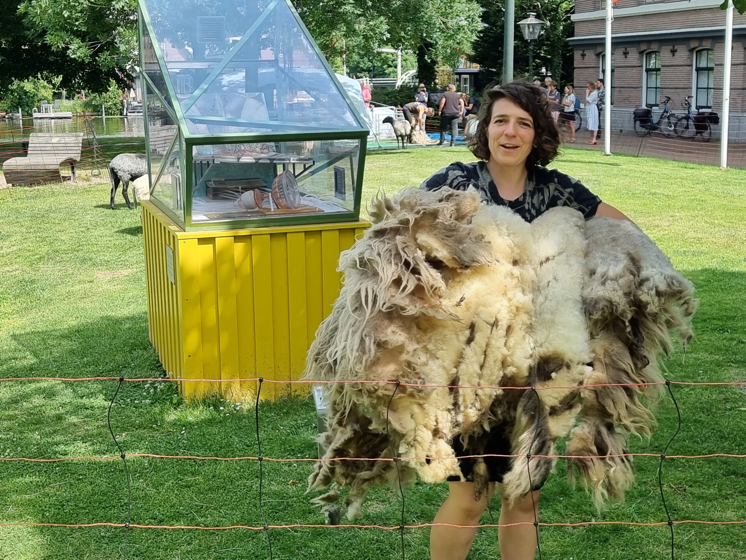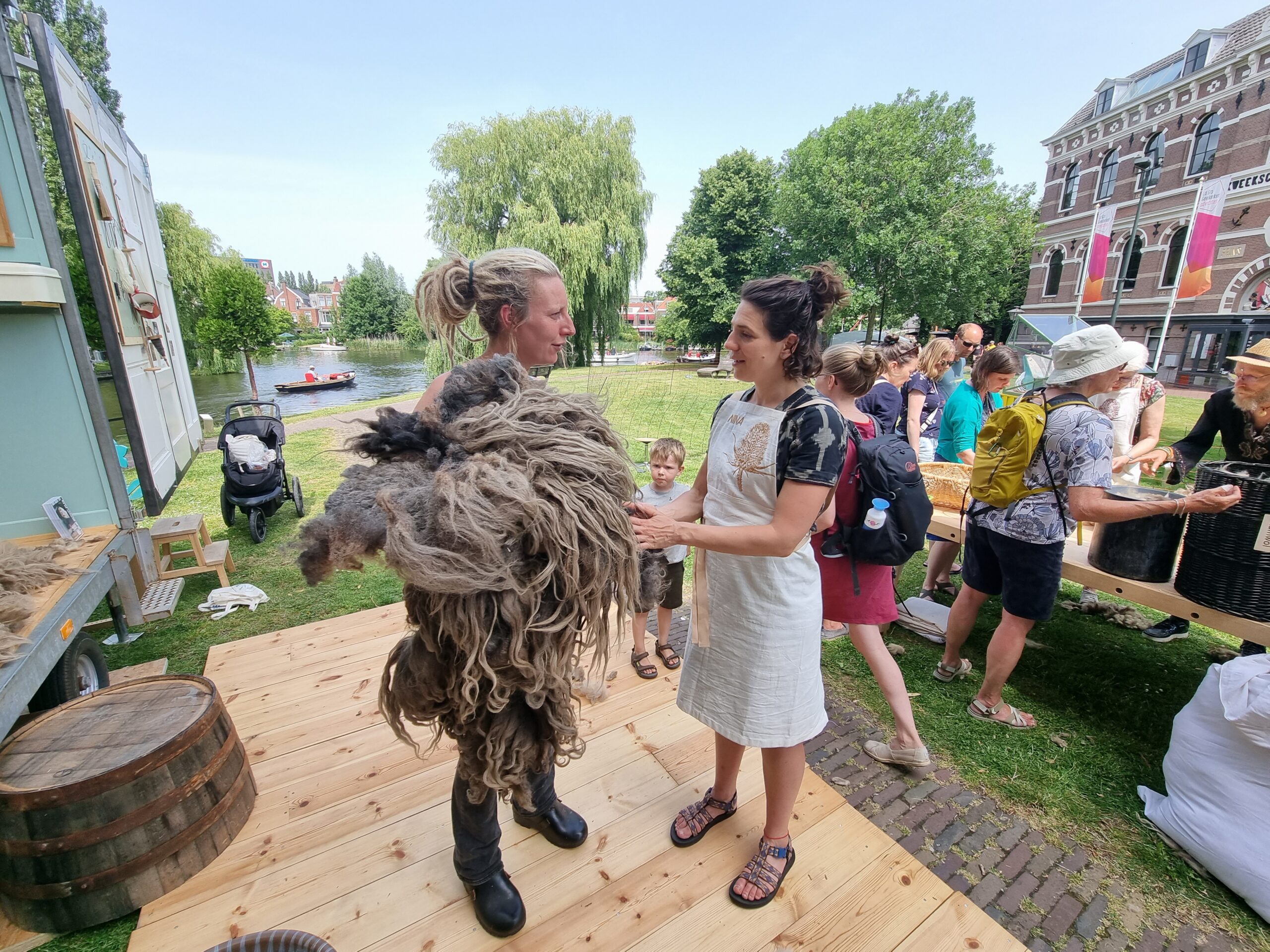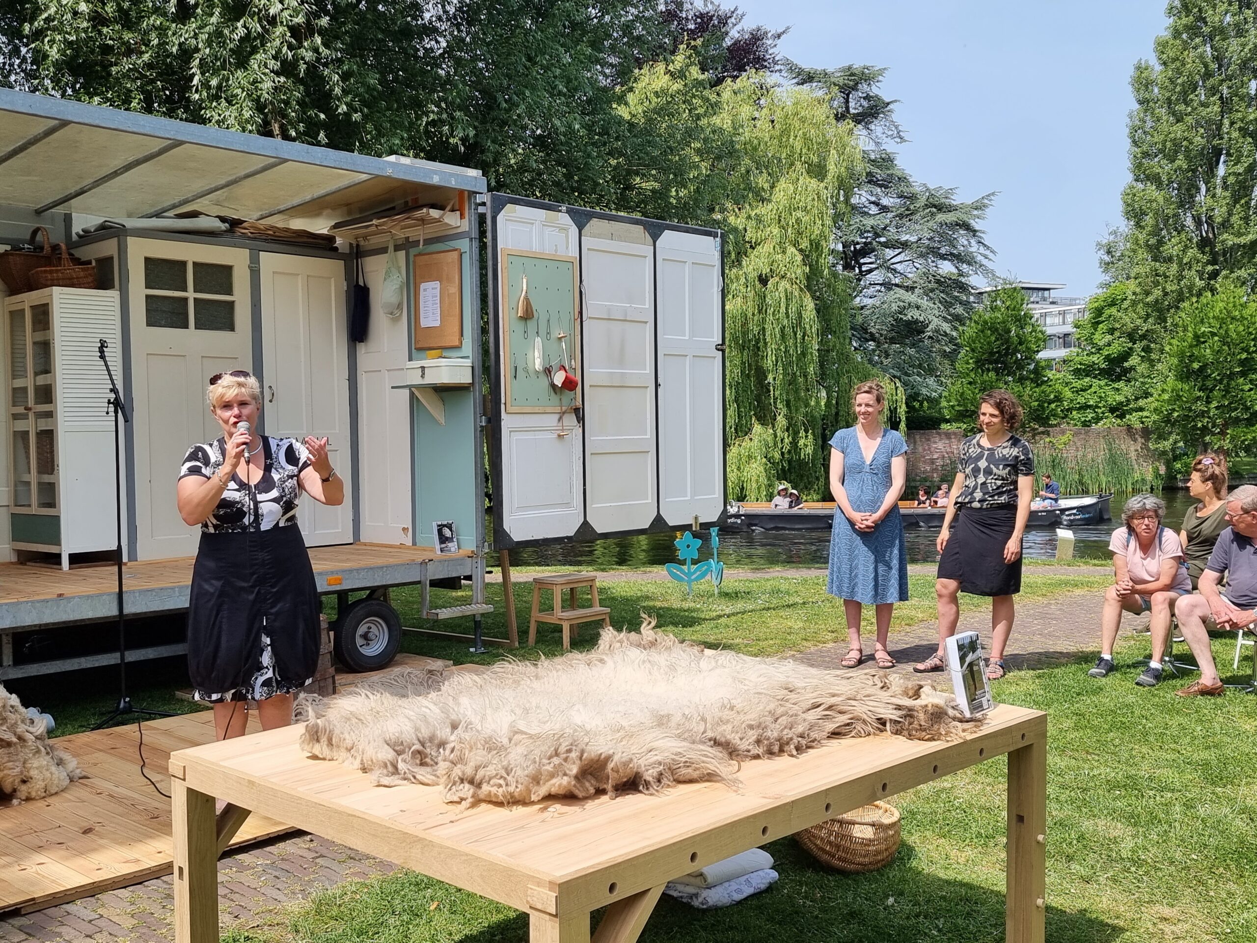 De start van het project werd gedaan door Yvonne van Delft die donderdag opnieuw is benoemd tot wethouder voor GroenLinks Leiden. Ze heeft de cultuurportefeuille gehouden en dus kon ze meteen aan de bak bij dit kunstproject. “Ik maakte me wel een beetje zorgen om de openingshandeling”, lacht ze. Daarmee uiteraard doelend op het doneren of stampen van urine. “Je weet het immers maar nooit, ze huren ons overal voor in.” Uiteindelijk viel het allemaal reuze mee en na een openingswoord kreeg ze een zakje net afgeschoren wol mee als aandenken.