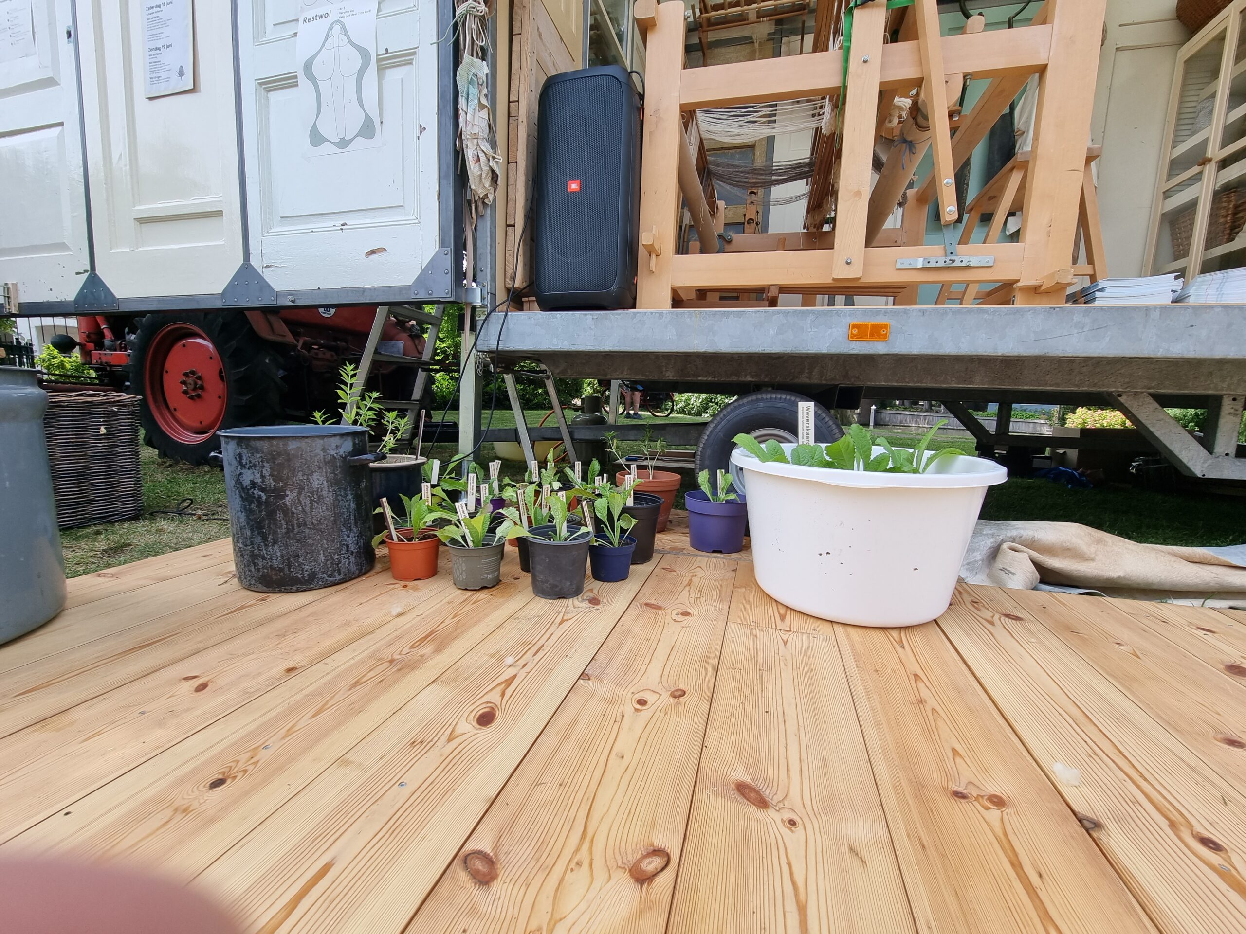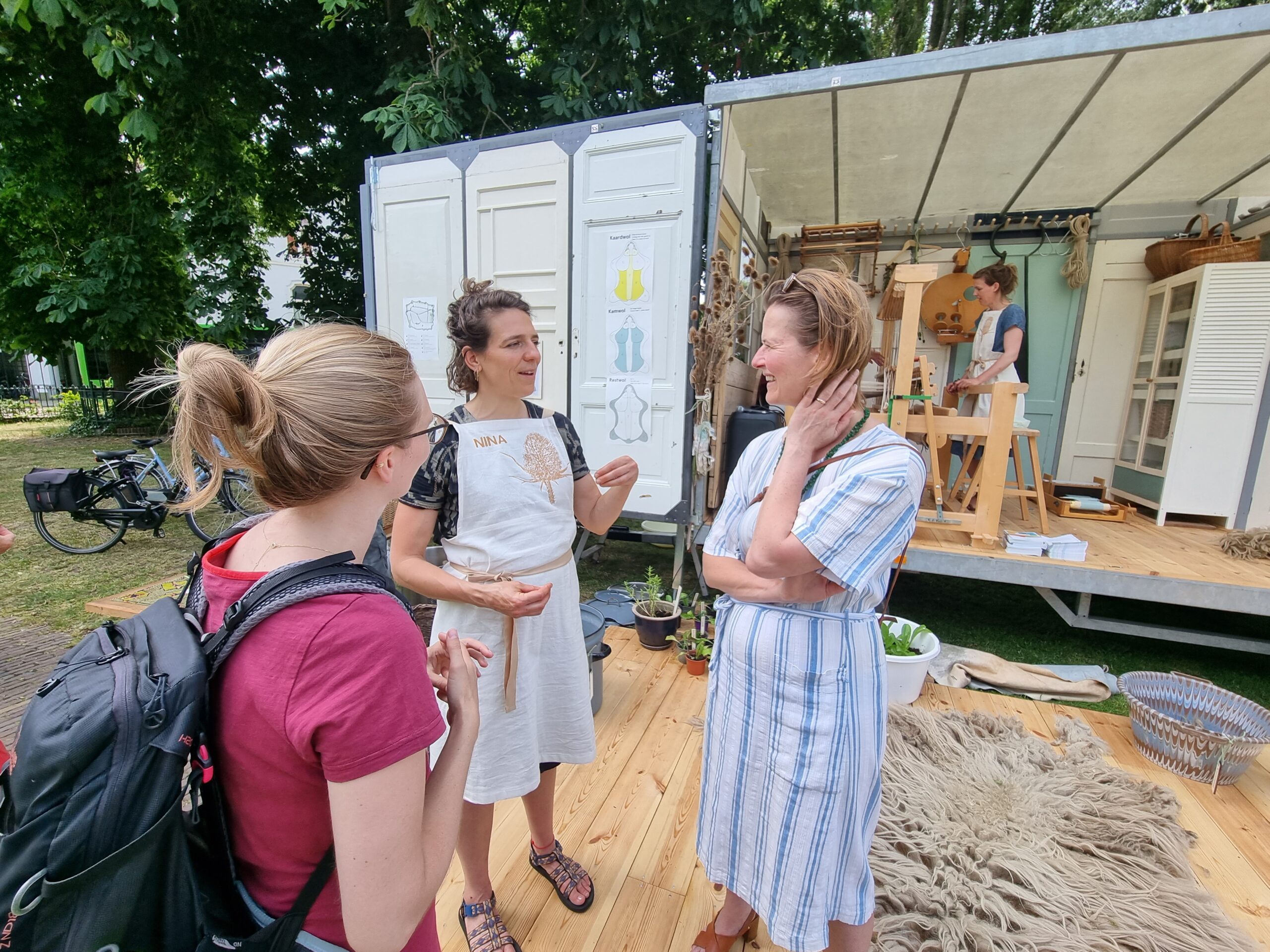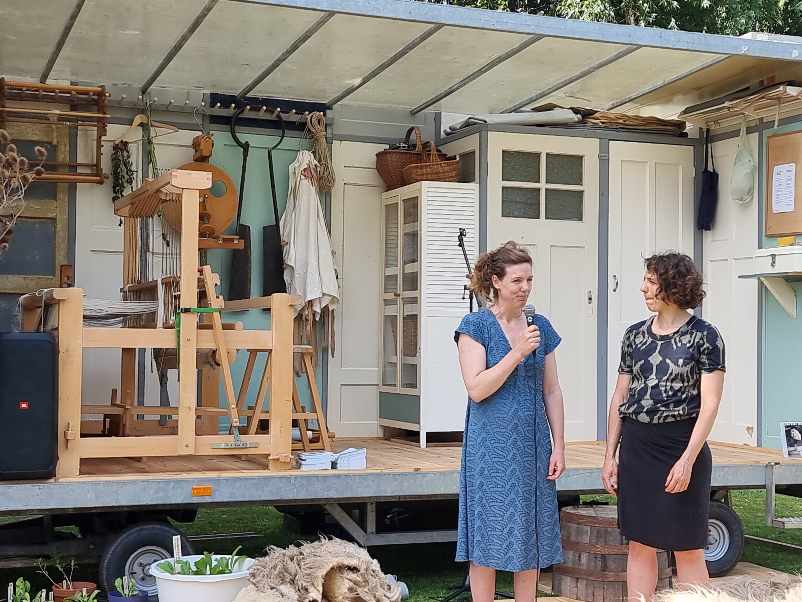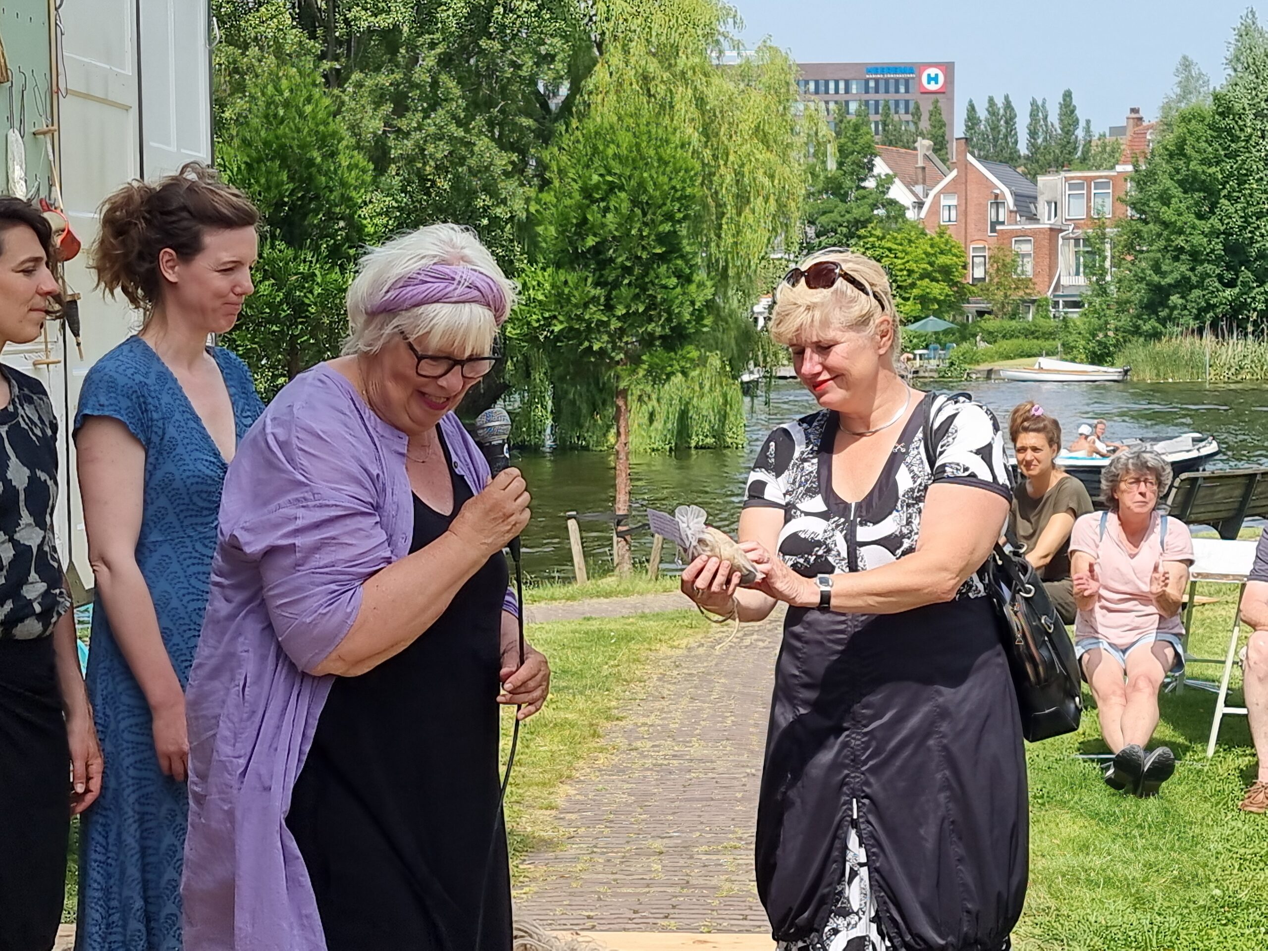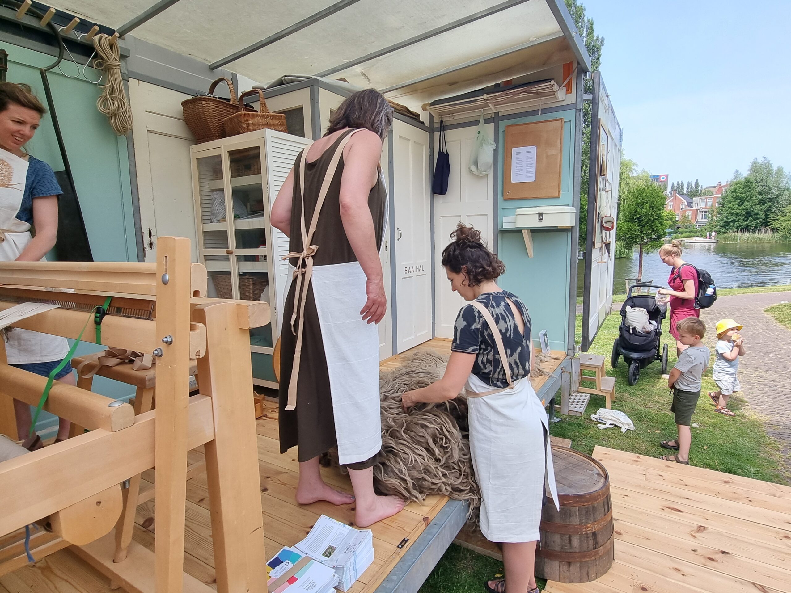 Er werd dan ook geen zesde beeld onthuld, maar de bijeenkomst in het Rembrandtpark vormde de start van een project dat de hele zomer duurt en waaraan iedereen kan meedoen. In een mobiel atelier wordt op traditionele wijze Leids Saai gemaakt. Dat is een van de wollen stoffen, iets dunner dan laken, waarmee Leiden in de 17e eeuw grote rijkdom verwierf.