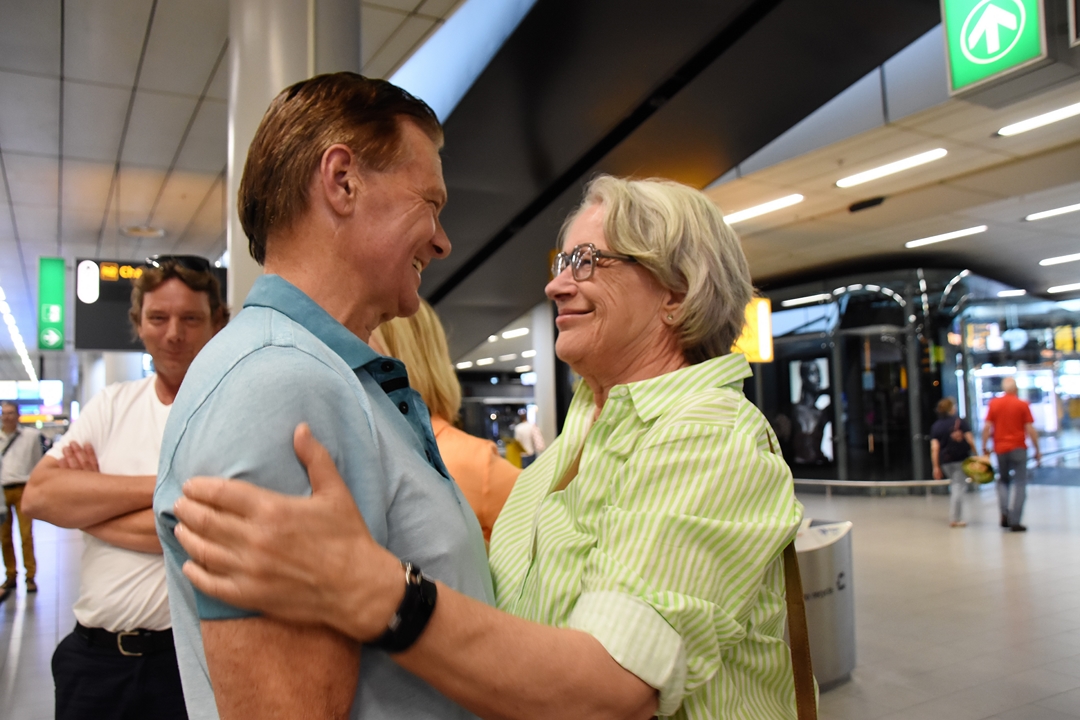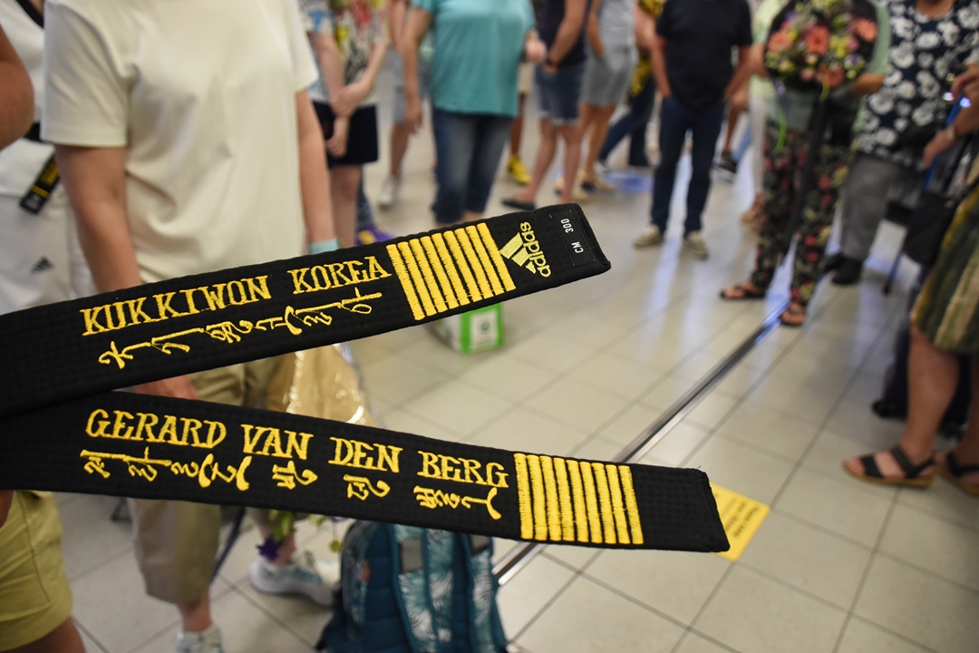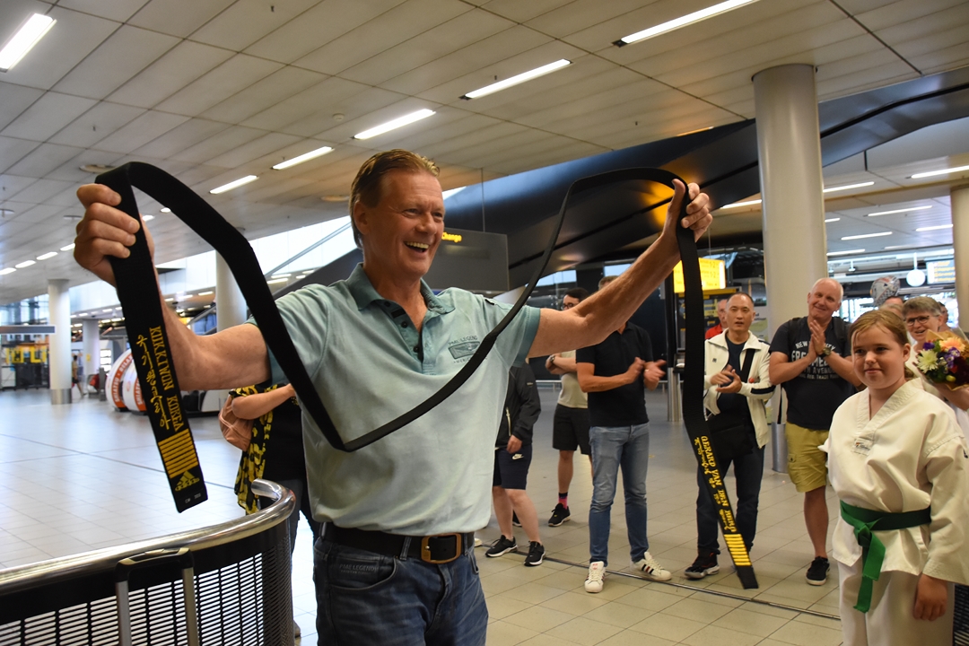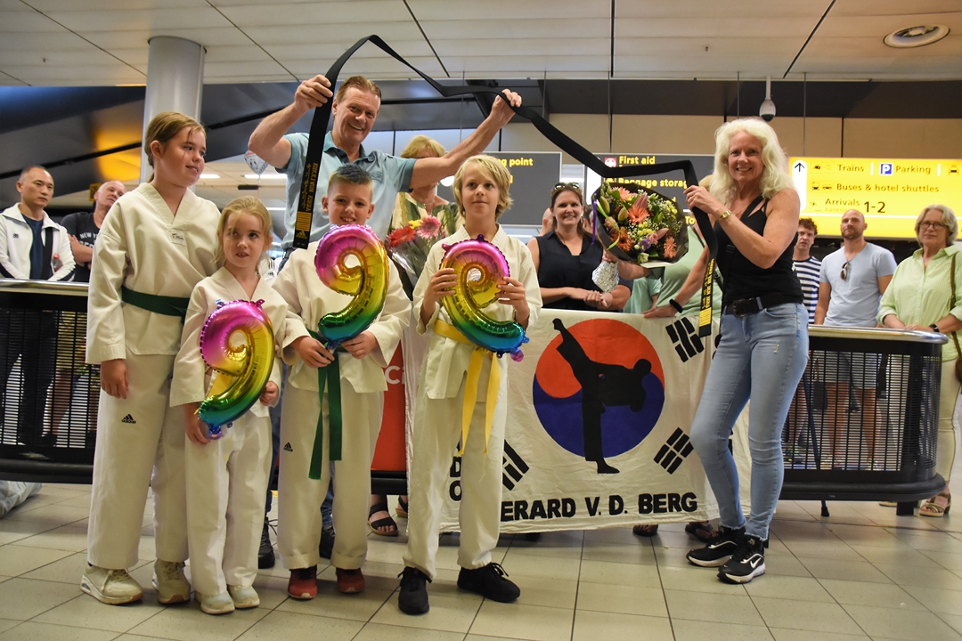 Taekwondo-grootmeester Gerard van den Berg is zaterdagavond teruggekeerd vanuit Zuid-Korea. Daar slaagde hij afgelopen week als eerste Nederlander ooit voor het 9e Dan-examen, de hoogst haalbare gradatie in deze vechtsport. Op Schiphol stonden tientallen vrienden, familieleden en leerlingen uit zijn sportschool op hem te wachten om hem onder luid applaus te ontvangen.