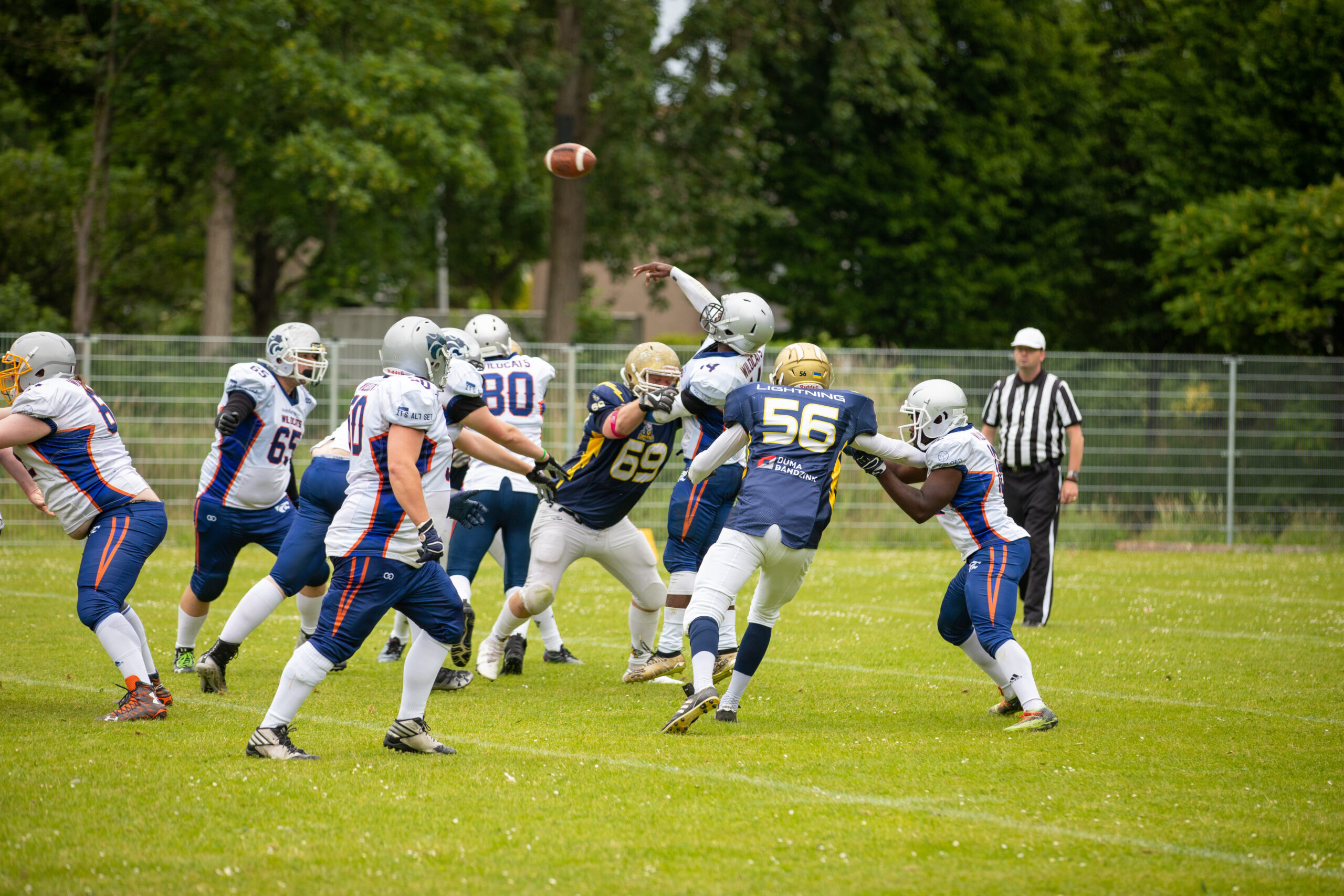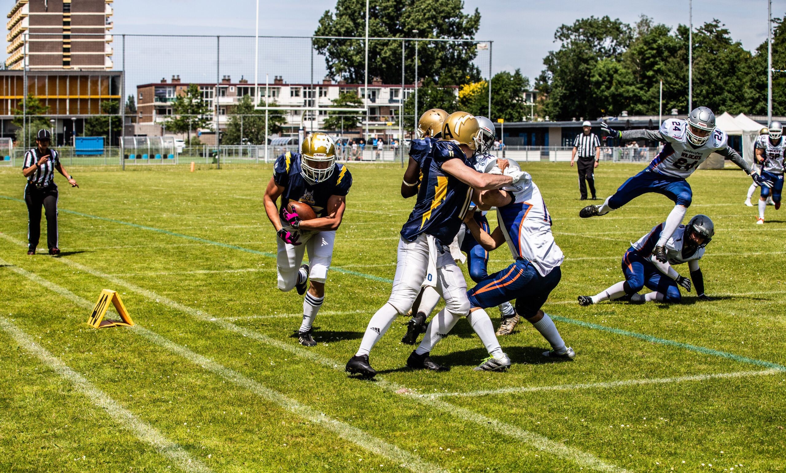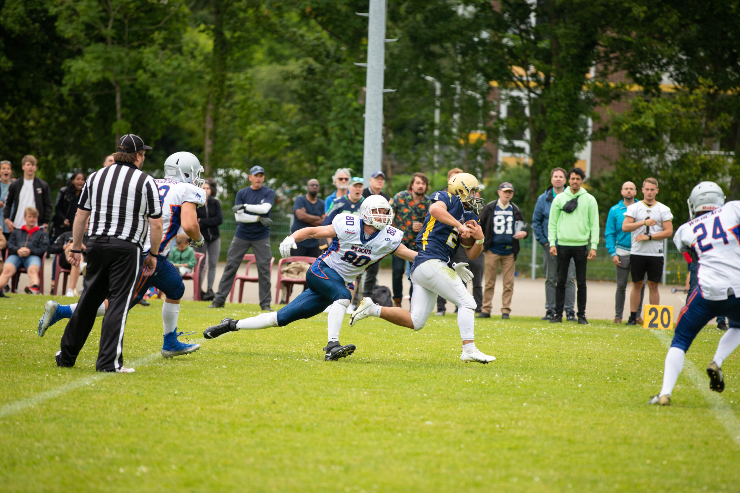 Omdat de Leidse ploeg dit seizoen nog geen wedstrijd had verloren, had niemand verwacht dat de eerste helft zo moeizaam zou gaan. Een verklaring daarvoor kon de offensive coordinator en aankomend hoofdcoach Brian Spapens wel geven. De ‘starting quarterback’ waar het hele seizoen mee werd gespeeld, was namelijk afwezig en het was aan Owen van Gorcum om deze positie tijdens de belangrijke wedstrijd in te nemen.
