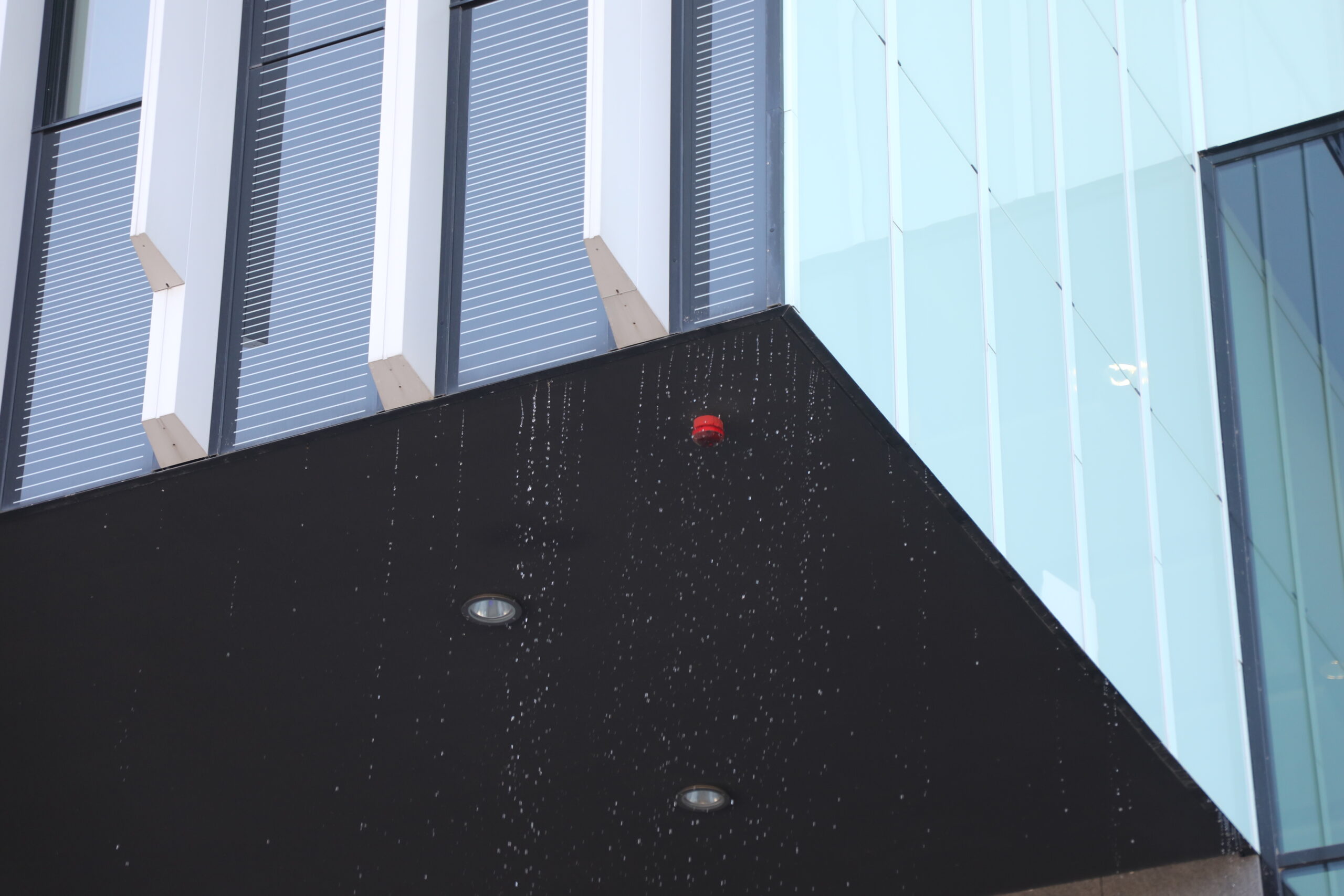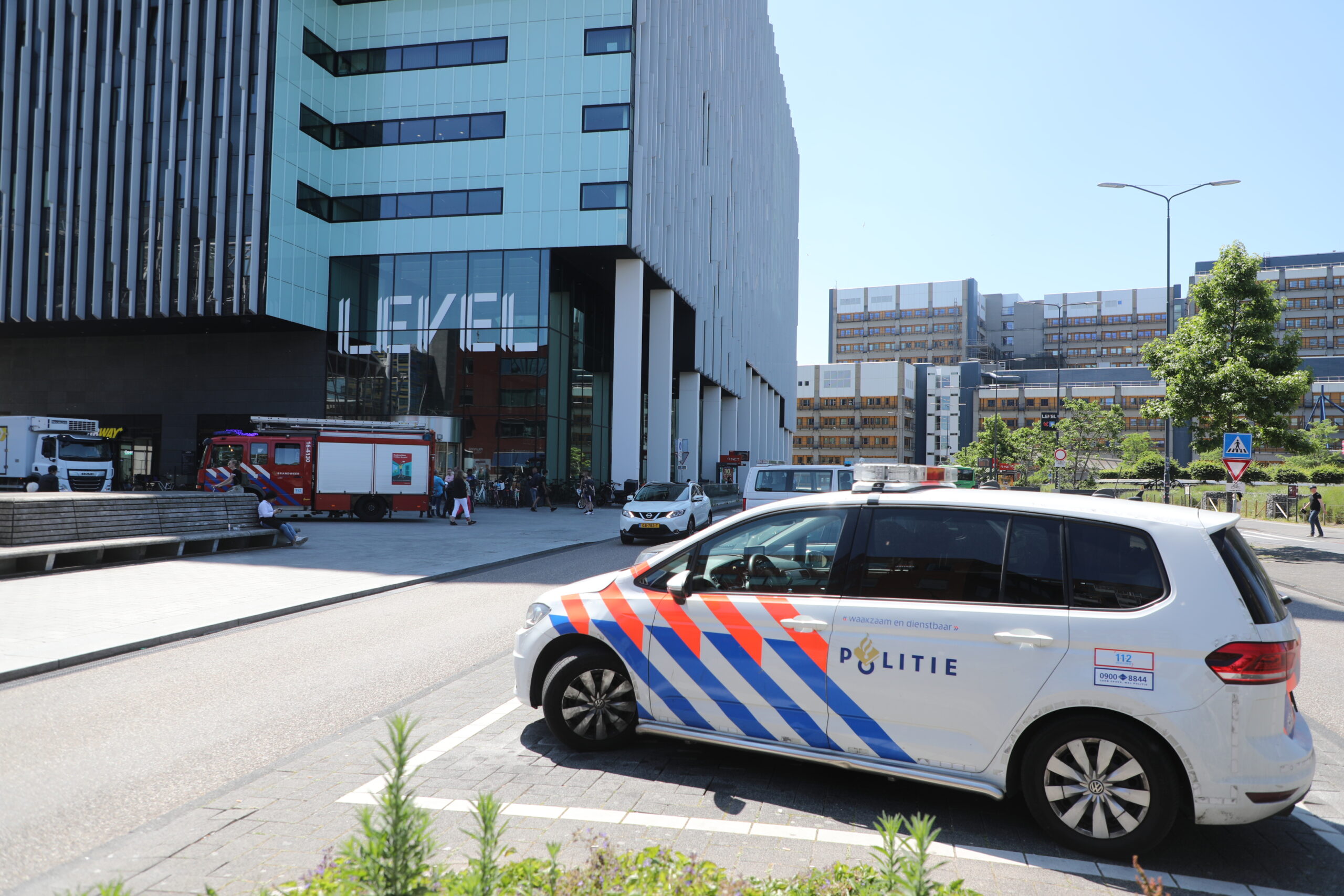 Het water stroomt naar beneden bij Level achter station Leiden Centraal. De lekkage is ontstaan op de derde etage van het stadskantoor. Het zou gaan om een gebroken leiding. Met meerdere voertuigen rukten brandweer en politie uit.