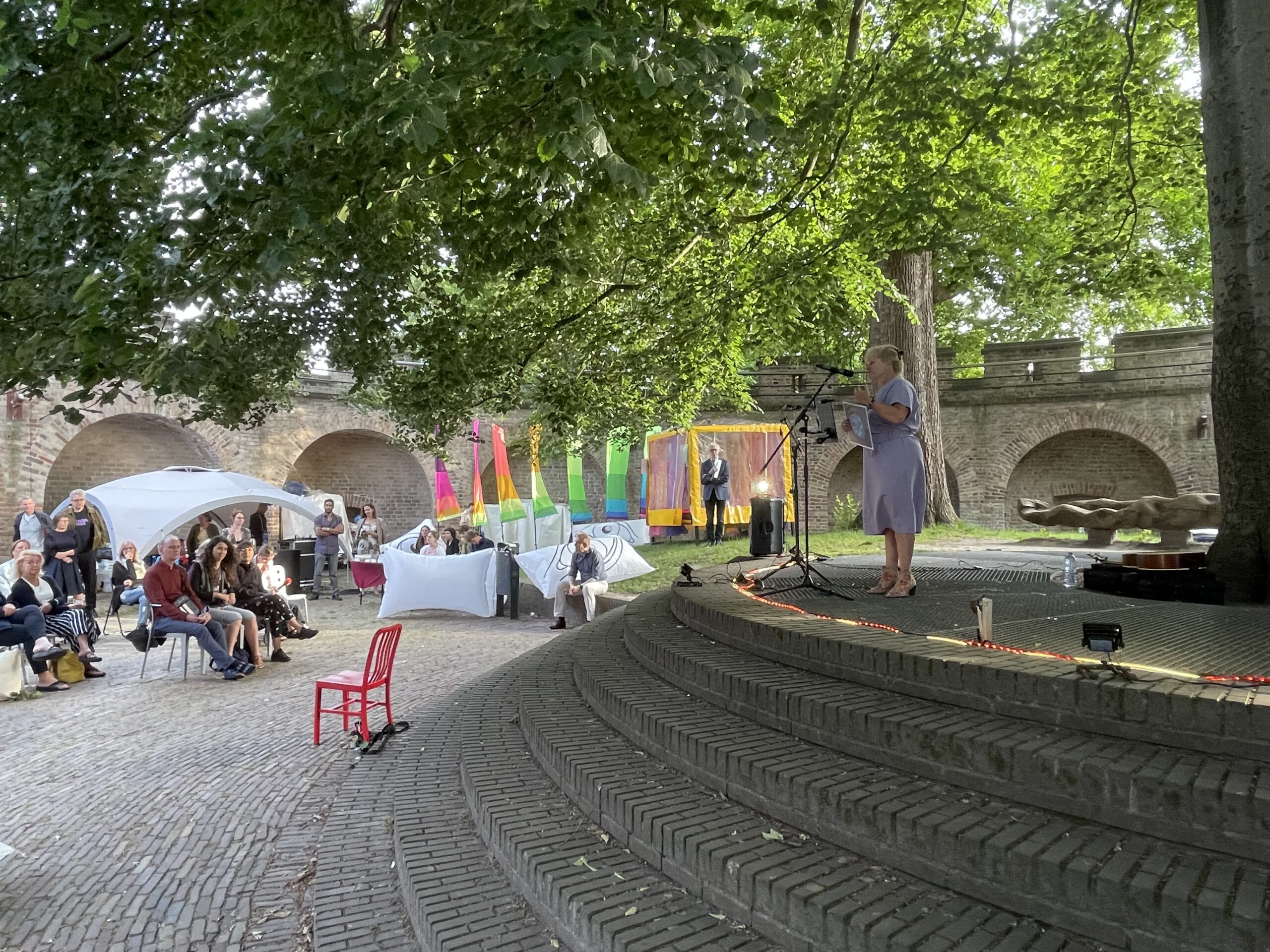 Zaterdag was een avond vol muziek en poëzie op de Leidse Burcht. Dit jaarlijkse evenement is een onderdeel van het Van Rijn Festival, georganiseerd door Fields of Wonder, stichting Leids Literair Landschap en INDEX Poetry. De presentatie was in handen van Han Ruijgrok en Christiaan van Minnen. De avond was extra feestelijk door de jubileumviering van zowel het Van Rijn Festival dat vijf jaar bestaat, als Fields of Wonder dat haar twintigjarige bestaan viert.