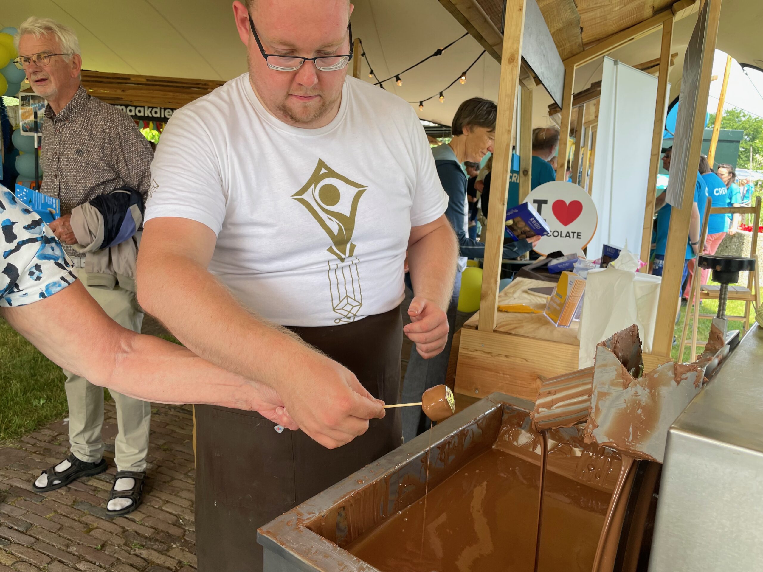 Alle facetten van het werk van de DZB kwamen aan bod. Er was natuurlijk chocola. Bonbons en een grote bak om fruit en spekkies in te dopen. Wat natuurlijk af en toe wat geknoei opleverde. Verder supergezonde groentesapjes die ook echt lekker werden gevonden. Onder andere door burgemeester Henri Lenferink. Hij verrichte de openingshandeling door samen met Ter Woerds de planten die ‘DZB 50’ vormen een flink plens water uit een gouden gieter te geven.
