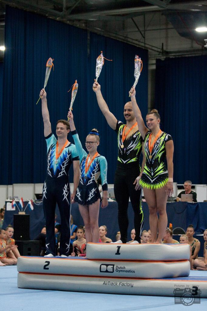 Voor het NK moest het duo zich kwalificeren en een bepaald aantal punten halen. “Er waren maar twee duo’s die die score gehaald hadden”, weet Arthur Haasbroek, de voorzitter van Gymsport Leiden. Toch was het duo van tevoren behoorlijk zenuwachtig. “Gelukkig ging het eerste element direct beter dan we hadden verwacht”, herinnert Bordewijk zich. “Daardoor kwamen we er direct lekker in.”