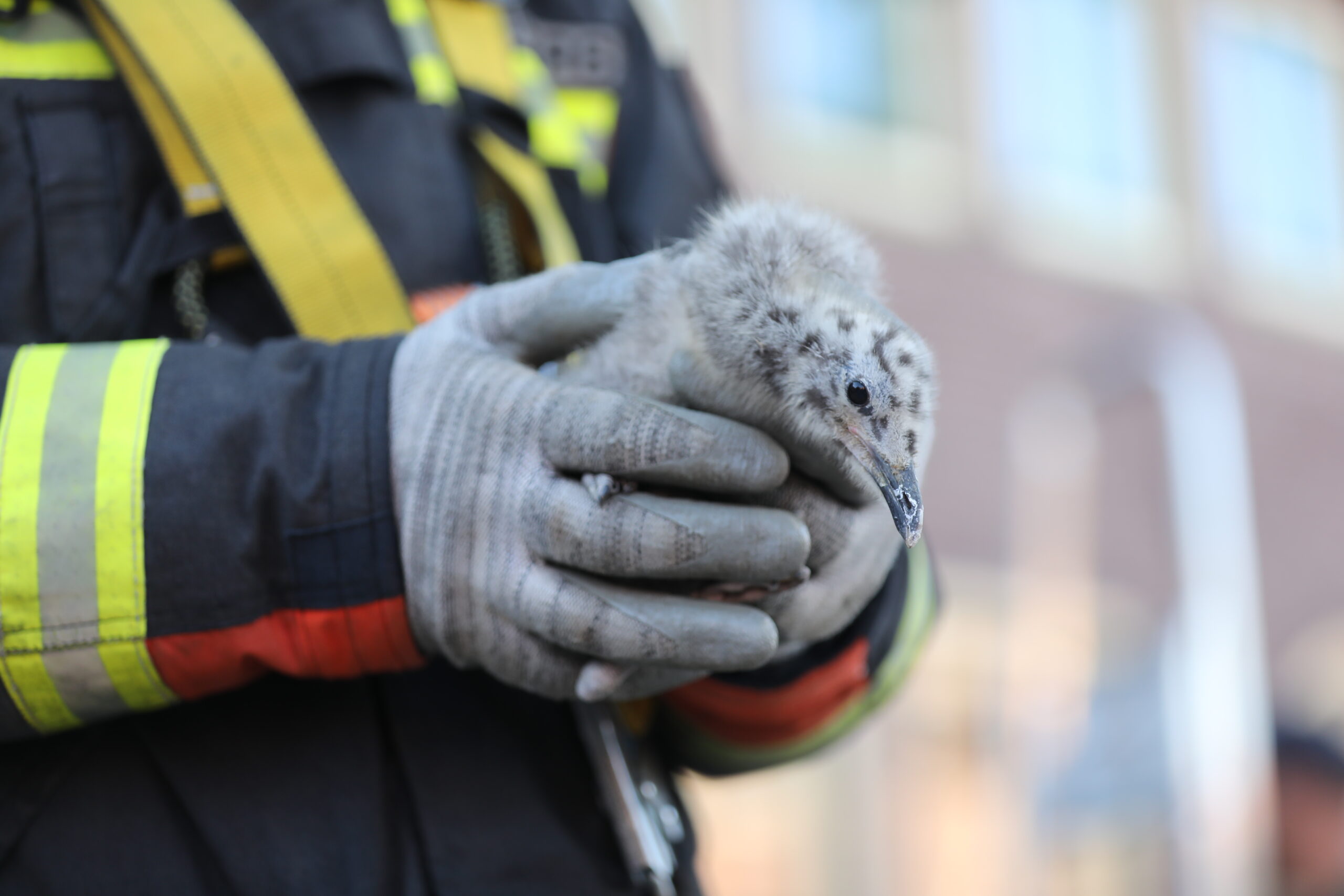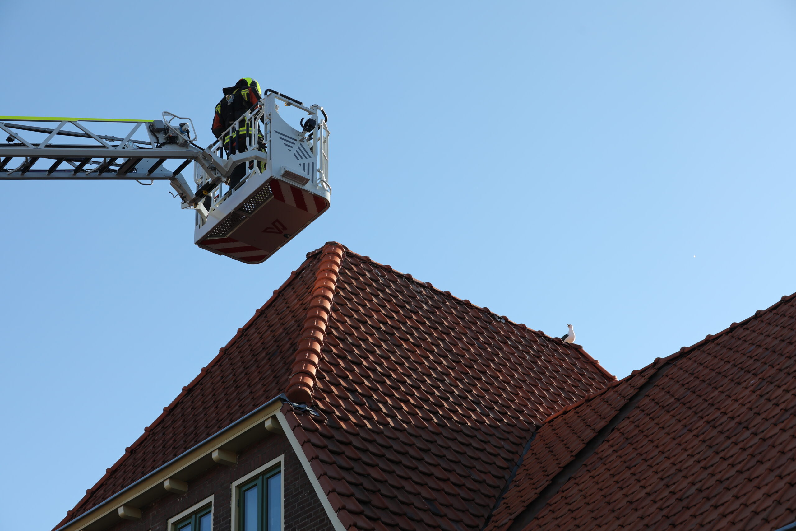 Het meeuwenkuiken was uit het nest gevallen en in de dakgoot terecht gekomen. Daar heeft een brandweerman het pluizige bolletje uitgevist met behulp van een door de bewoner beschikbaar gestelde ladder. Daarna in het dier met behulp van de ladderwagen weer met de ouders herenigd.