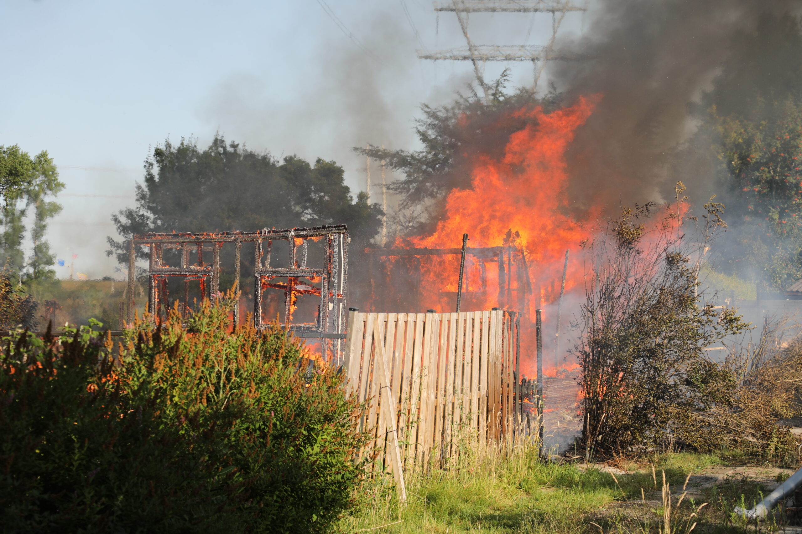 De brand op de camping die op de grens van Leiderdorp en Oud Ade ligt, woedt onder de hoogspanningsmasten ter plaatse. De brandweer heeft opgeschaald naar ‘middelbrand’ omdat men moeite had om aan voldoende bluswater te komen.