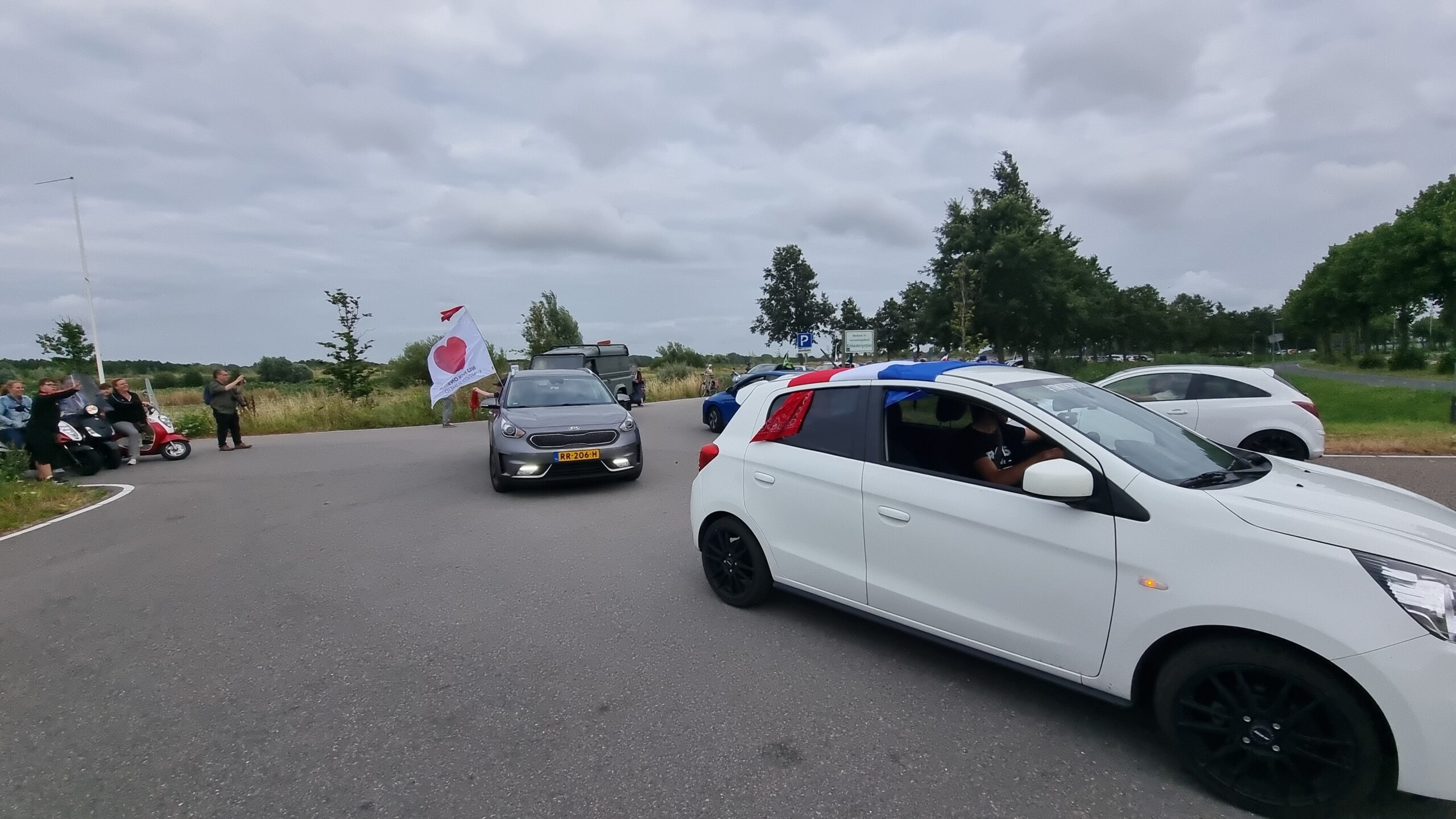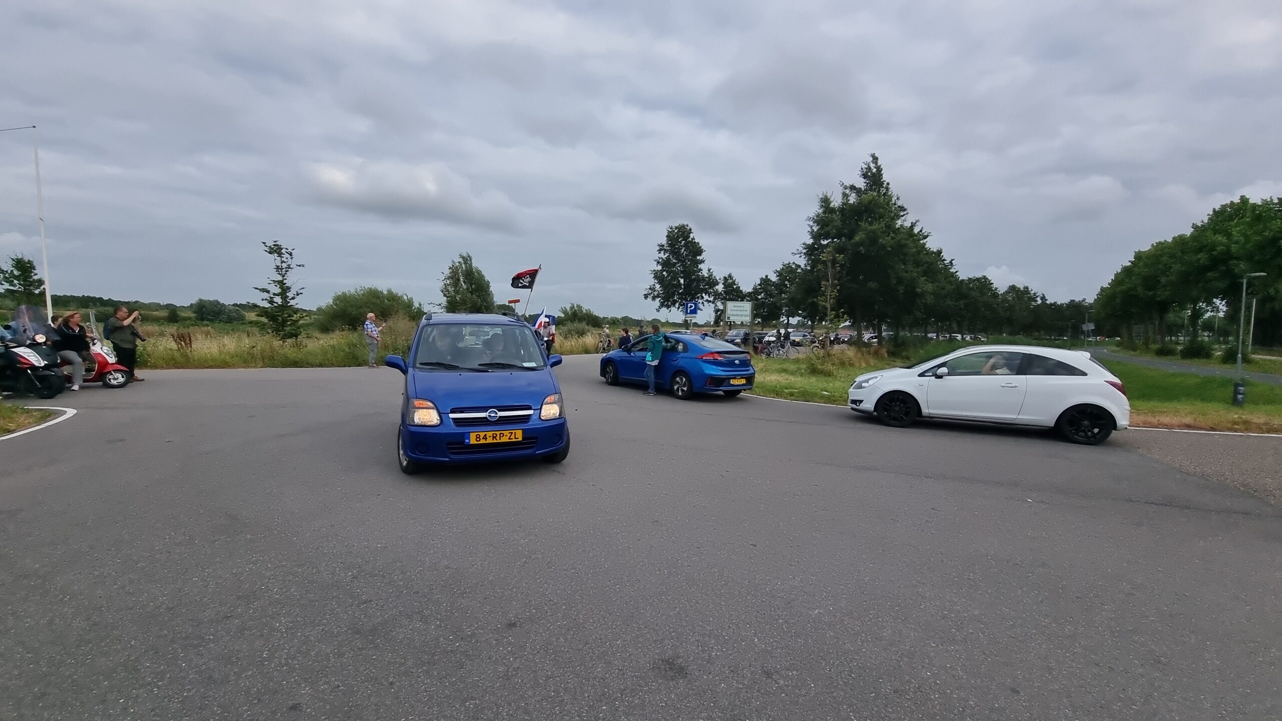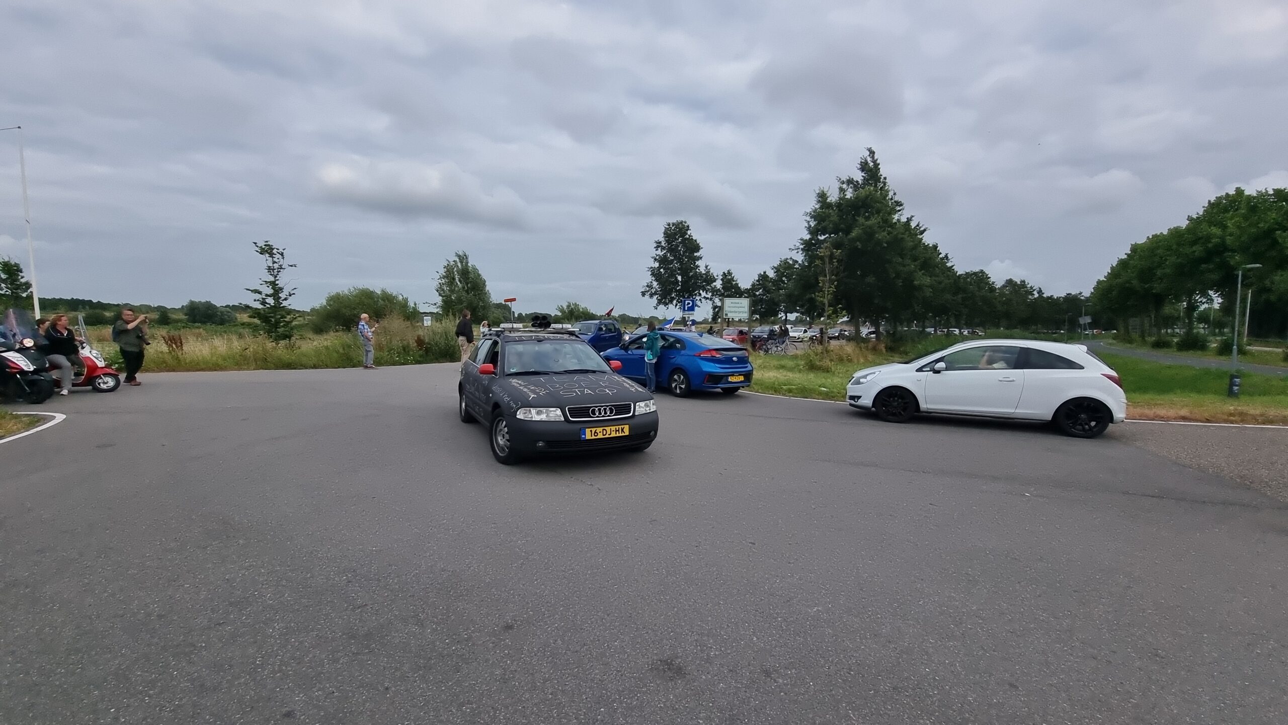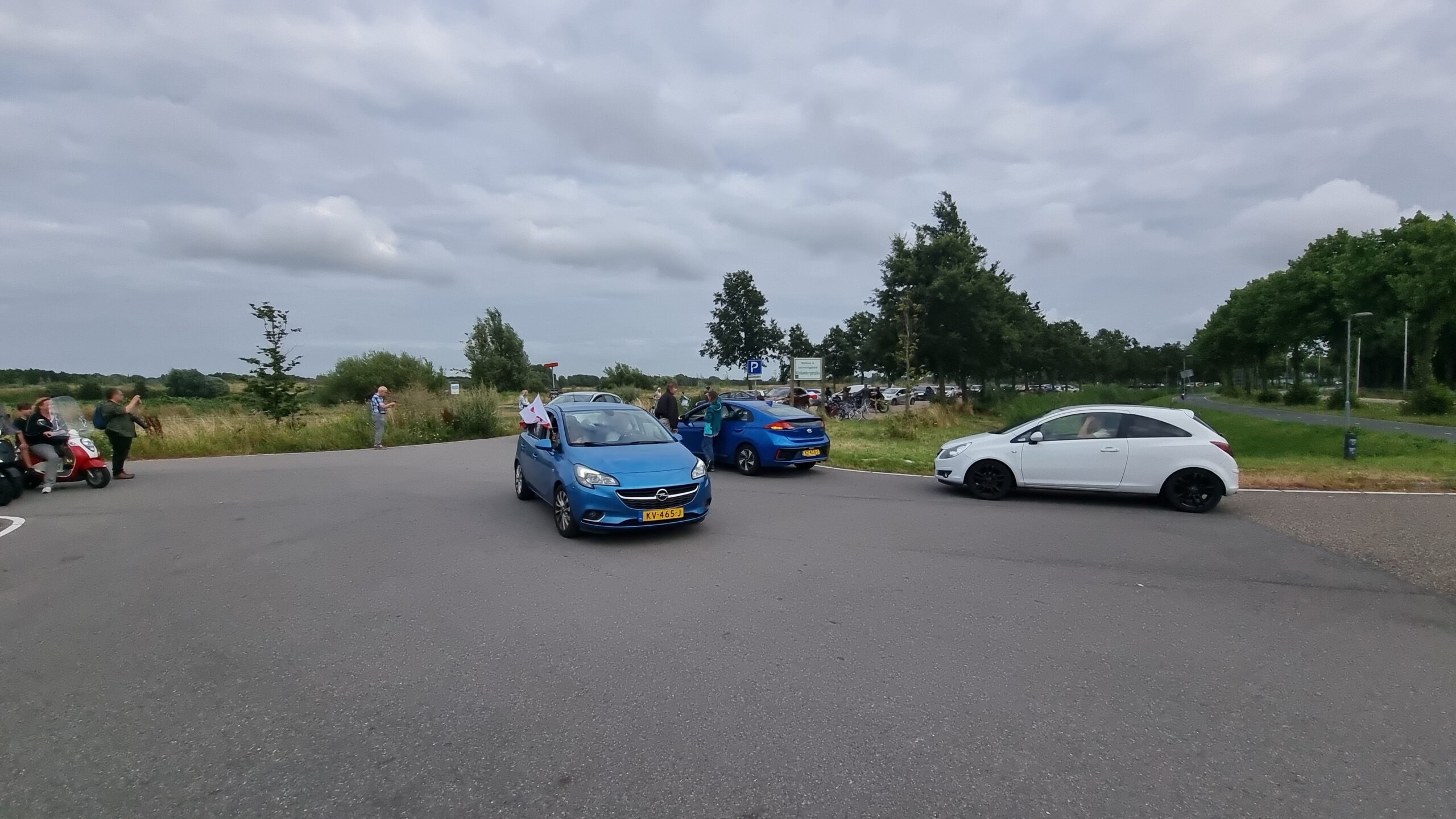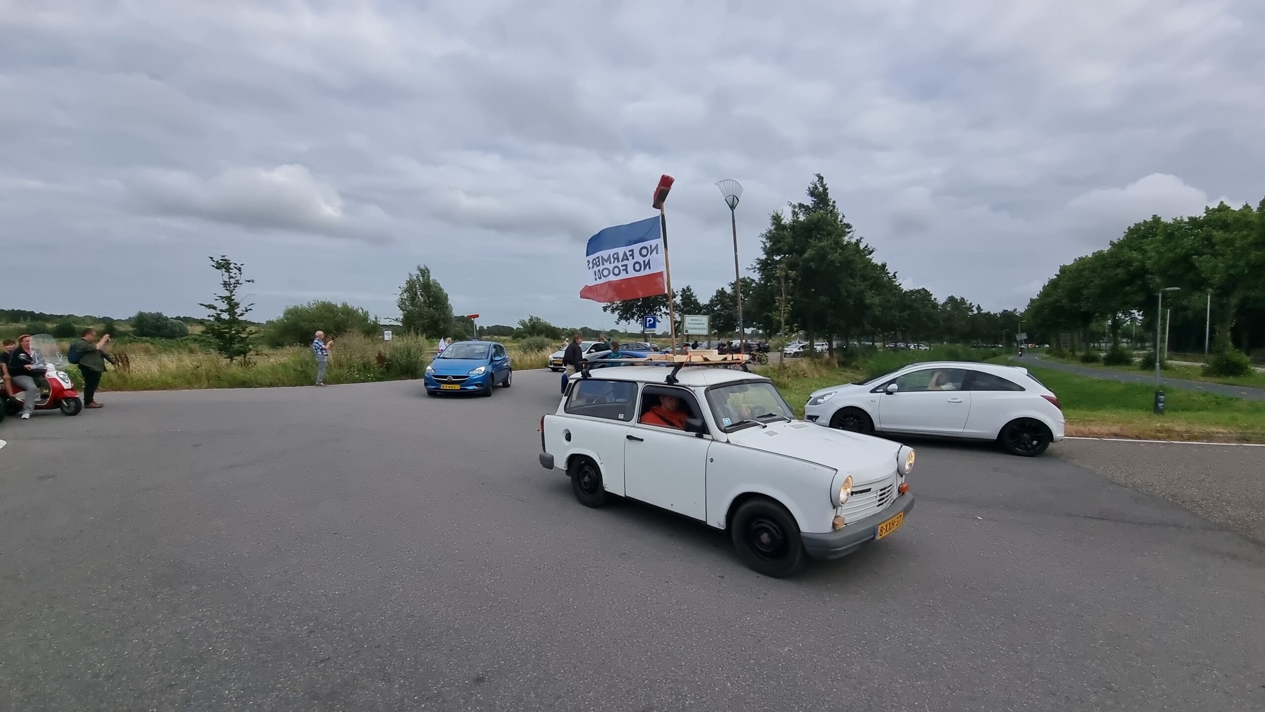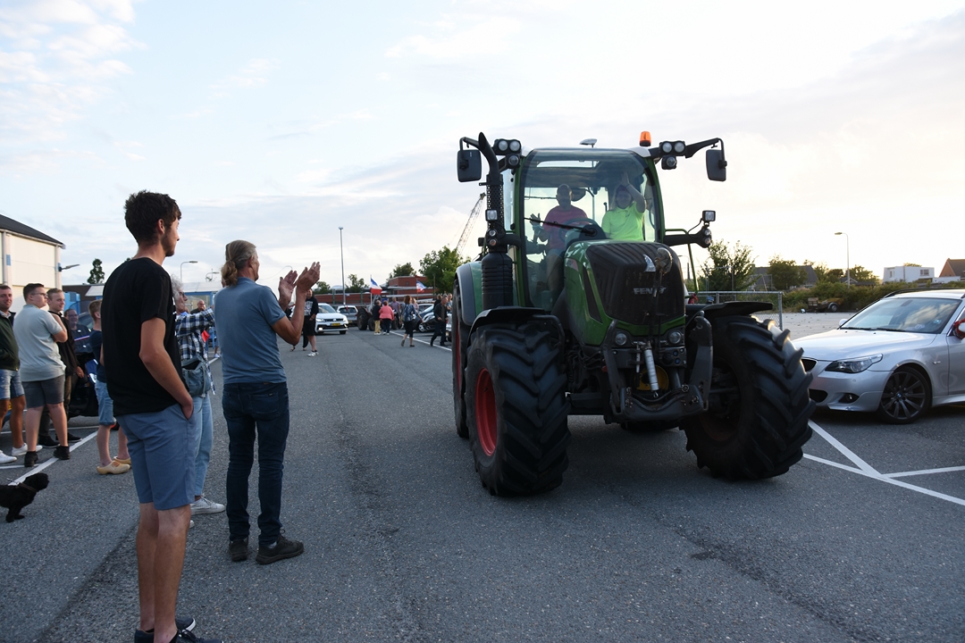 Bij de Klinkenbergerplas in Oegstgeest verzamelden zich maandag aan het begin van de avond enkele tientallen demonstranten die met hun actie de boeren een hart onder de riem wilden steken. “Maar ook de vissers en tuinders”, zegt een vrouw die uit een auto met omgekeerde vlag stapt. “En de bollenboeren, want dat zijn de volgende.”