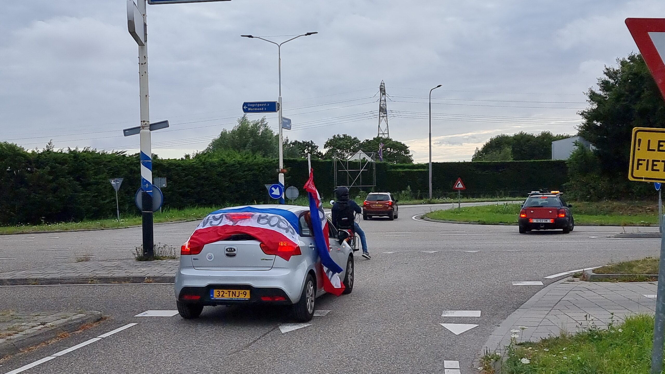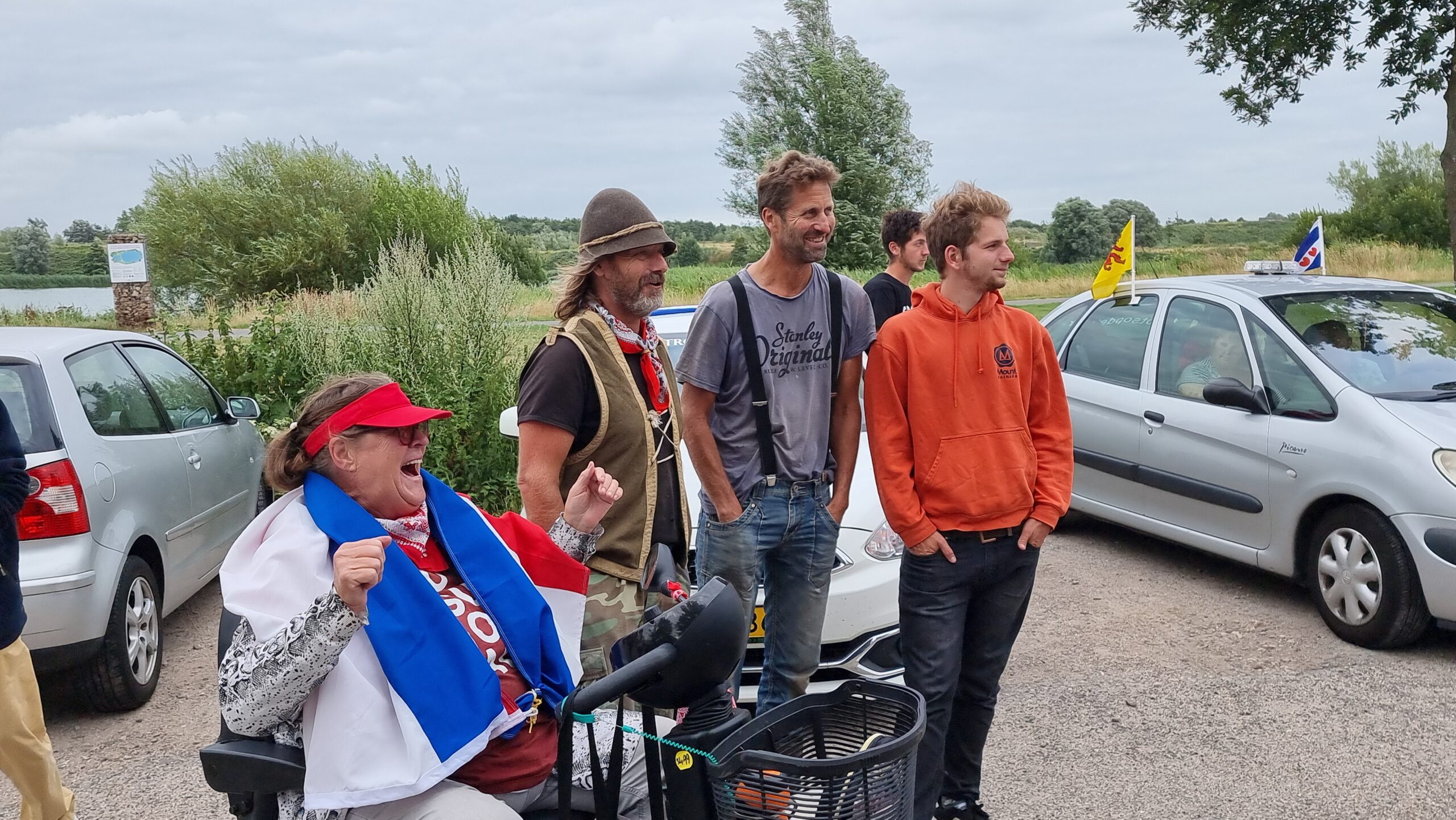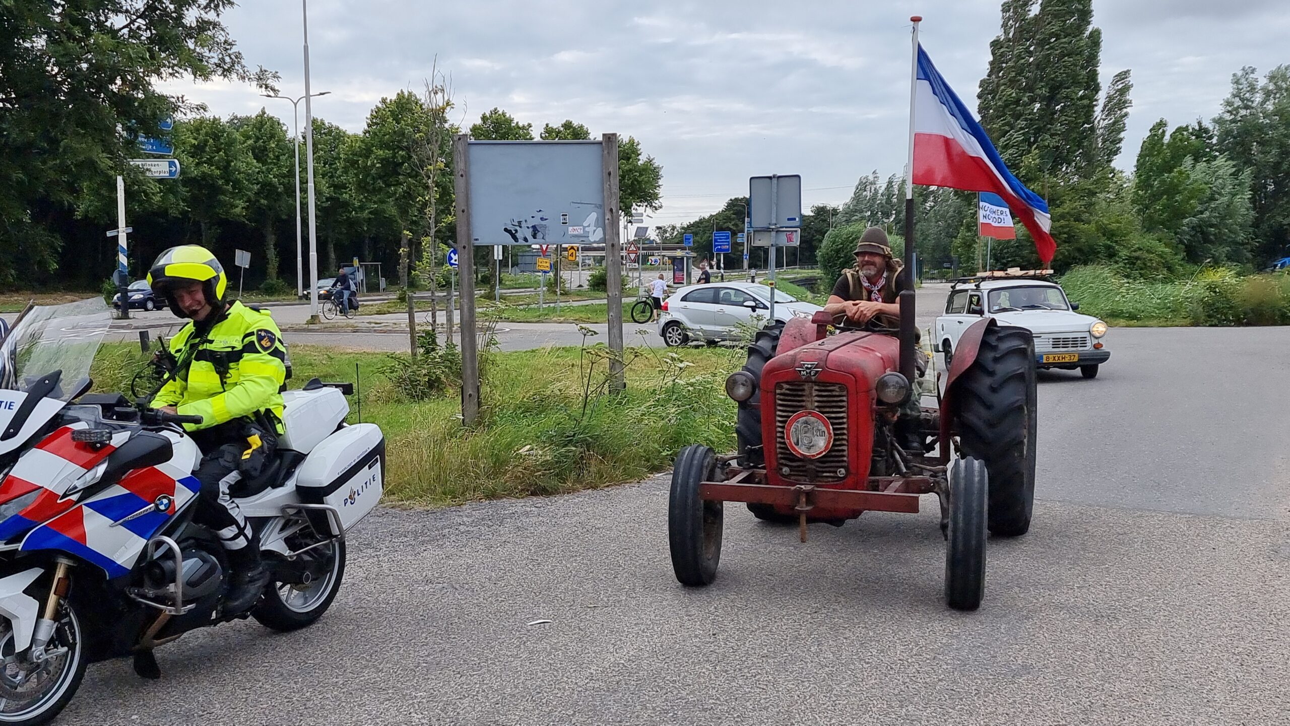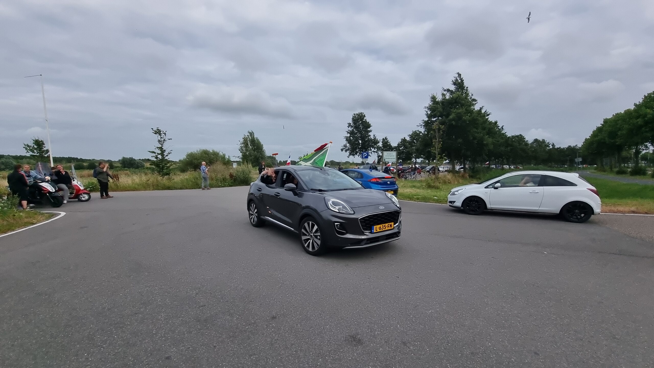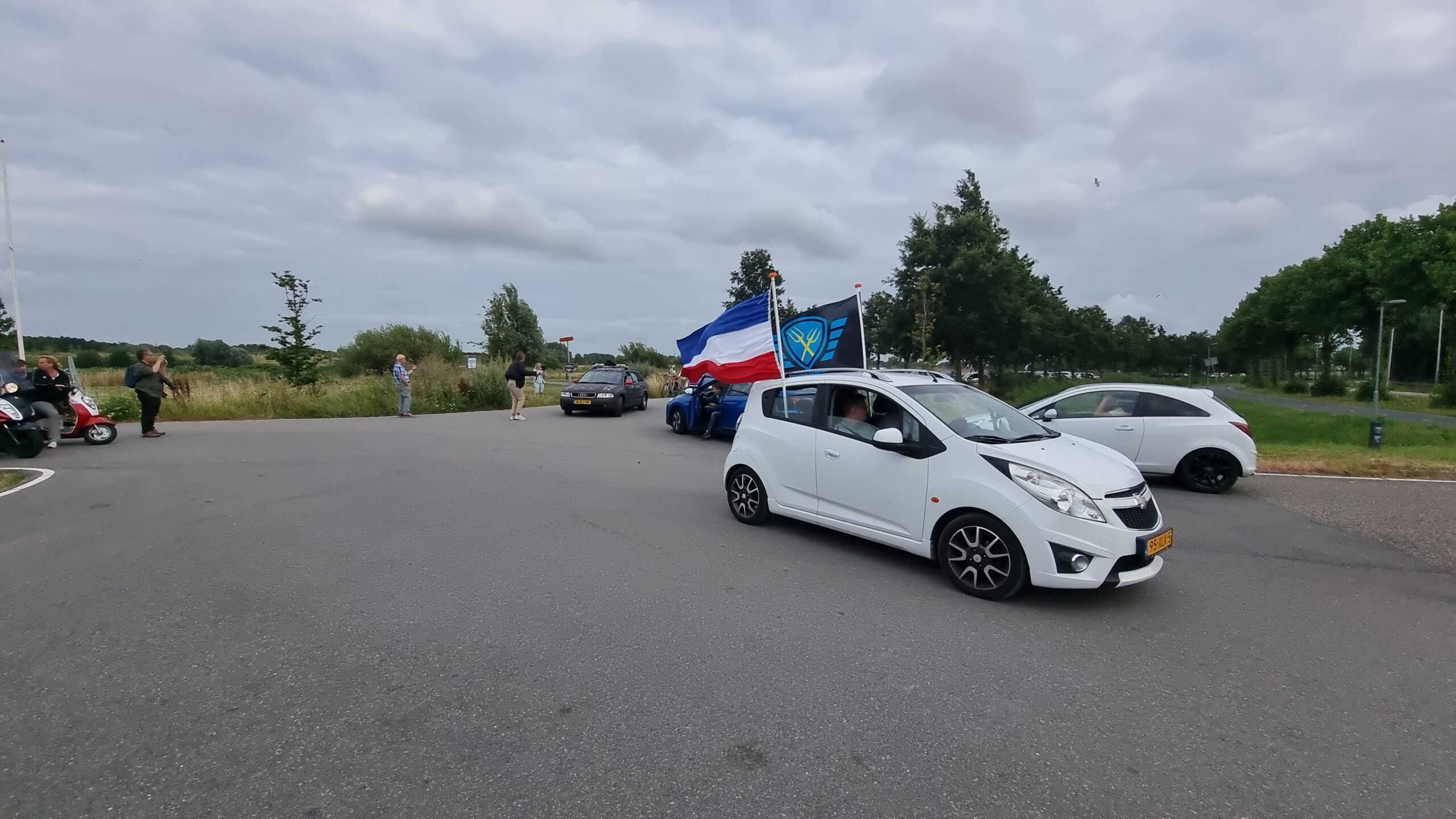 Bij de Klinkenbergerplas in Oegstgeest verzamelden zich maandag aan het begin van de avond enkele tientallen demonstranten die met hun actie de boeren een hart onder de riem wilden steken. “Maar ook de vissers en tuinders”, zegt een vrouw die uit een auto met omgekeerde vlag stapt. “En de bollenboeren, want dat zijn de volgende.”