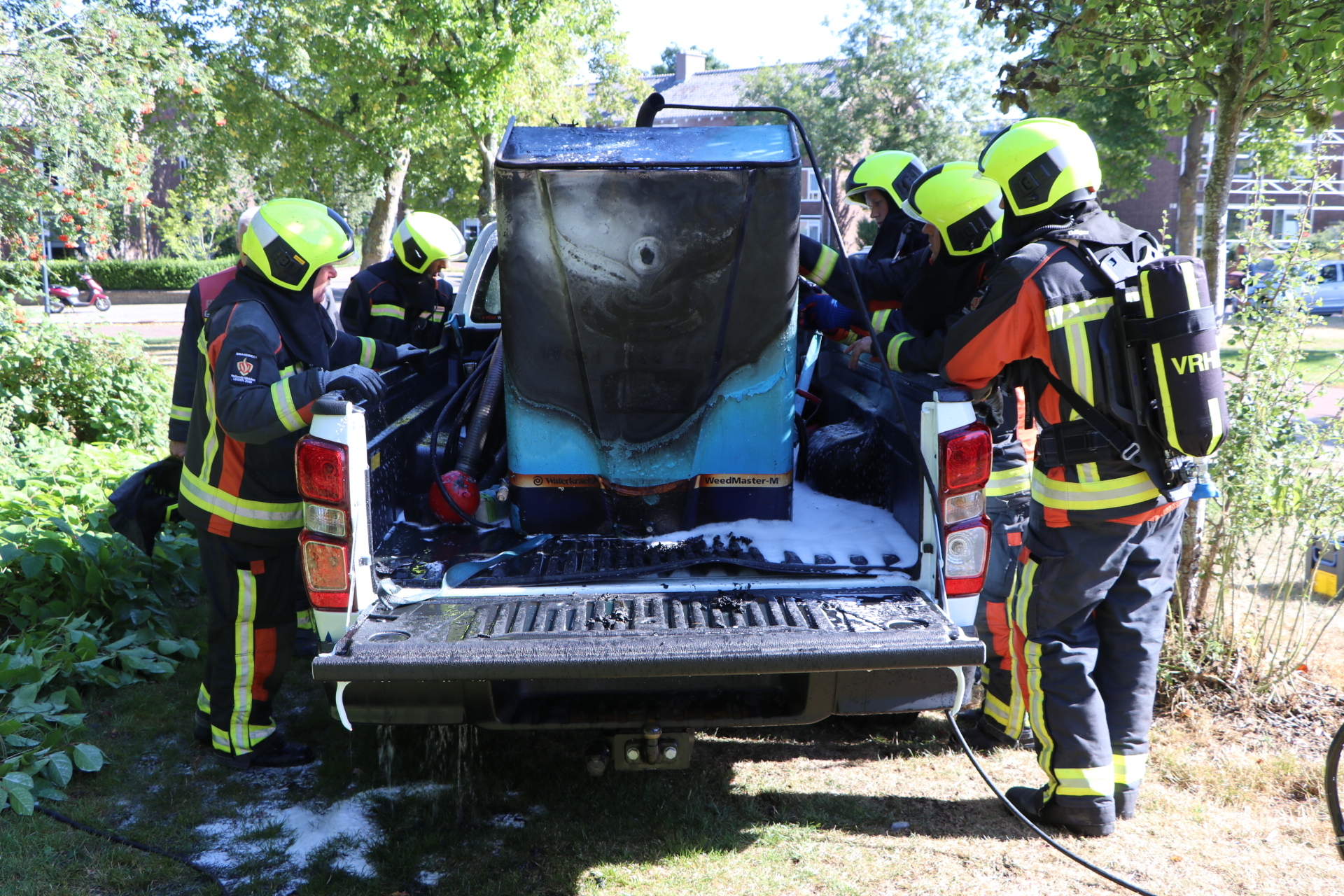 Op de Melchior Treublaan in Leiden is woensdagochtend rond 10.00 uur brand ontstaan in de laadbak van een pick-uptruck. Tijdens het bijvullen van de brandstoftank van een sproei-installatie in de laadbak lekte diesel op een heet element van het motortje met een steekvlam als gevolg.