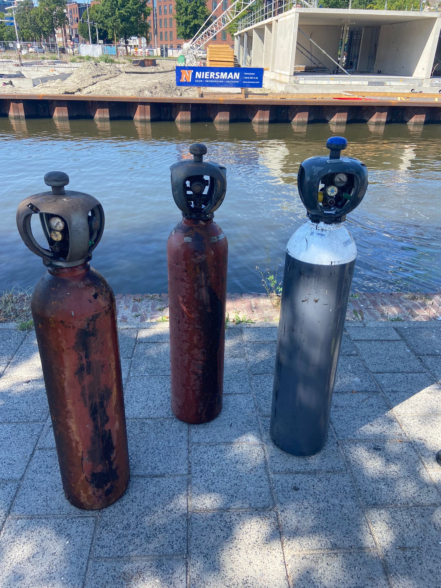 De flessen zijn door de brandweer uit het water gehaald en door de gemeente afgevoerd. Volgens een woordvoerder van de brandweer zijn de drie gasflessen tijdens werkzaamheden in het water gegleden, meldt mediapartner Omroep West.