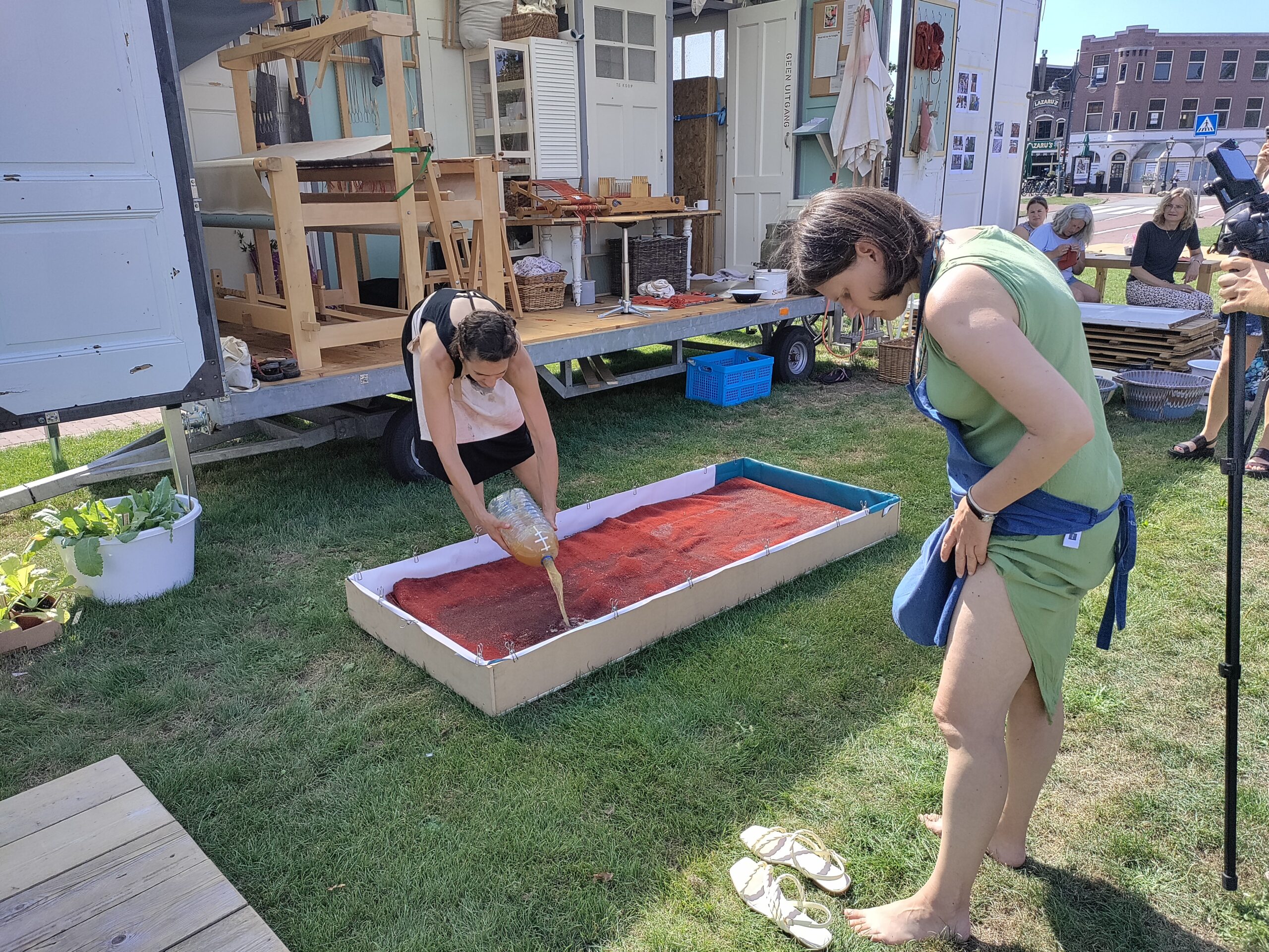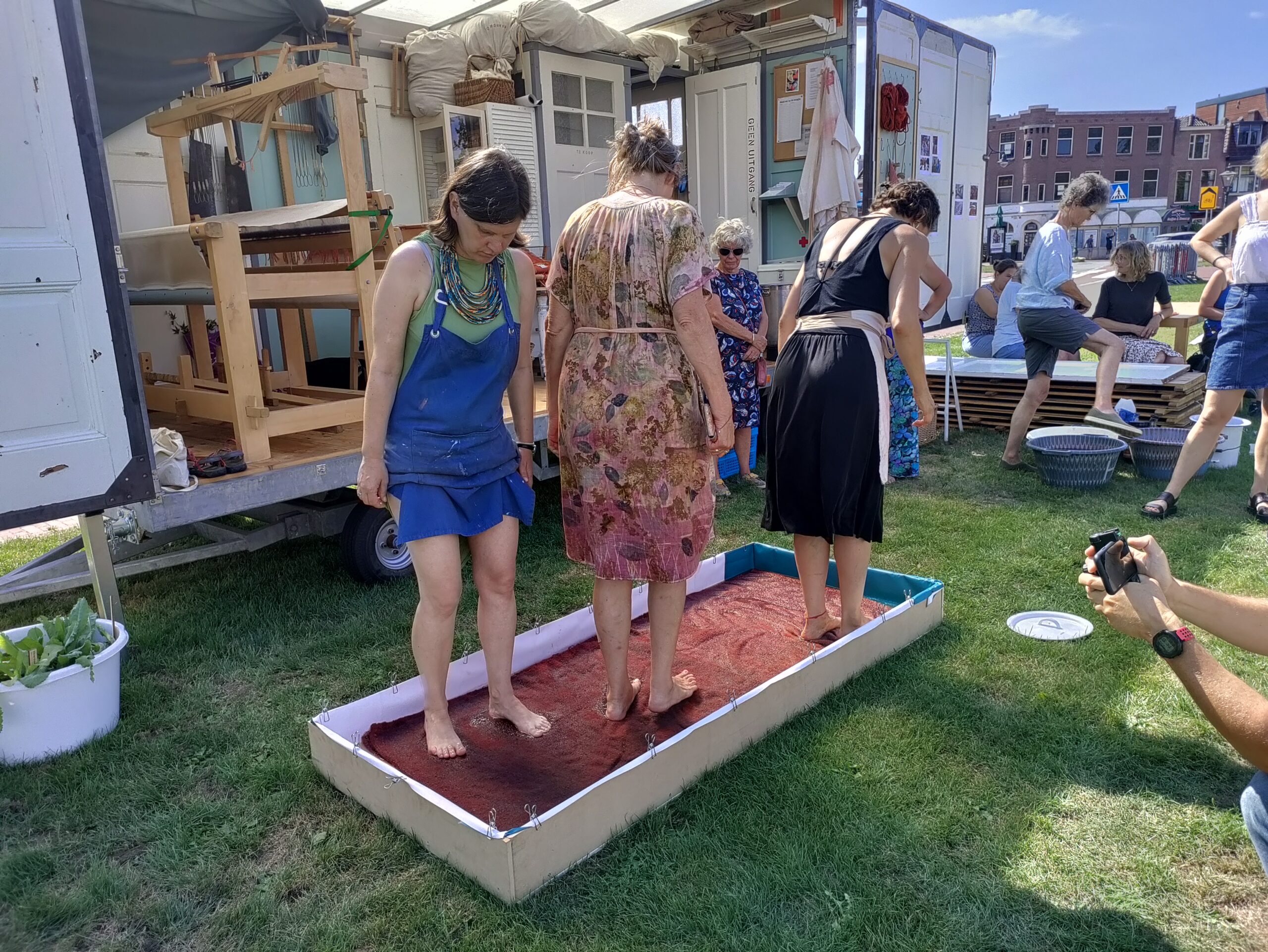 Het participatiekunstwerk ‘Van kade tot zelfkant’ van kunstenaars Nina Mathijssen en Sara Vrugt is gisteren een nieuwe fase ingegaan. De kunstenaars maken, samen met inwoners van Leiden, het historische Leidse textiel ‘saai’. Woensdag is de wol op authentieke wijze, met boter en urine, bewerkt.