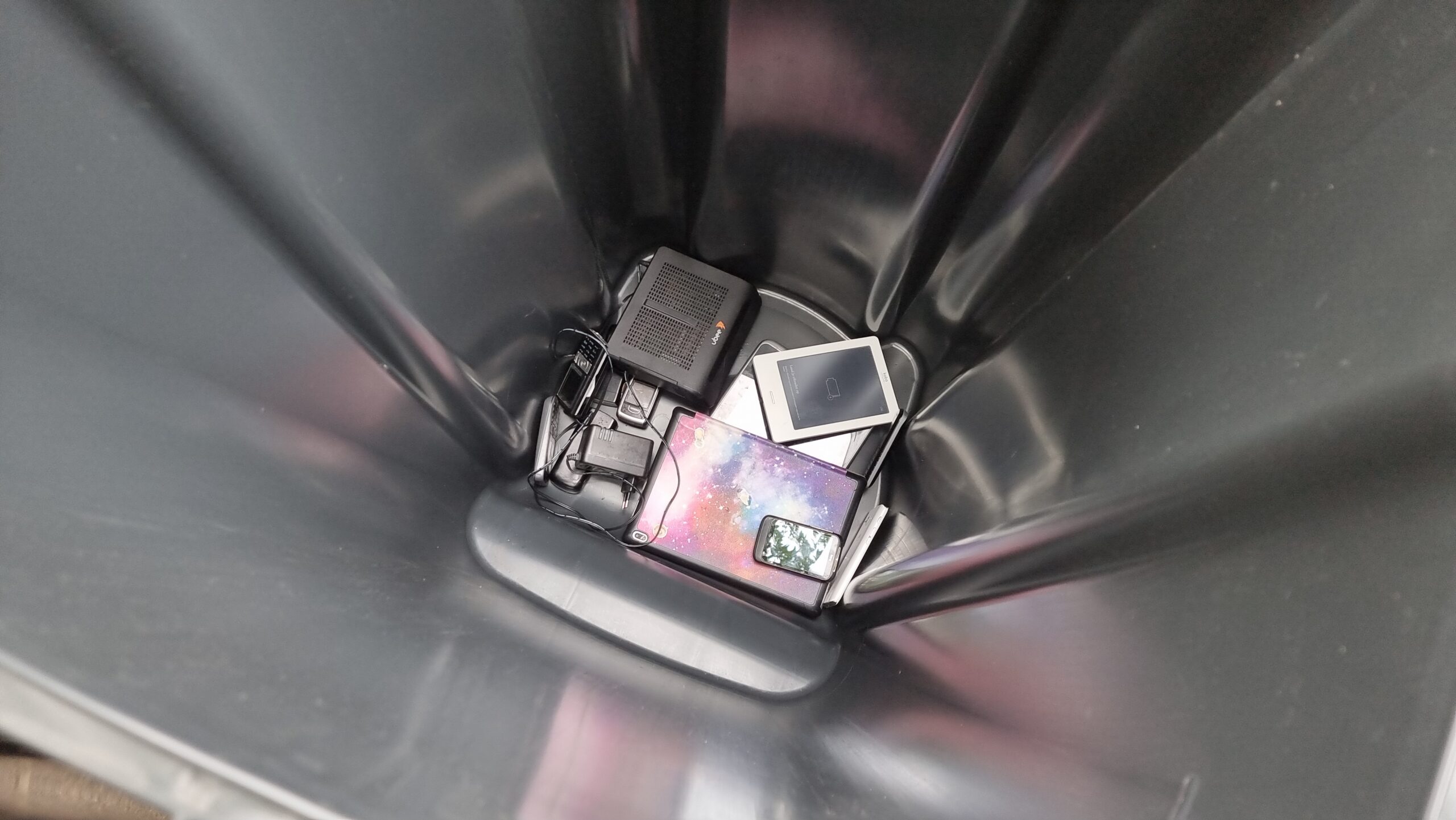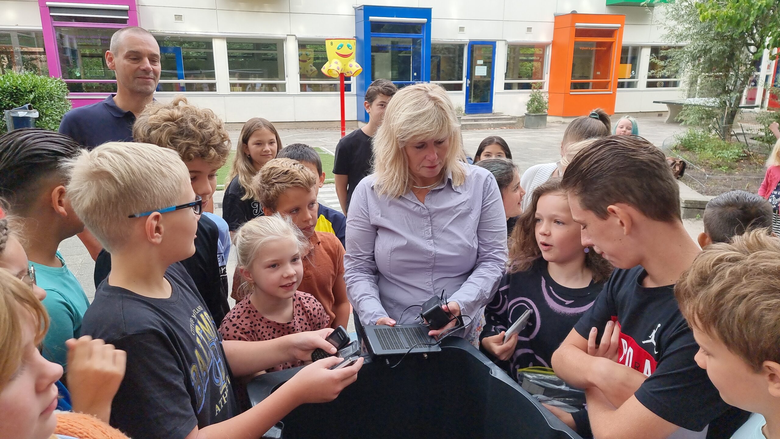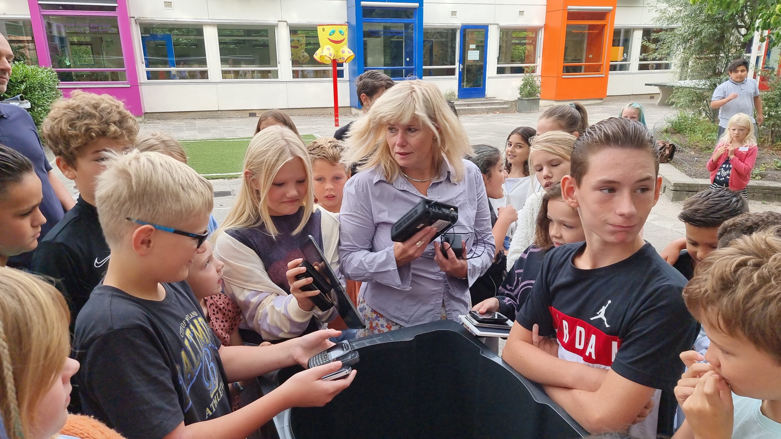 Veel kinderen hadden vanmorgen e-waste van thuis meegenomen om in de speciale container te gooien. Oude en kapotte mobieltjes en een tablet verdwenen in de container. Wethouder van Delft had een kapotte wekkerradio meegebracht. Ook zaken als een oud toetsenbord, kapotte waterkoker of kapotte kabels en adapters vallen onder de noemer e-waste.