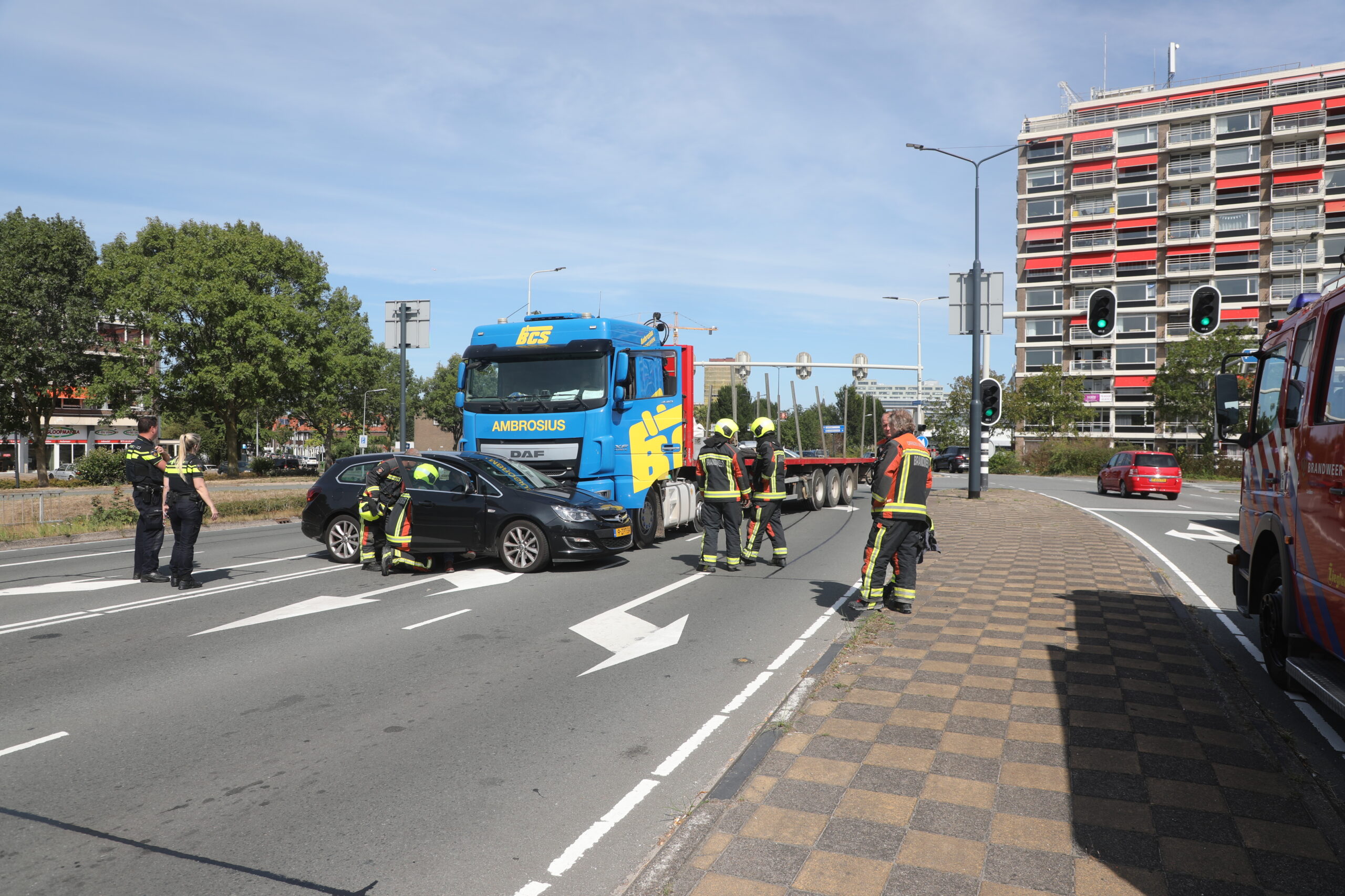 Op het Lammenschansplein zijn dinsdag aan het begin van de middag een auto en een vrachtwagen op elkaar gebotst. De auto kwam hierbij voor de vrachtwagen terecht. De bestuurder van de auto had klachten, maar hoefde na controle door ambulancepersoneel niet mee naar het ziekenhuis.