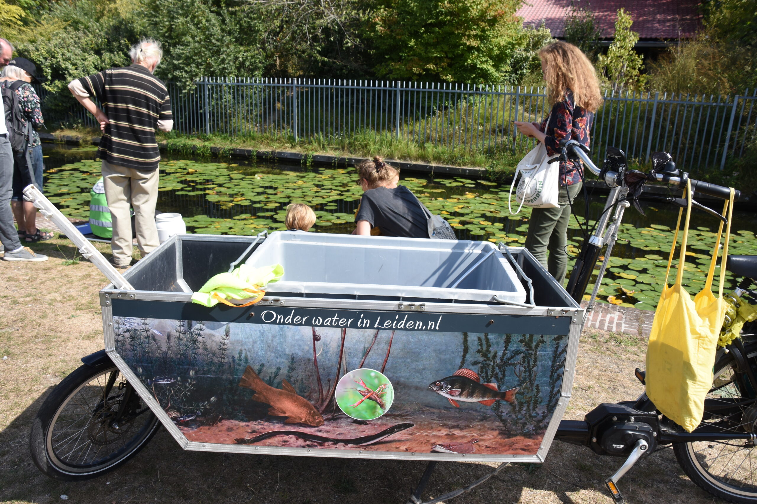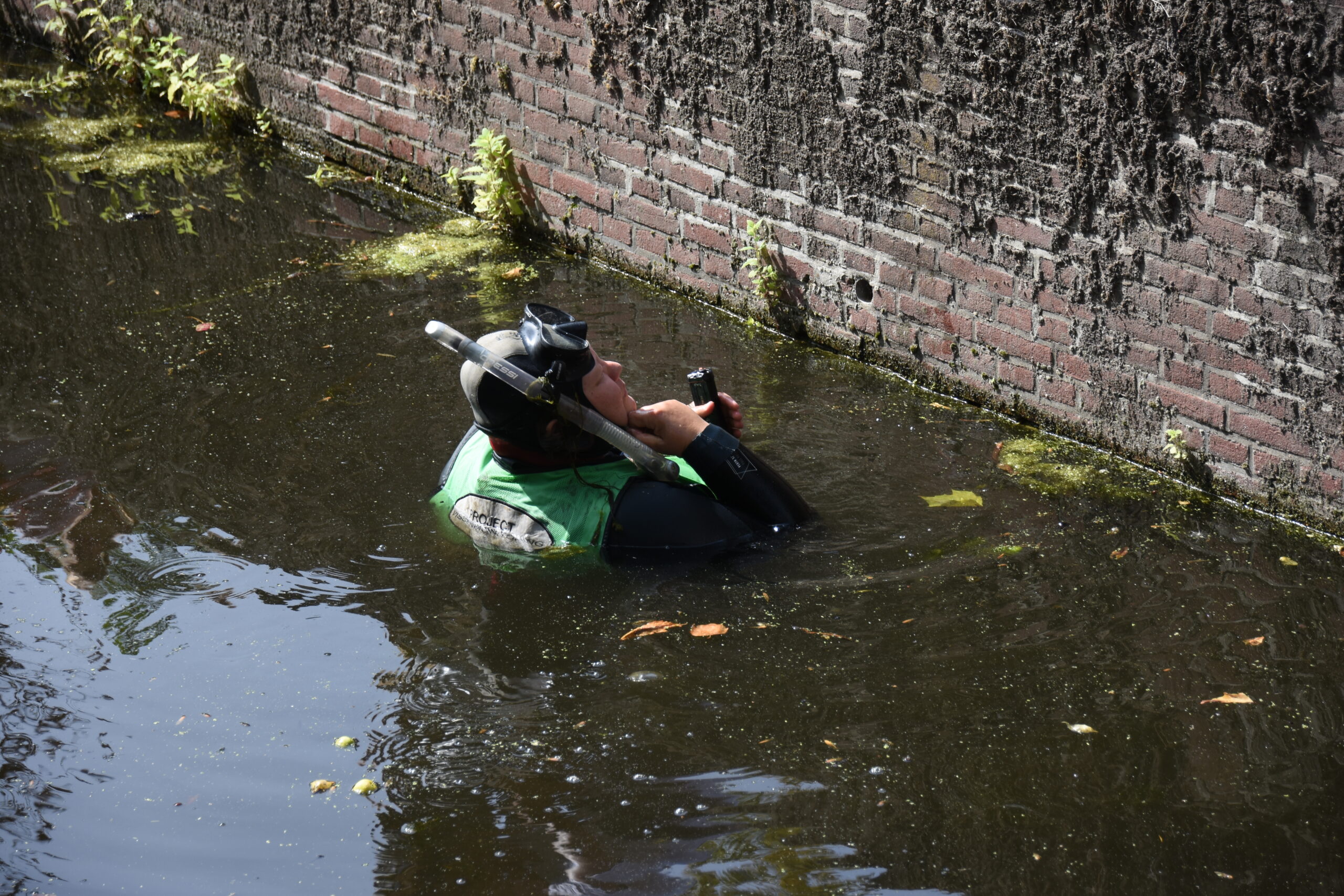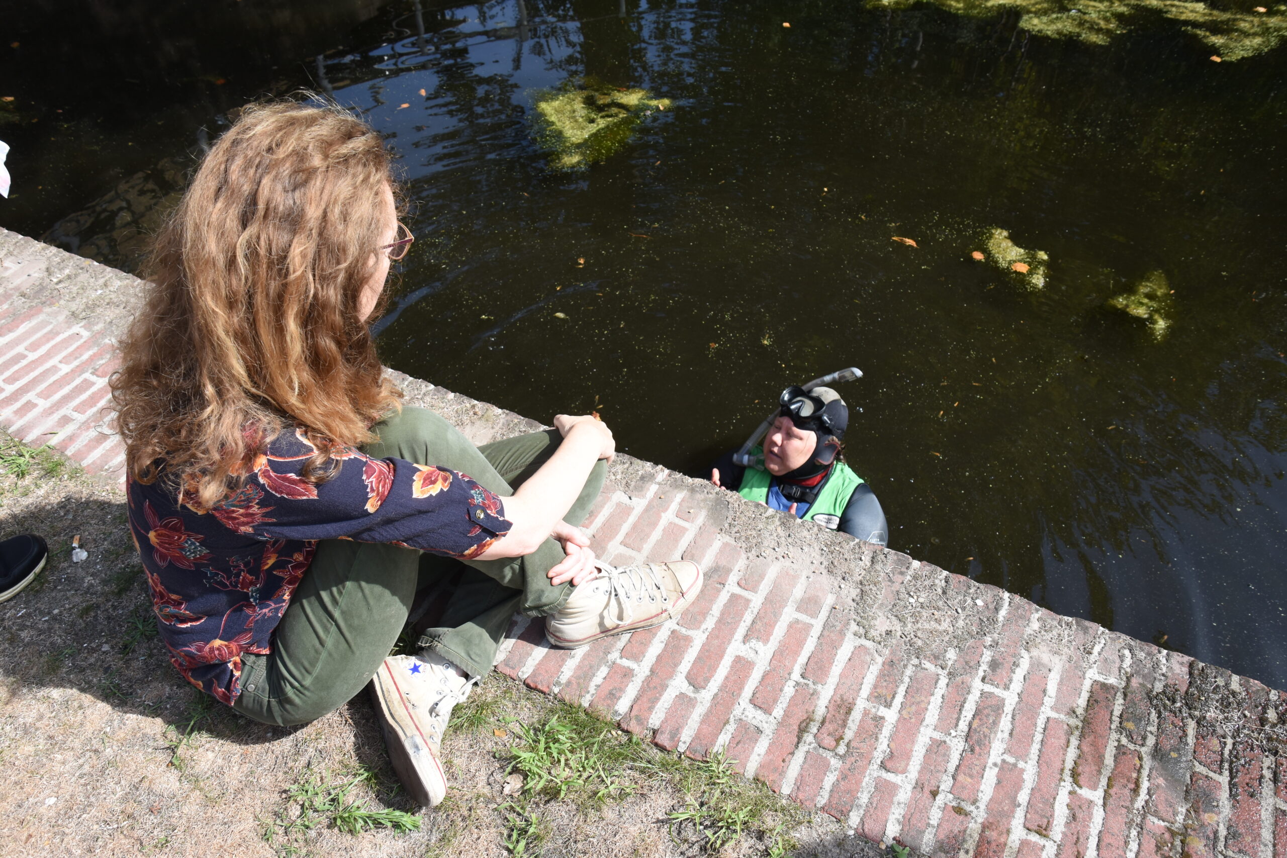 Grachtenduiker Aaf Verkade gaf dinsdag les vanuit het water bij het Lakenpark. Vanuit haar ‘interactieve watertheater’ beantwoordde Verkade vragen van voorbijgangers. Ook liet ze zien wat er zoal in de Leidse grachten te vinden is.