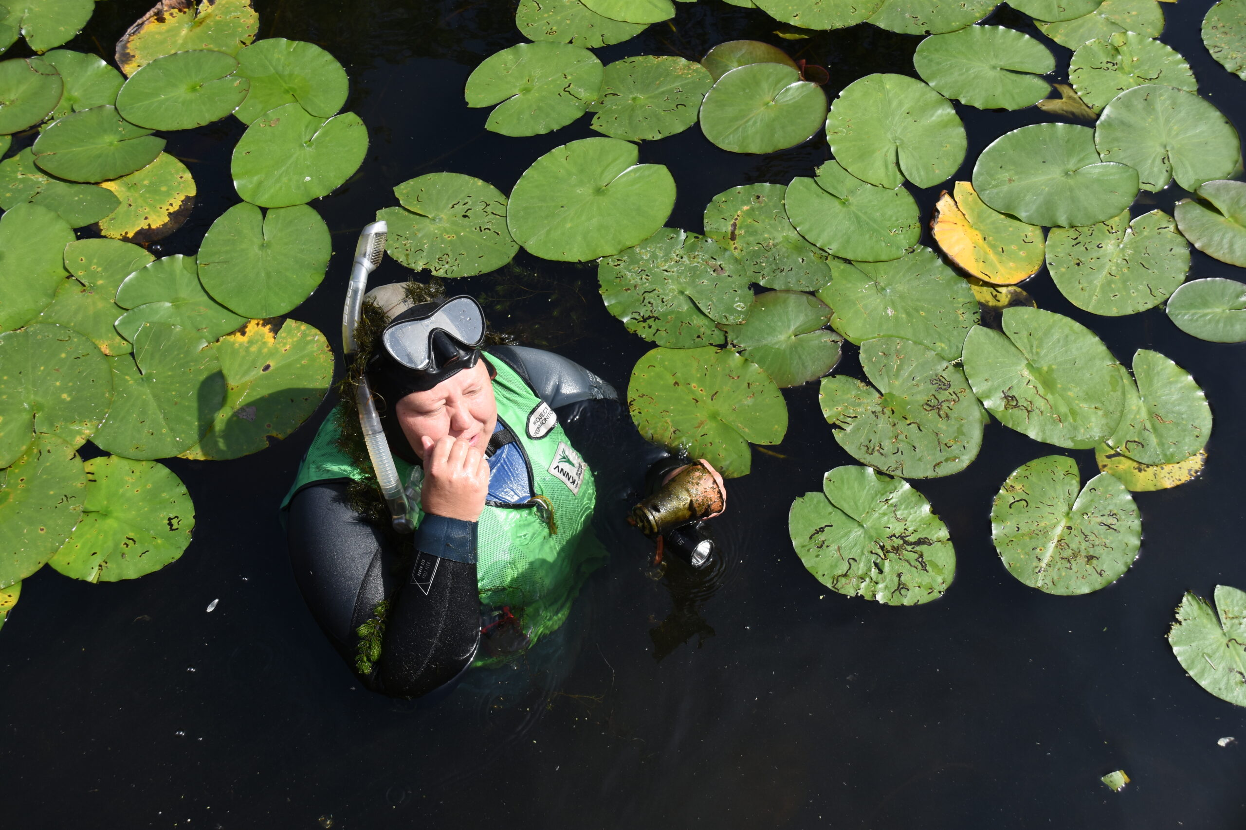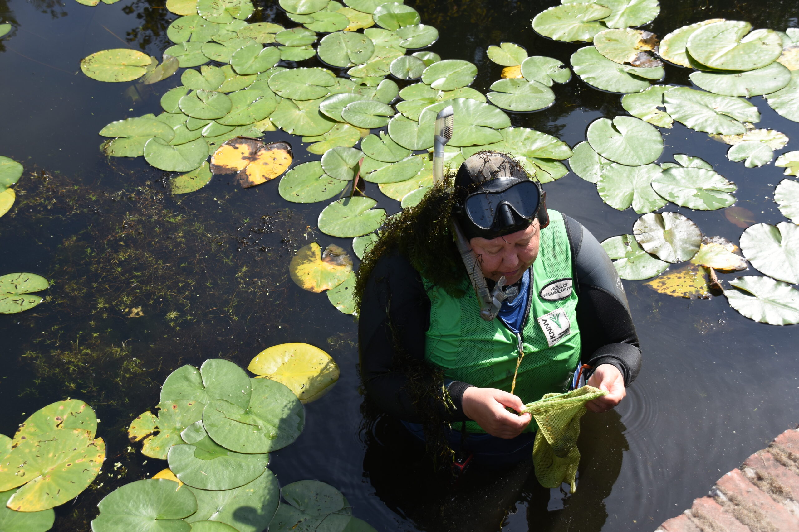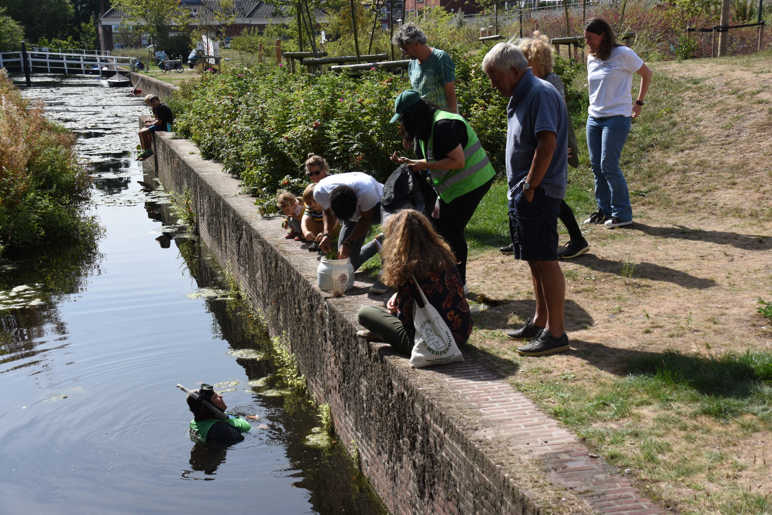 Grachtenduiker Aaf Verkade gaf dinsdag les vanuit het water bij het Lakenpark. Vanuit haar ‘interactieve watertheater’ beantwoordde Verkade vragen van voorbijgangers. Ook liet ze zien wat er zoal in de Leidse grachten te vinden is.
