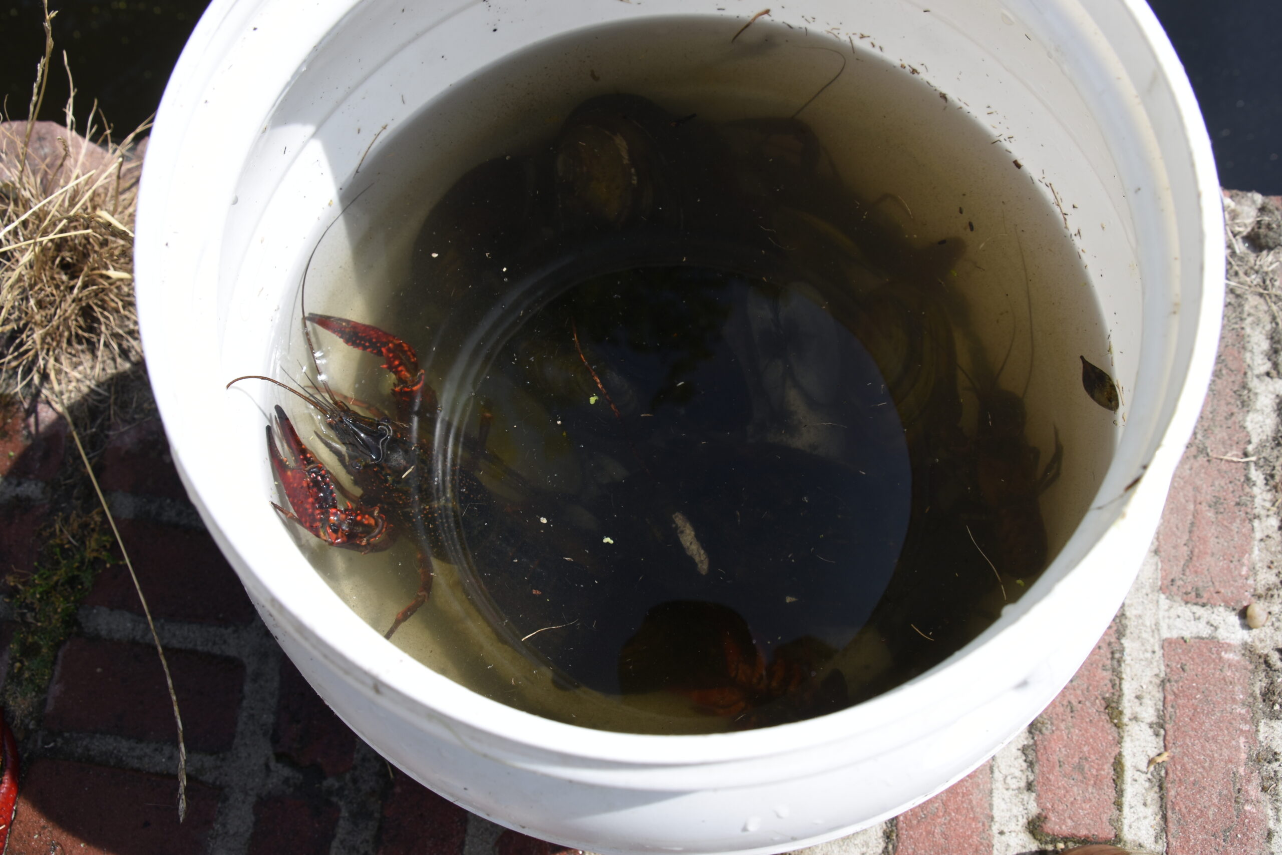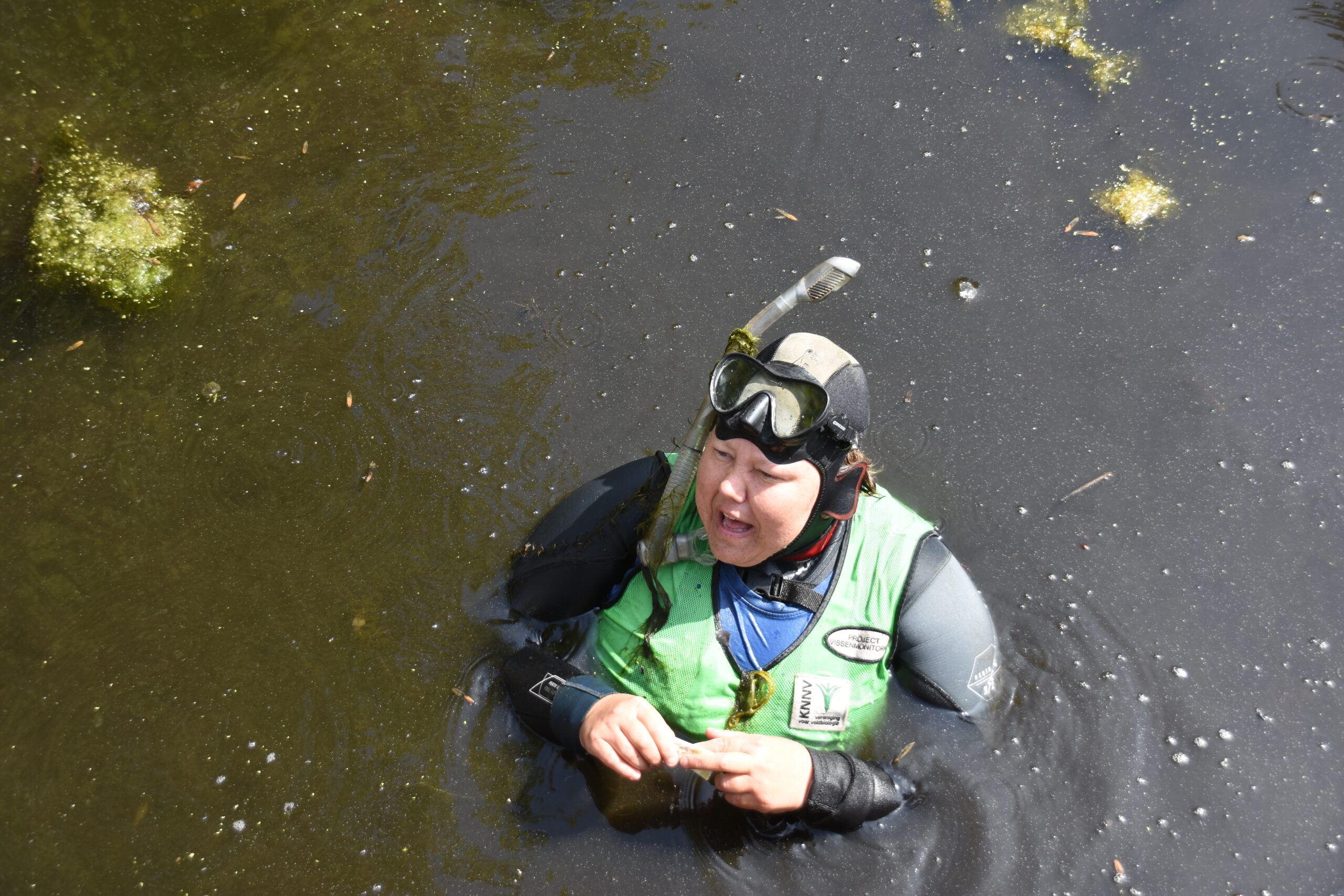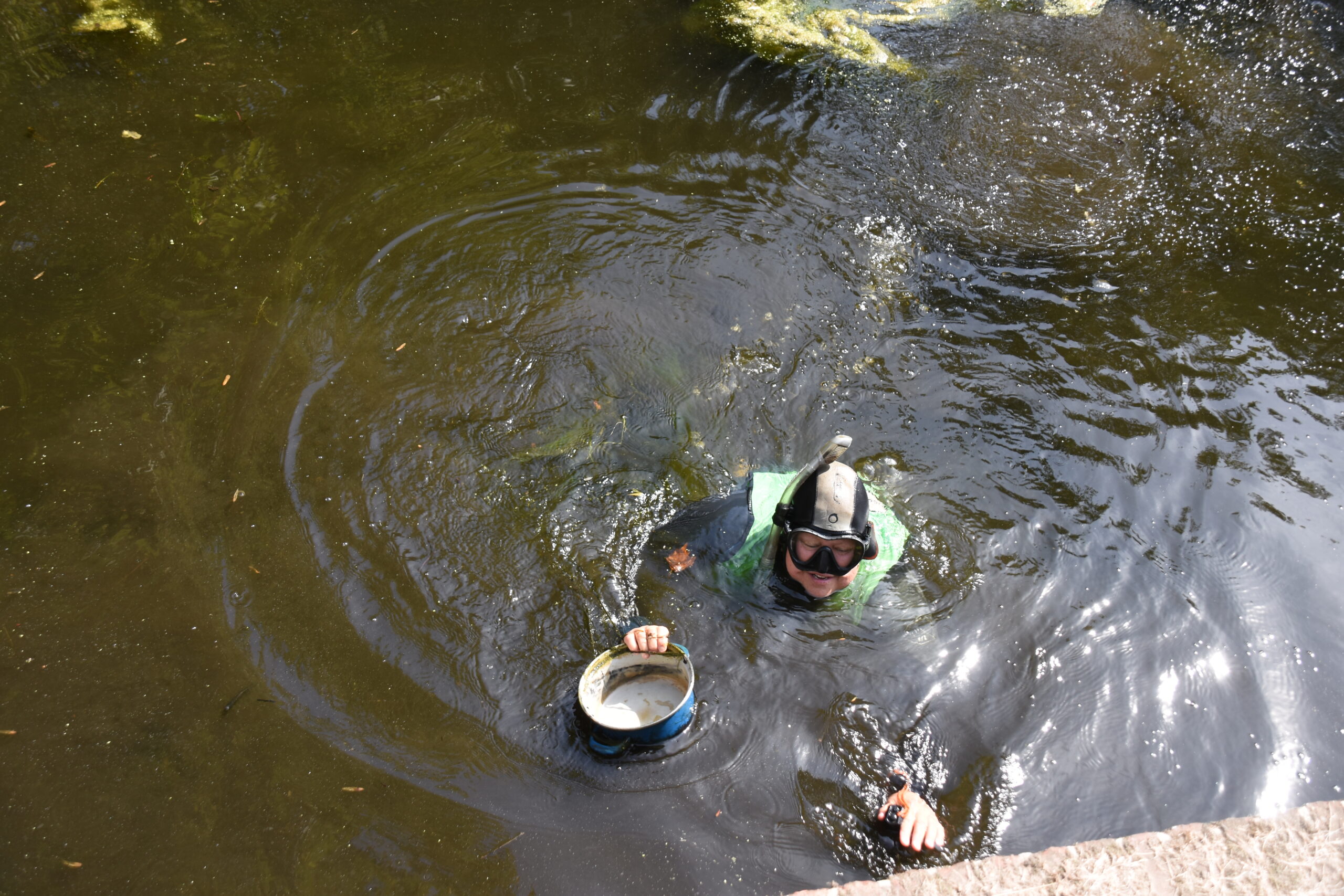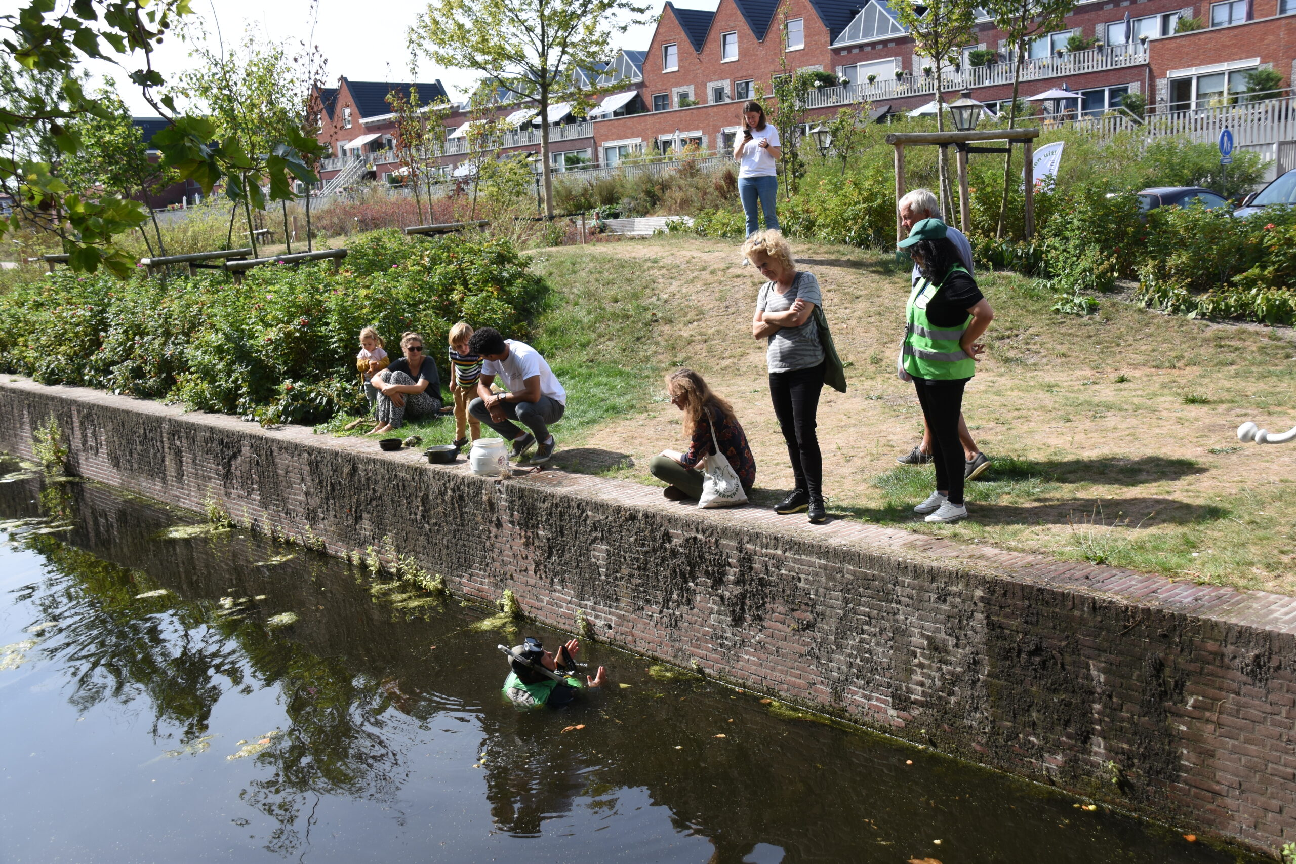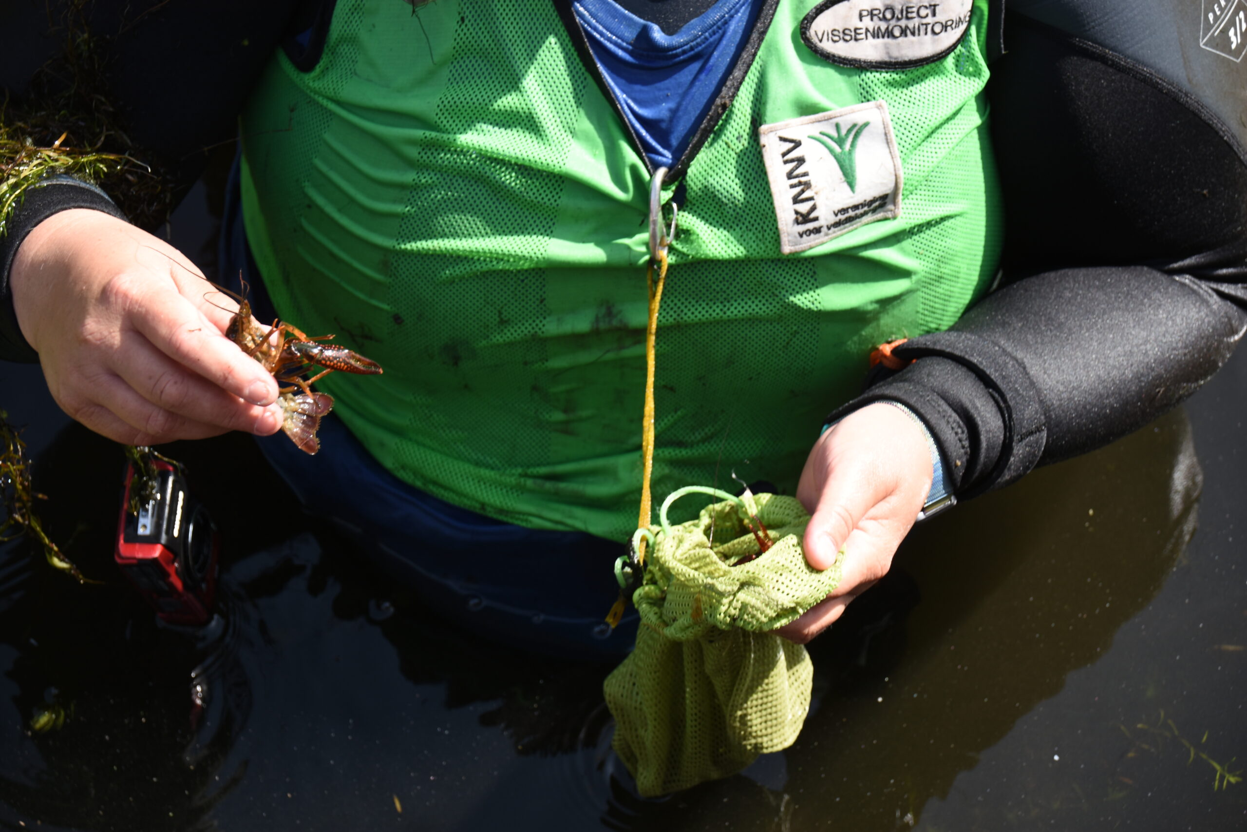 Naast ‘knuffelkarpers’ en afval zijn er flink wat rode Amerikaanse rivierkreeften op de bodem van de Leidse grachten te vinden. Verkade dook er een aantal op en liet de invasieve exoot aan de kinderen in de aangrenzende speeltuin zien.