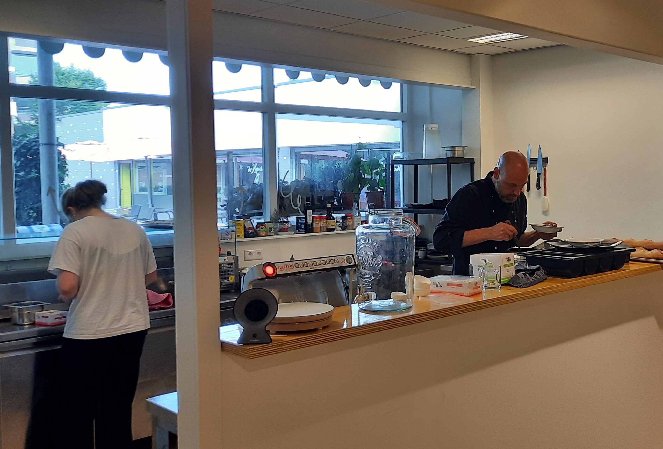 Cas zorgt ondertussen achter de bar voor de koffie. In het lunchcafé loopt hij zijn stage via het leerwerktraject van Cardea. Gisteren is hij druk bezig geweest met de voorbereidingen voor de opening: “ik heb de hele dag in de keuken gestaan en van alles gemaakt: boterkoek, gehaktballetje, enzovoort.”
