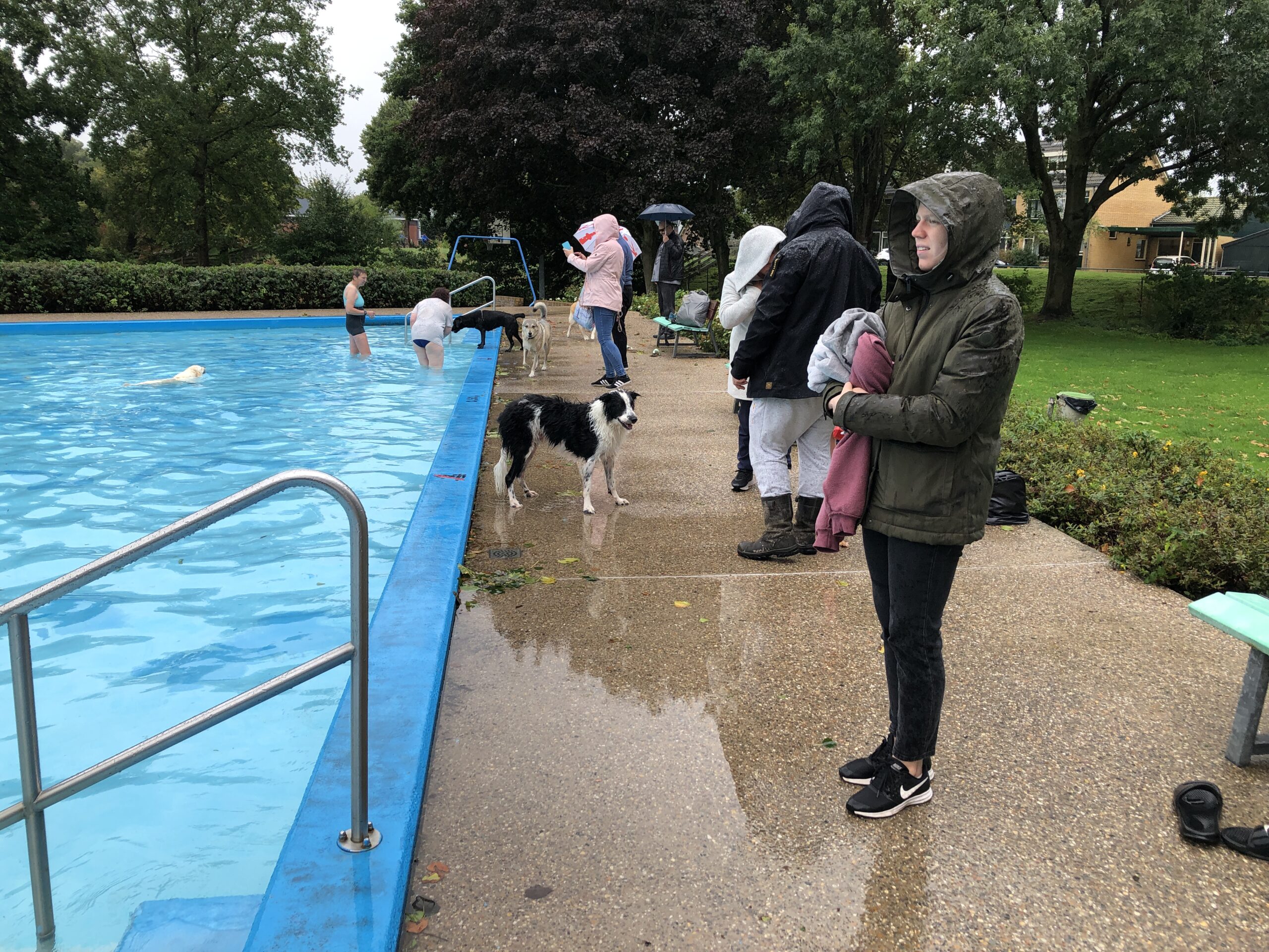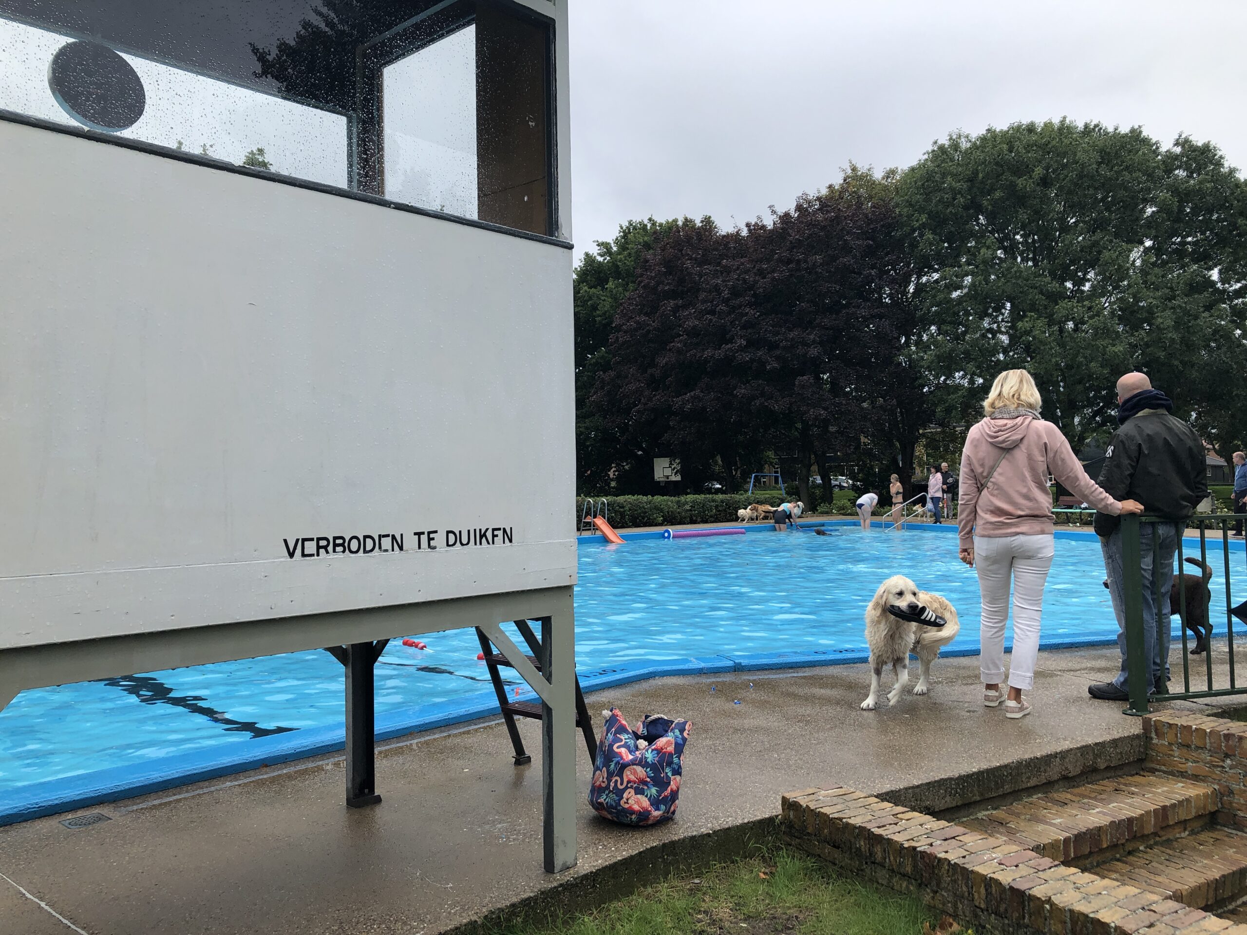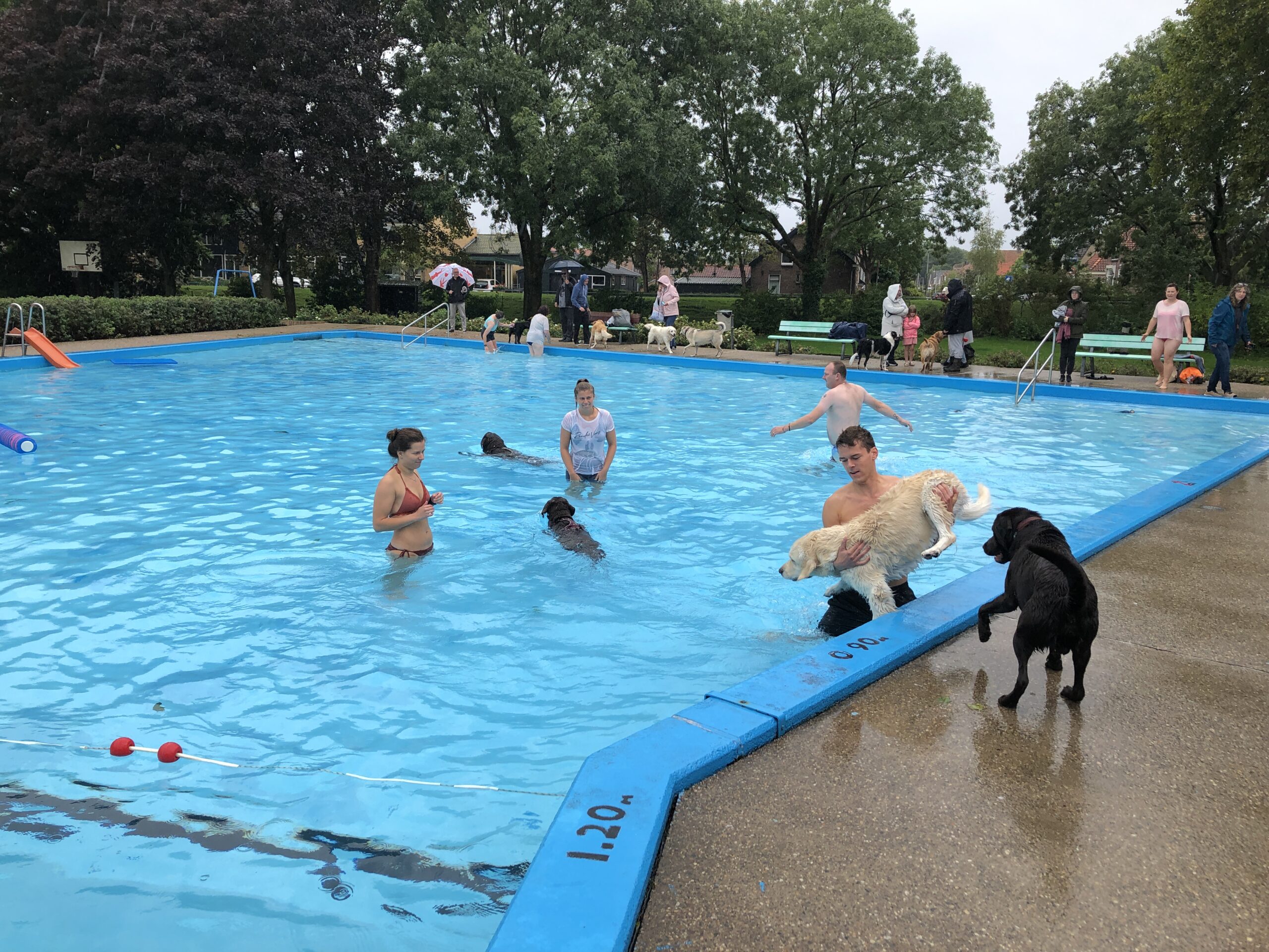 Ondanks de regen trokken enkele tientallen hondenbezitters zondagmiddag naar zwembad Haasbroek in Zoeterwoude. Traditioneel werd het zwemseizoen afgesloten met een middagje ‘hond- baaszwemmen’. Een dag per jaar mogen de viervoeters met hun baasje het zwemwater in.