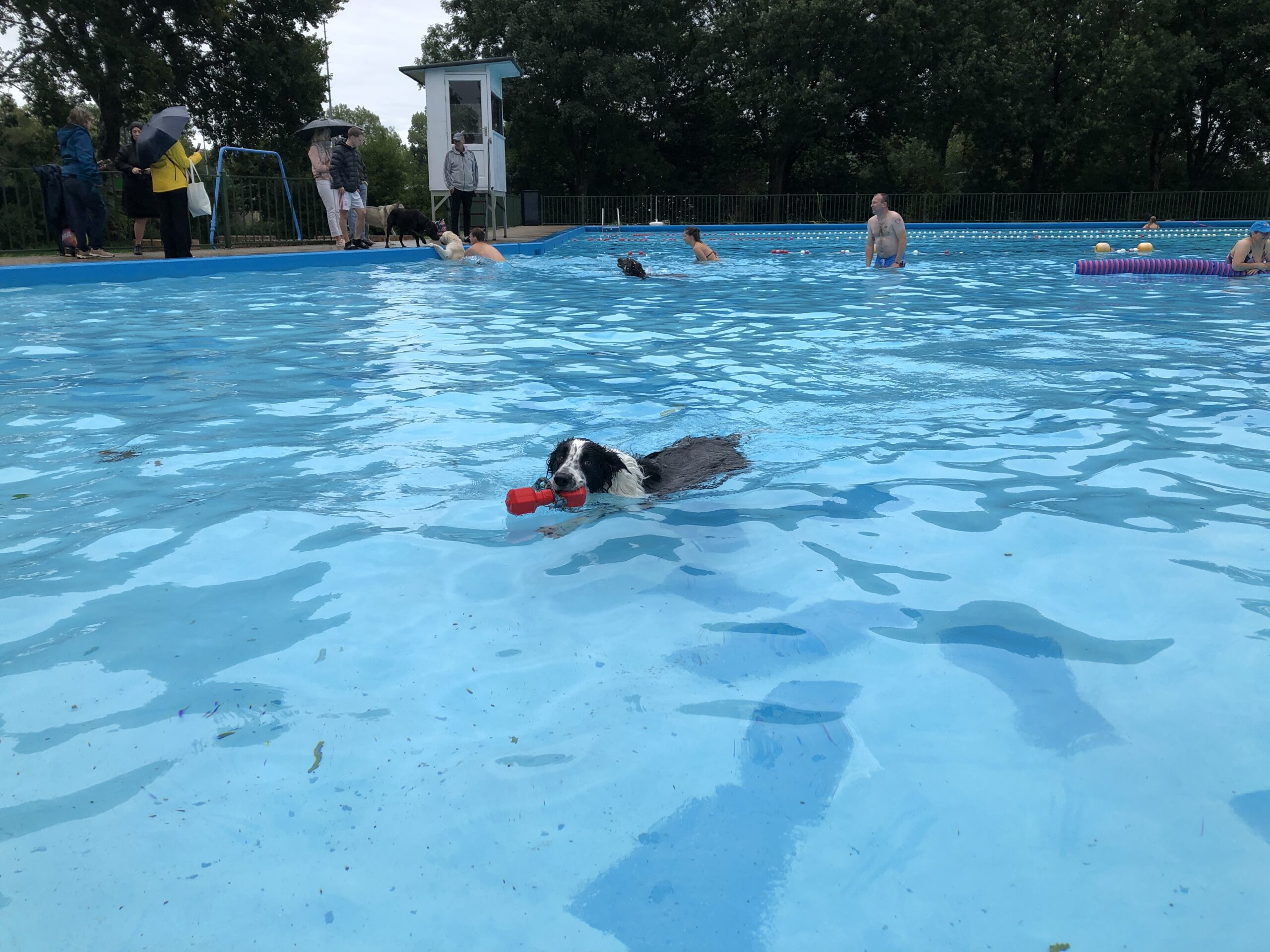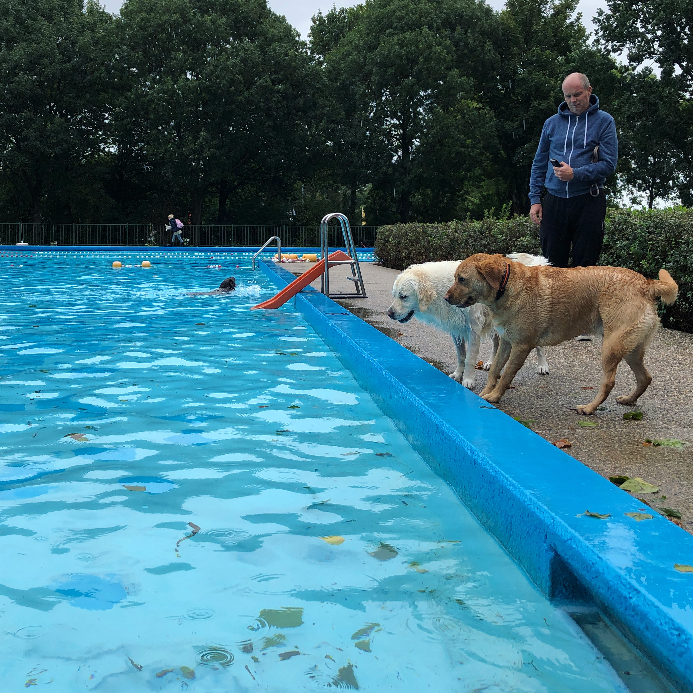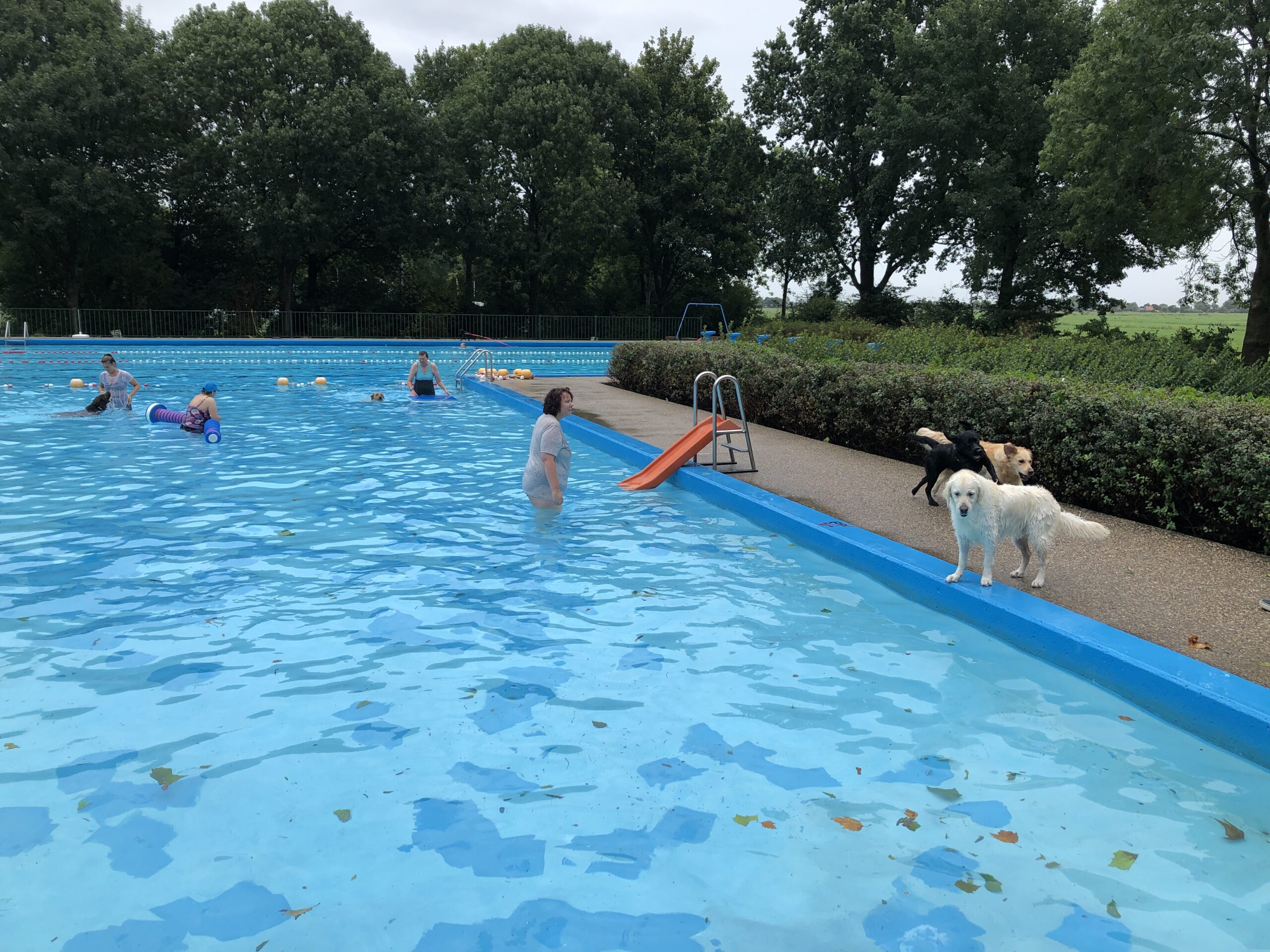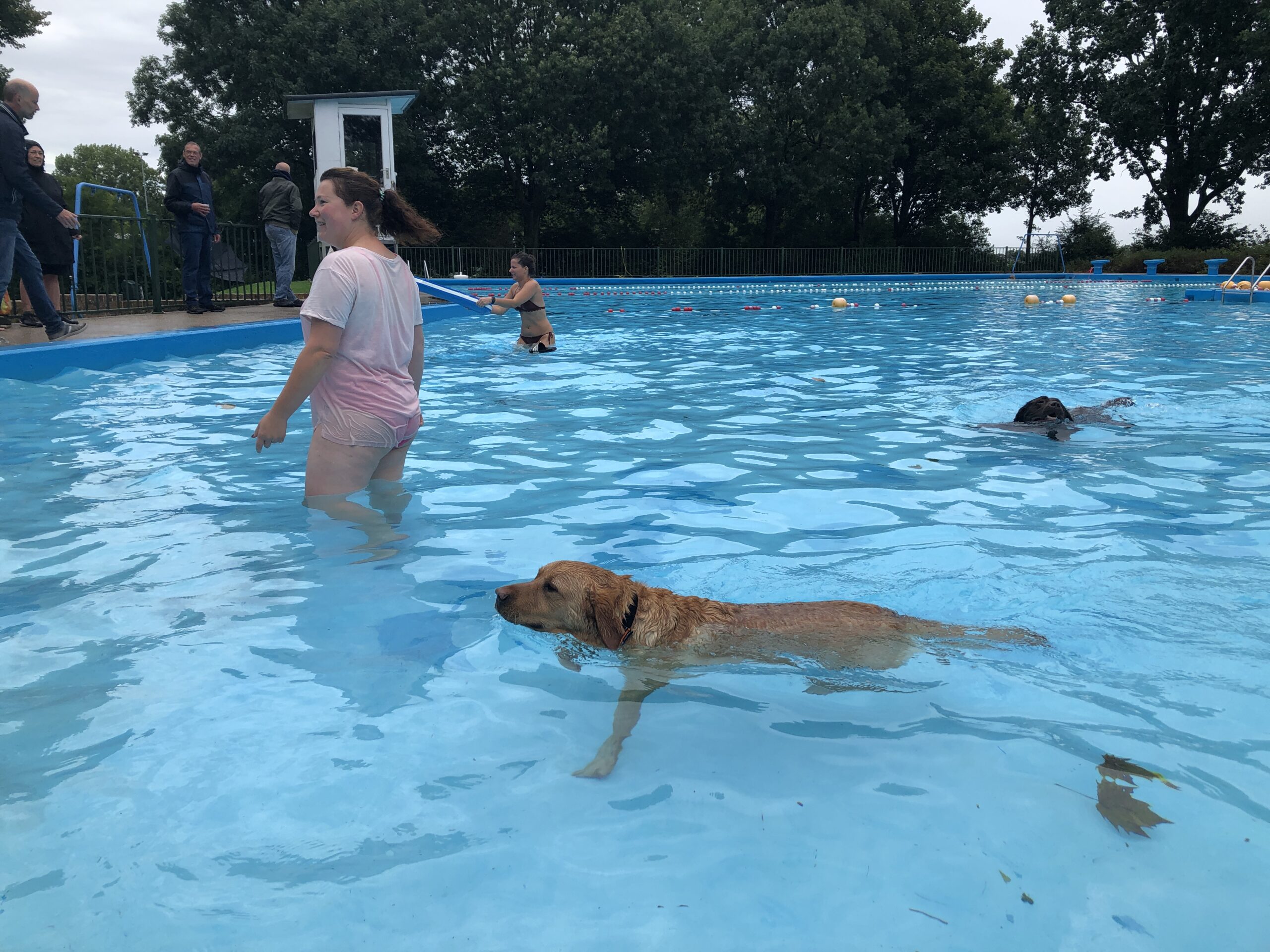 Ondanks de regen trokken enkele tientallen hondenbezitters zondagmiddag naar zwembad Haasbroek in Zoeterwoude. Traditioneel werd het zwemseizoen afgesloten met een middagje ‘hond- baaszwemmen’. Een dag per jaar mogen de viervoeters met hun baasje het zwemwater in.