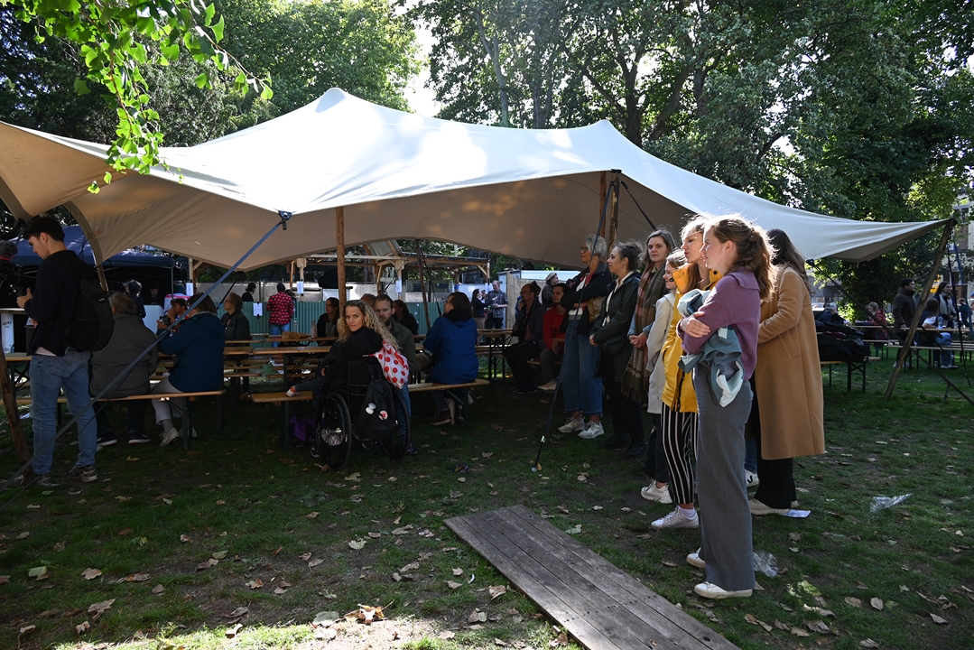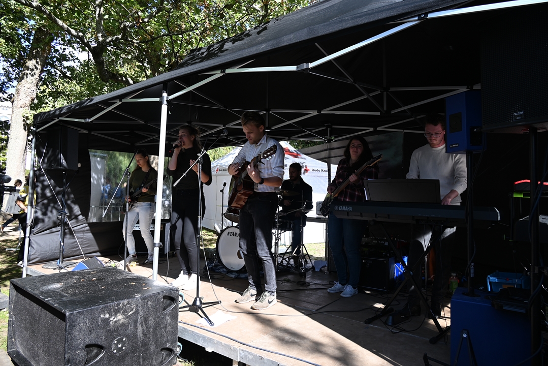Elke deelnemer finishte bij het muziekevenement in het Van der Werfpark. Burgemeester Henri Lenferink en Fleur Spijker, wethouder Sport, vingen daar de deelnemers gastvrij op. In het park traden verschillende Leidse studentenbands op. Na de finish wordt het ingezamelde bedrag bekendgemaakt. “Waar vorig jaar 100.000 euro werd opgehaald door zwemmers en andere donateurs, staat de teller nu ruim boven dit bedrag”, deelt de organisatie.