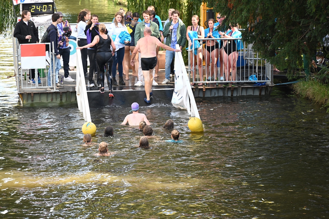 Prins Floris van Oranje gaf zaterdagmiddag het startschot voor de vierde editie van de Rapenburg Race. 750 studenten en een groep dwarslaesiepatiënten zwommen daarna 800 meter door het Rapenburg in Leiden. Ze zamelden hiermee geld in voor dwarslaesie onderzoek.