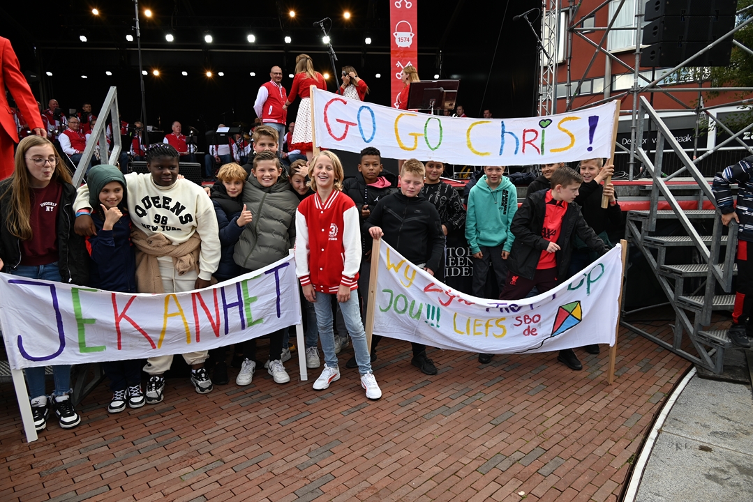 Chris Juffermans kreeg de eervolle taak de geliefde Leidse cabaretier te vervangen. Aangemoedigd door zijn medeleerlingen van basisschool De Vlieger, pakte Chris het publiek vakkundig in. Hij had dit buitenkansje te danken aan zijn zangdocent van Zanghuis 206, vertelt Chris na afloop van zijn optreden. “Ik wil volgend jaar wel weer.”