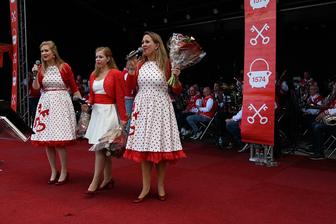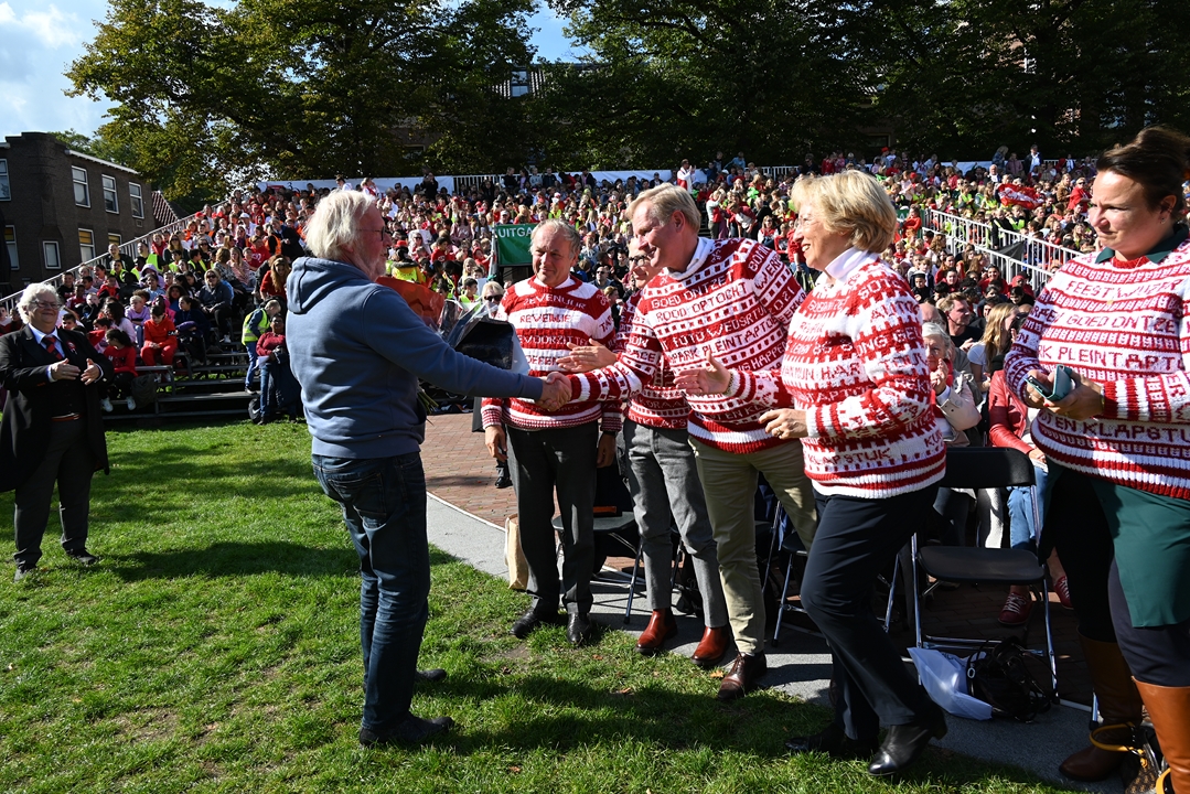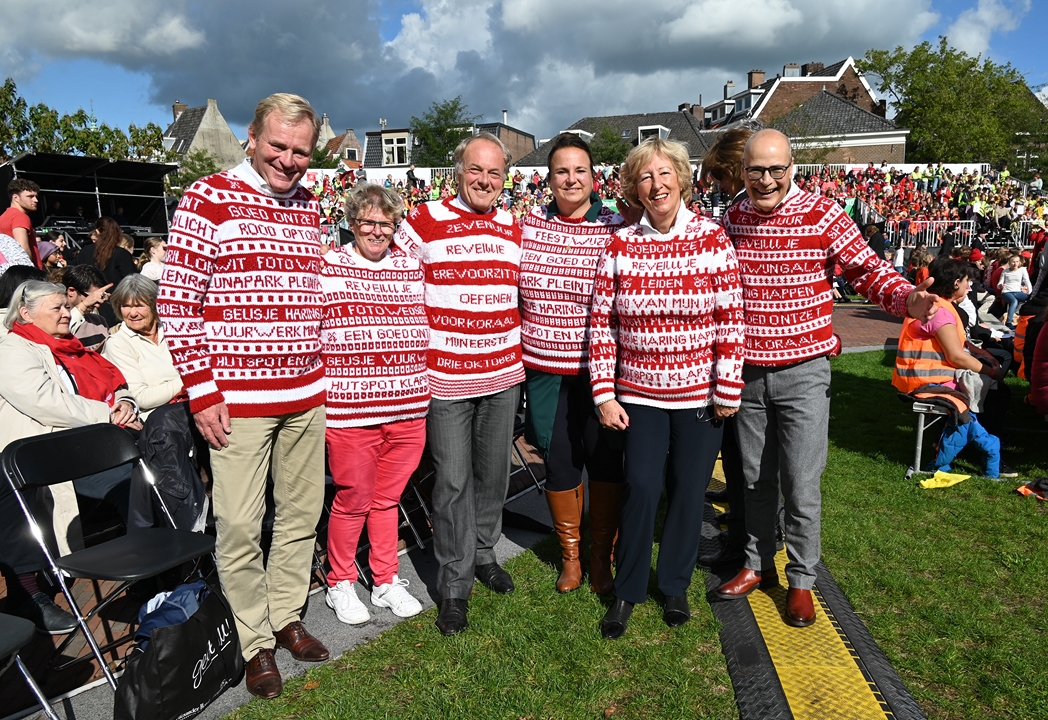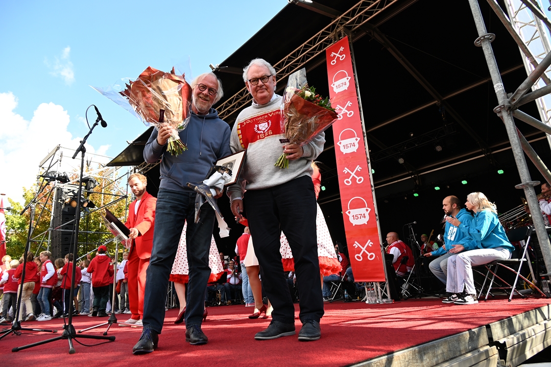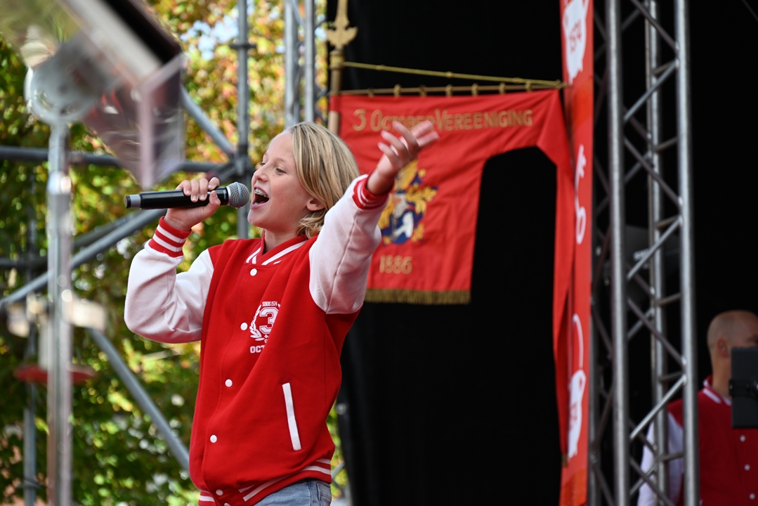 Rik Kamps, voorzitter van de 3 October Vereeniging, haalde Eric Filemon en Rens Heruer die samen veel liedjes maakten voorde Minikoraal de afgelopen dertig jaar naar het podium en bedankte hen voor al het plezier dat de Leiden hadden gegeven met hun werk.
