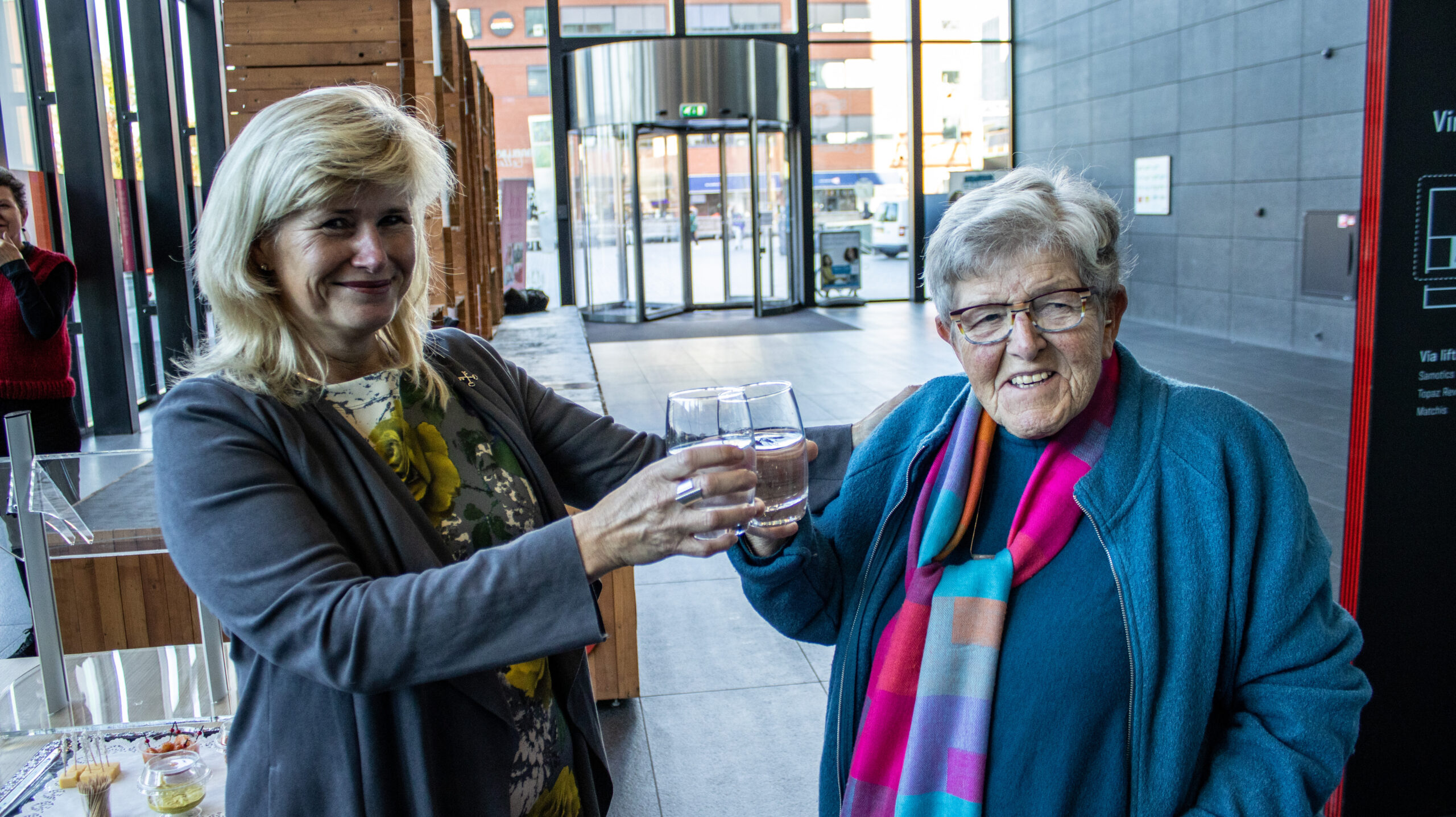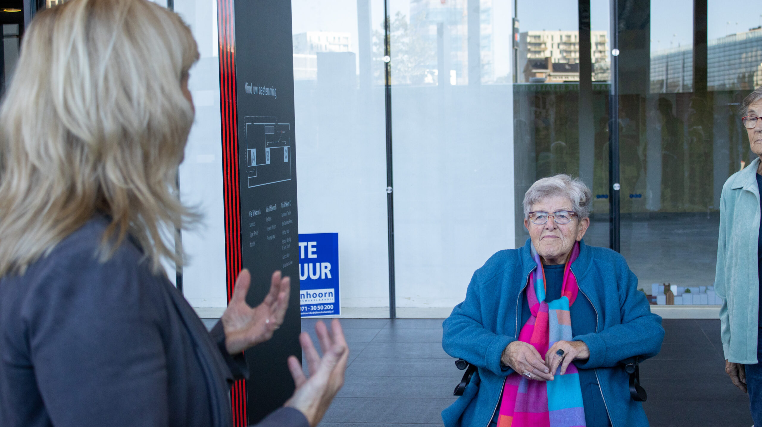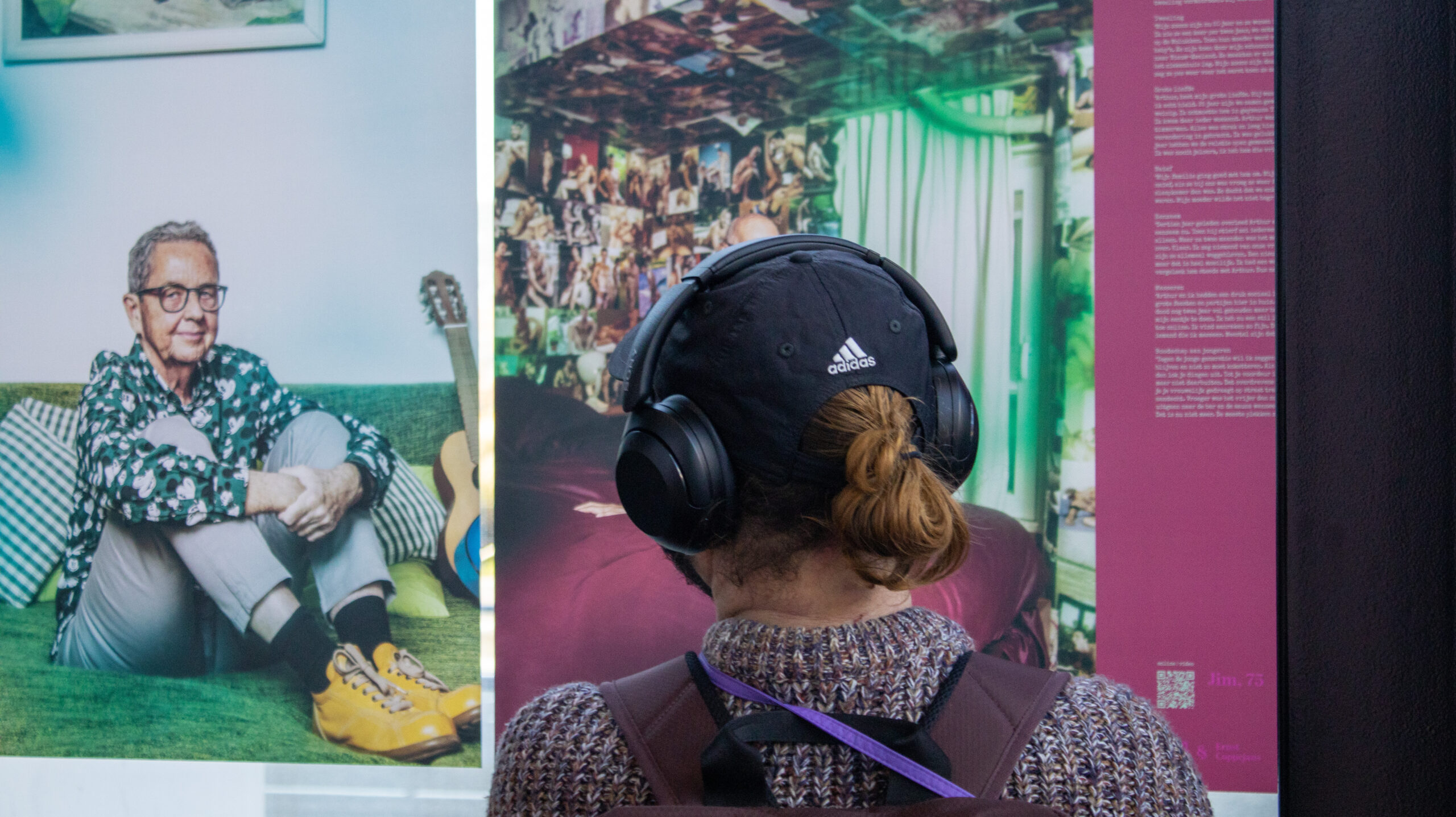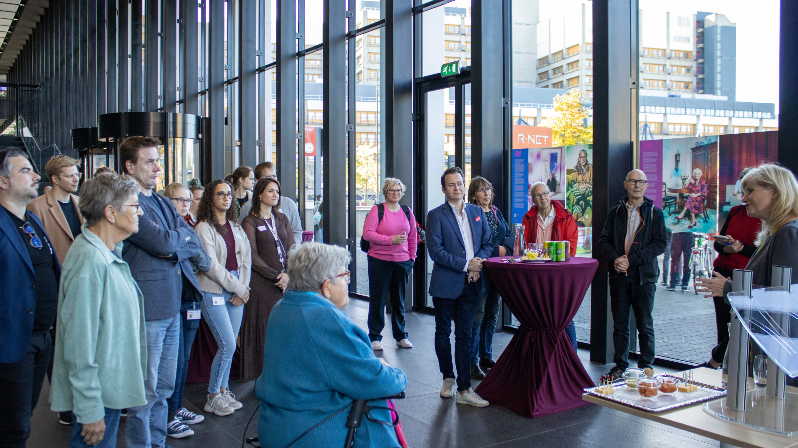 Verslaggever Robbert Beurse in gesprek met wethouder Yvonne van Delft, raadslid Ivo van Spronsen en ‘roze oudere’ Magda Romkens over de bijzondere fototentoonstelling in Level.
