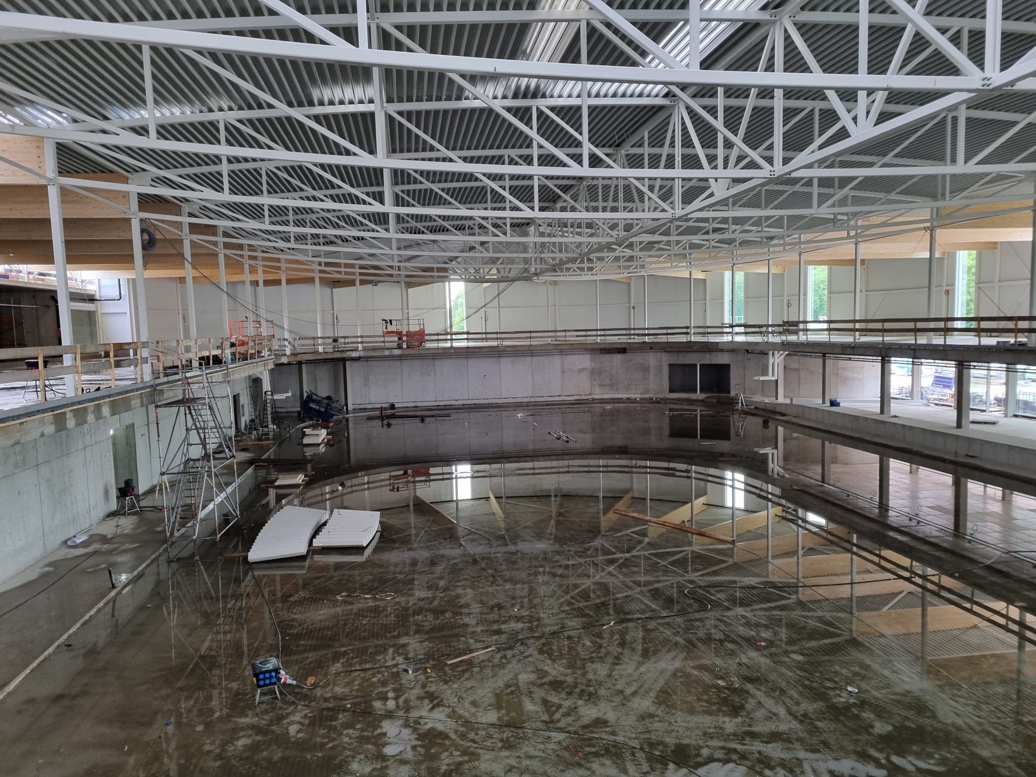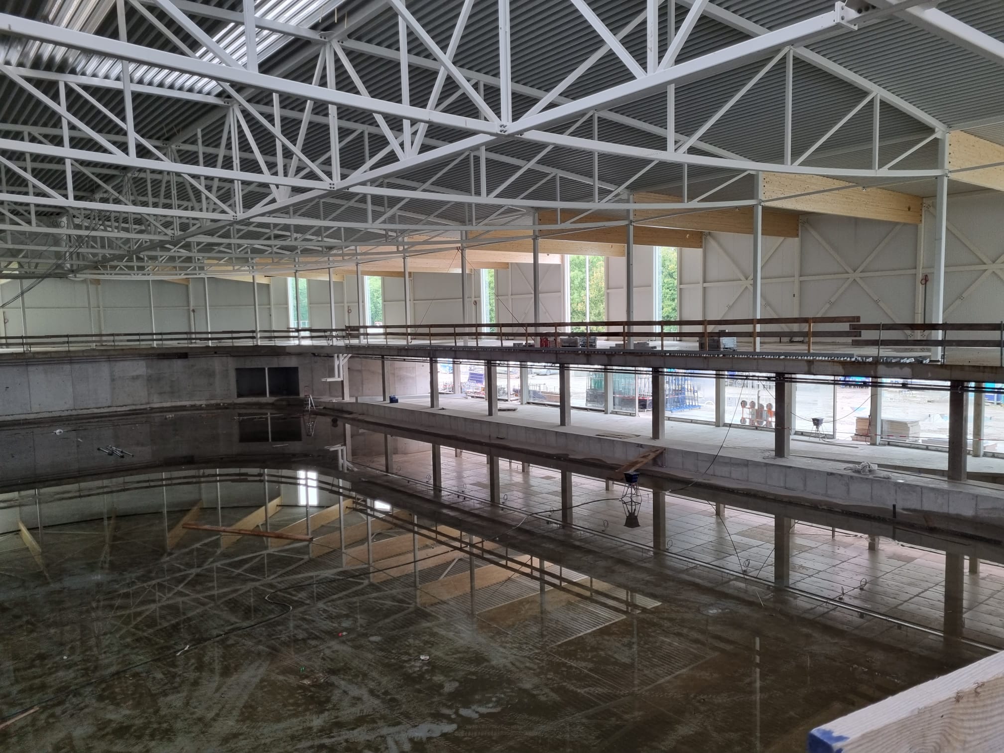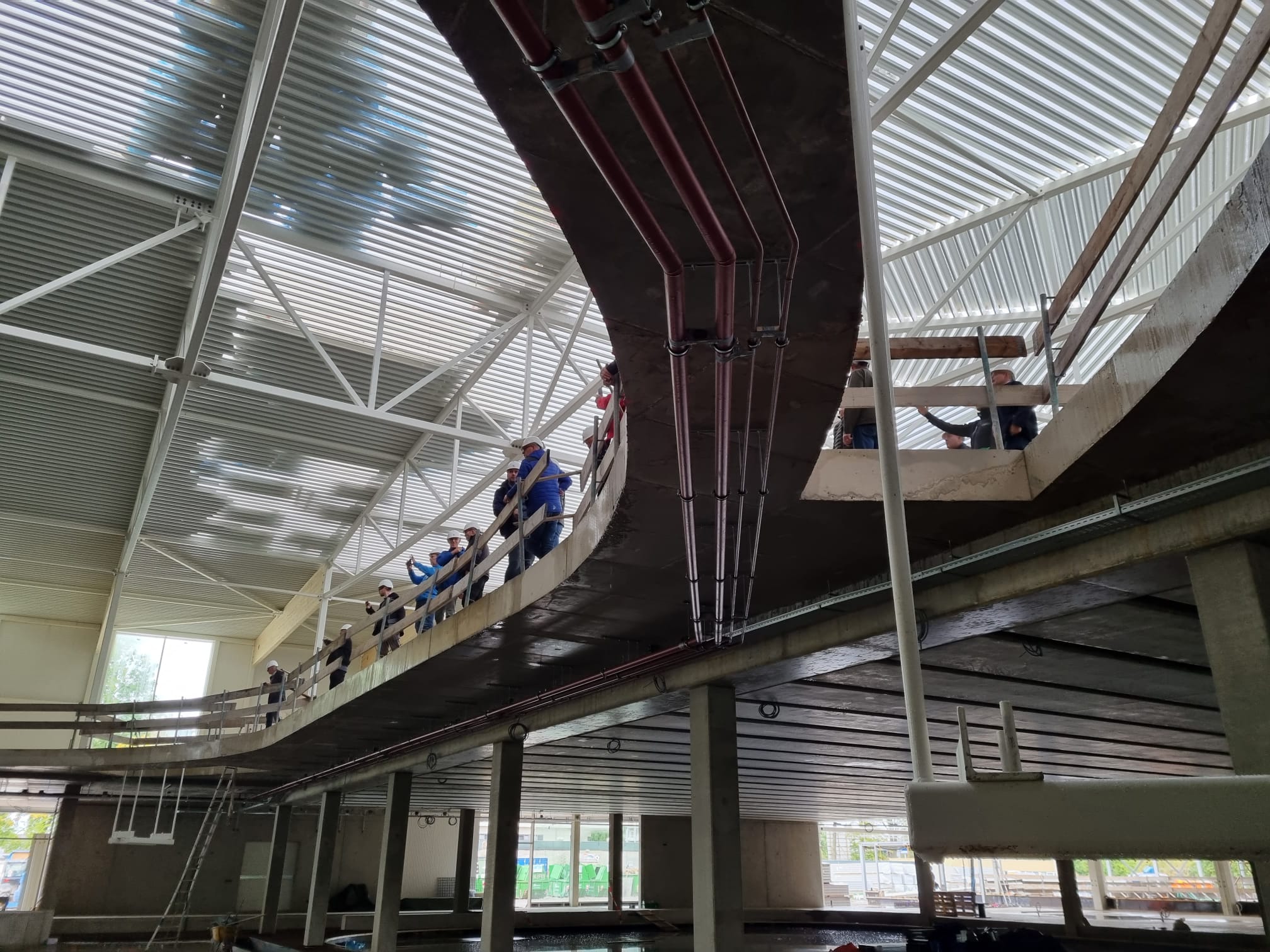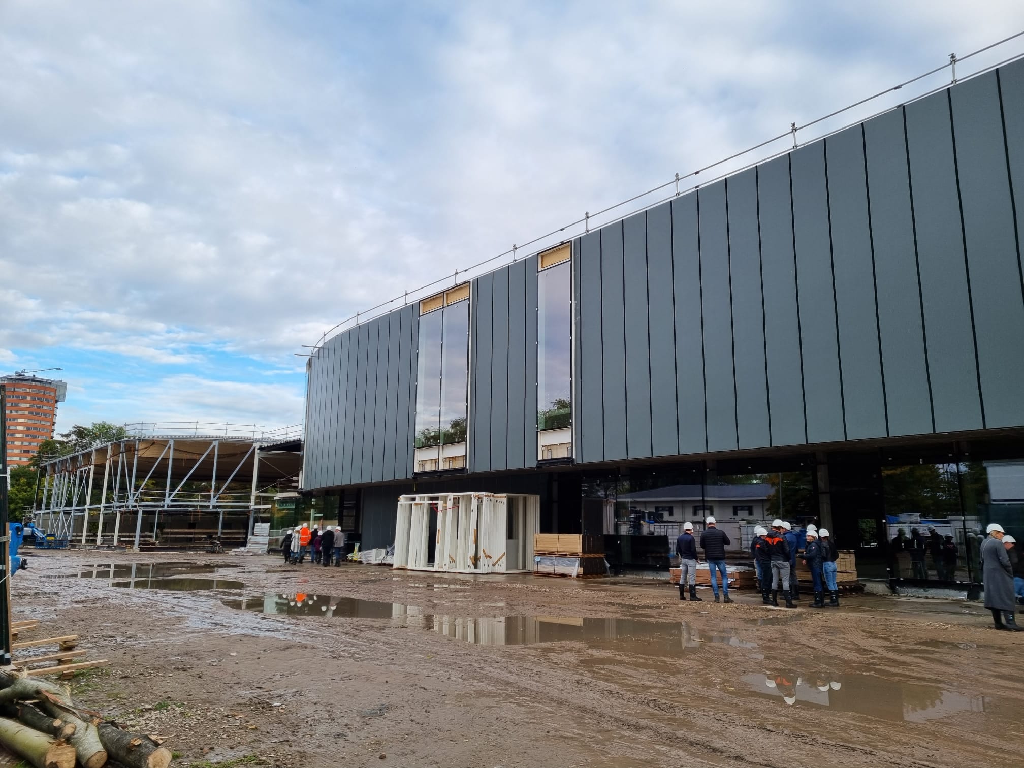 Gemeente en toekomstige gebruikers van het nieuwe binnenzwembad annex schaatshal De Vliet in het gelijknamige sportpark aan de Voorschoterweg hebben het hoogste punt van het nieuwe sportcomplex gevierd.