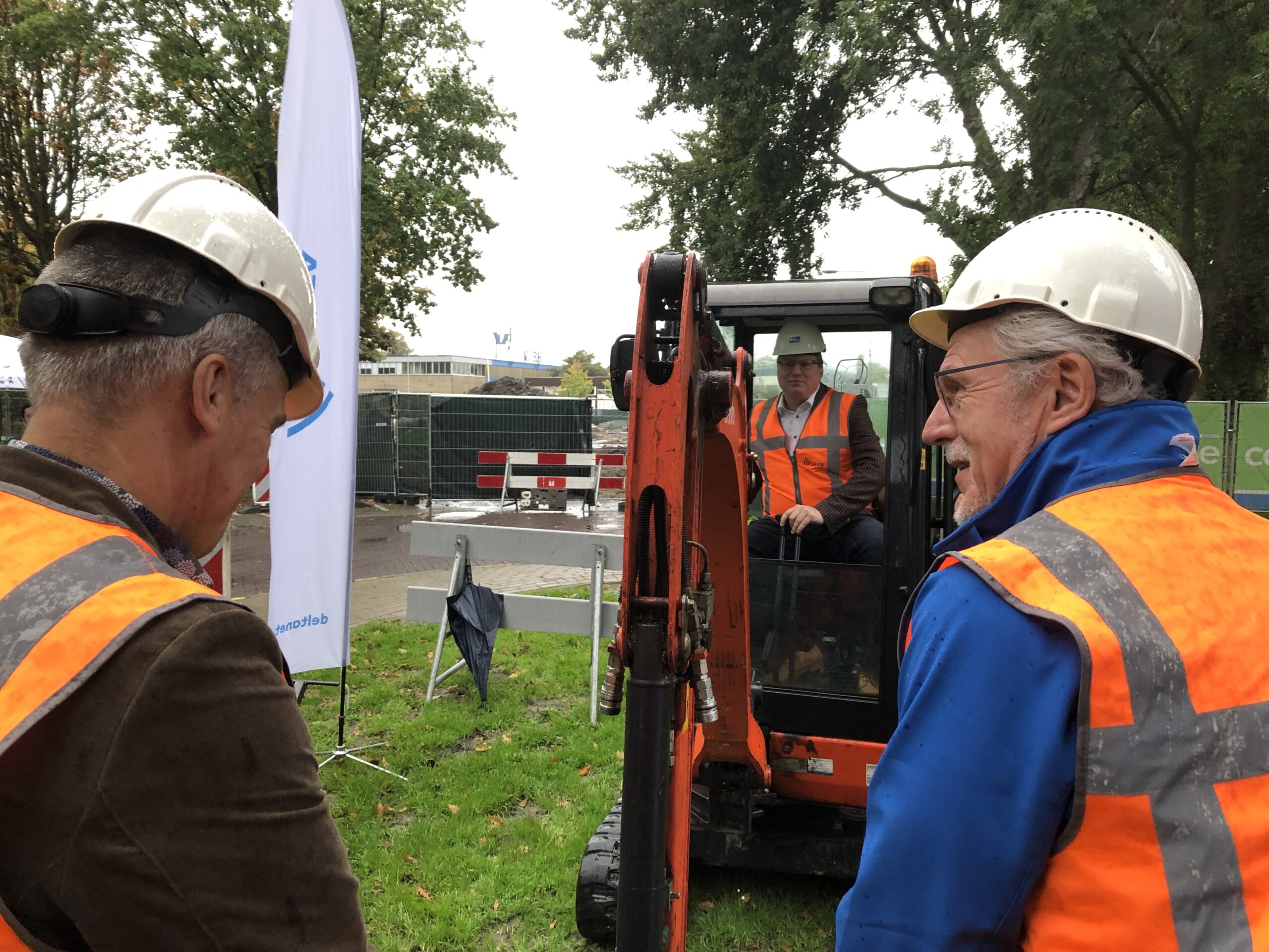 Verslaggever Robbert Beurse in gesprek met Rob van Halderen en wethouder Paul Olthof over de start van de aanleg van glasvezel In Zoeterwoude.