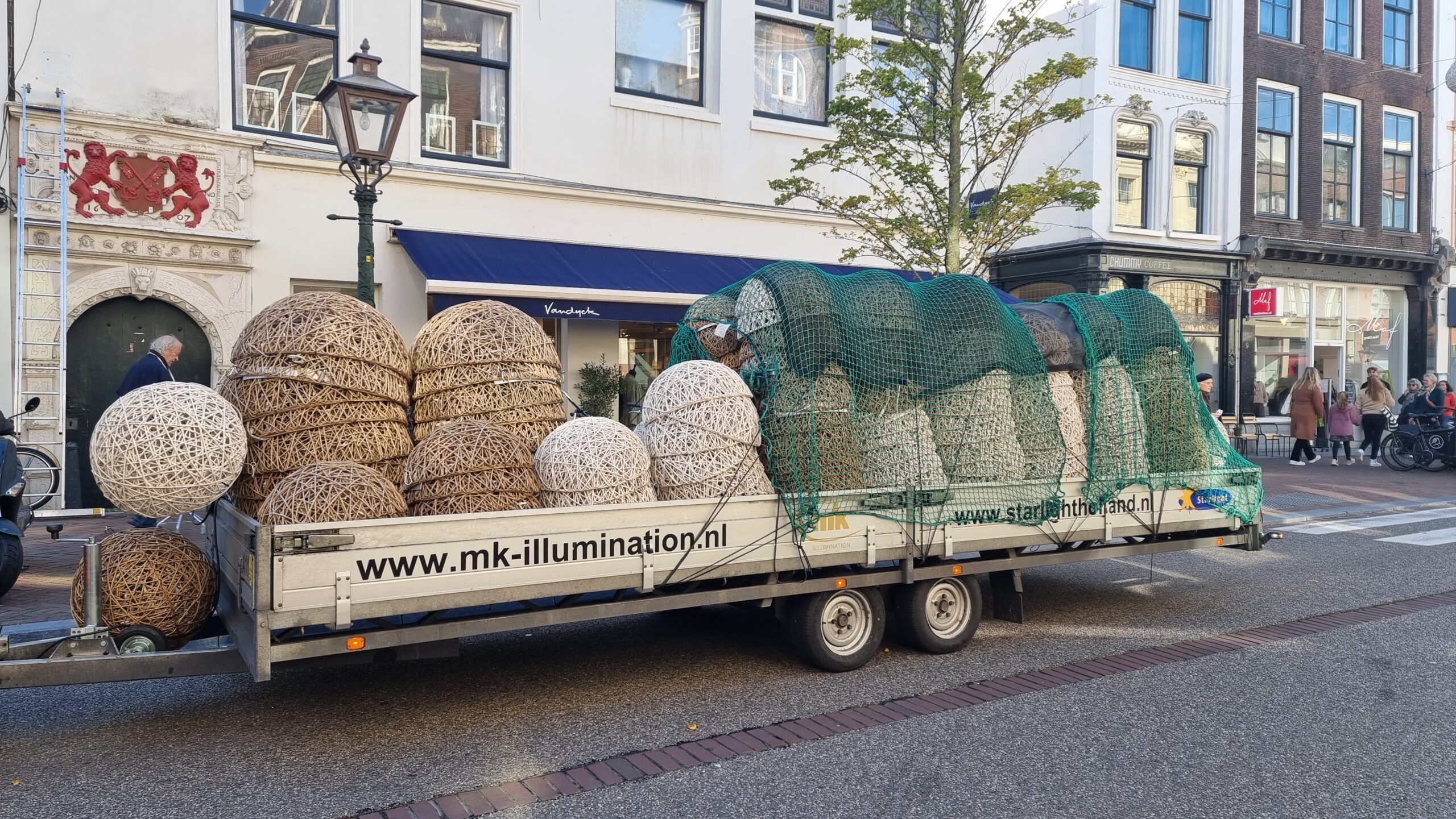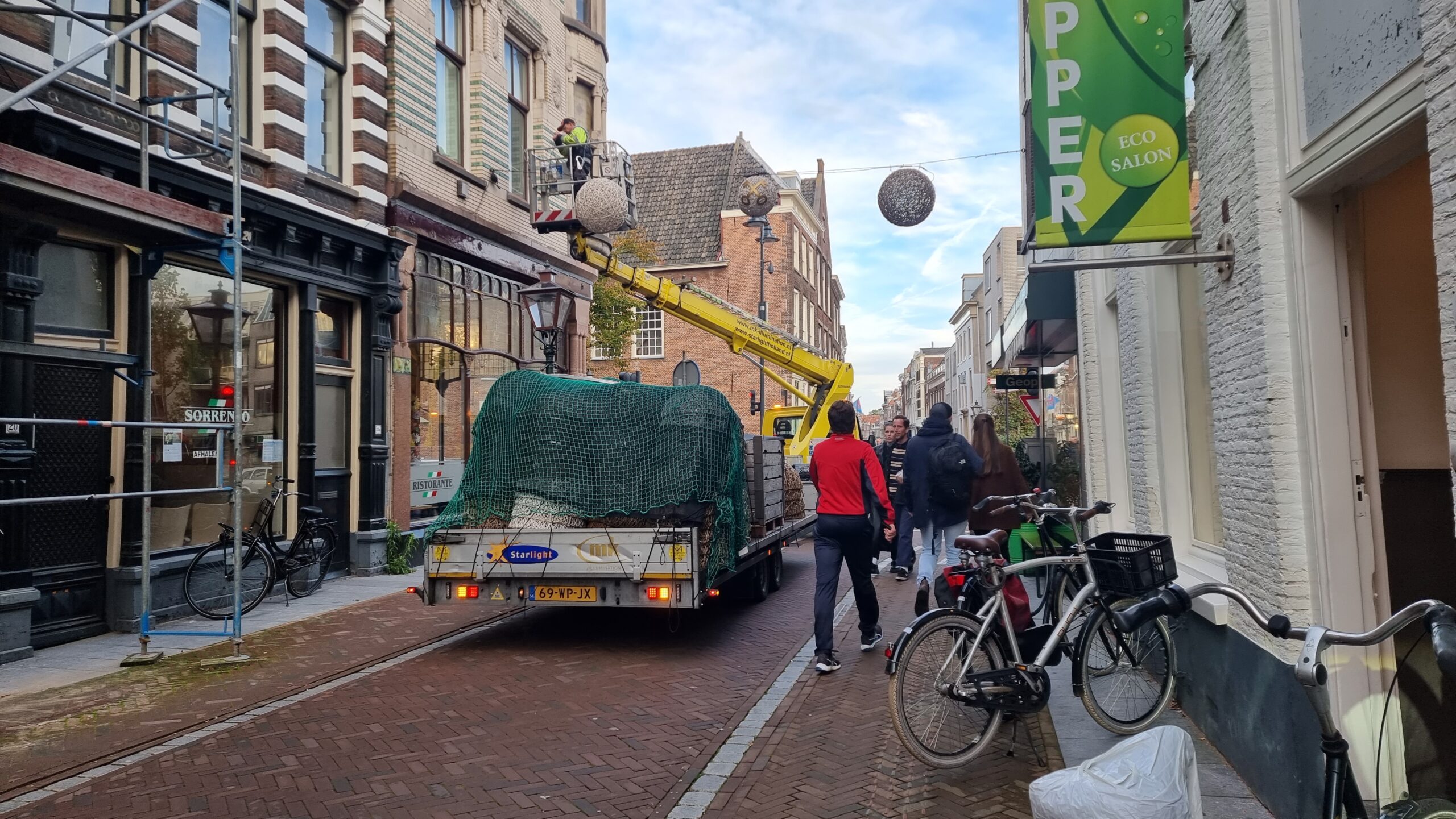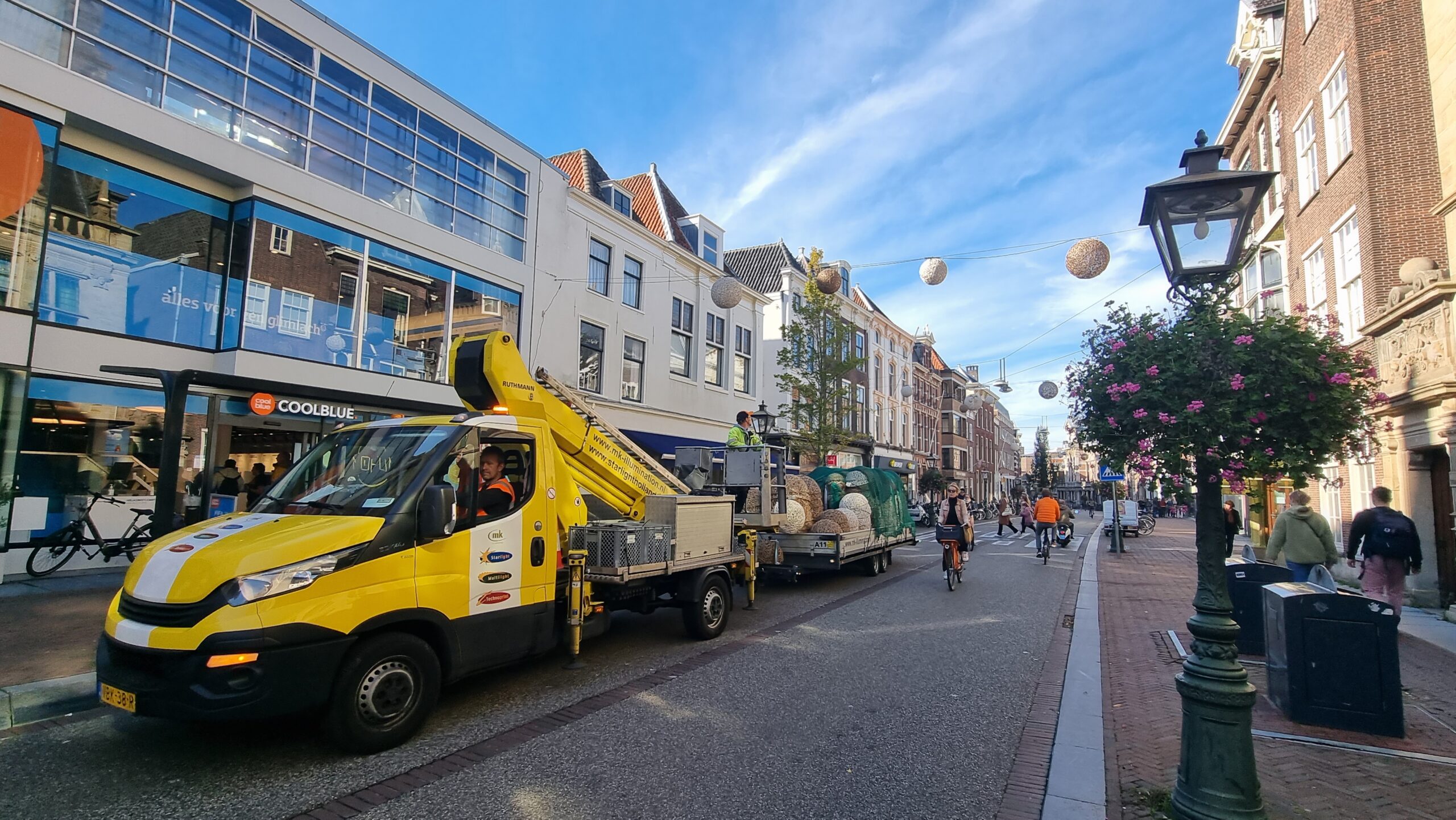 De winter is in aantocht en dus wordt in het centrum van Leiden ook weer de feestverlichting opgehangen. De bollen met daarop de afbeelding van de Leidse sleutels zijn inmiddels allemaal voorzien van LED-verlichting.