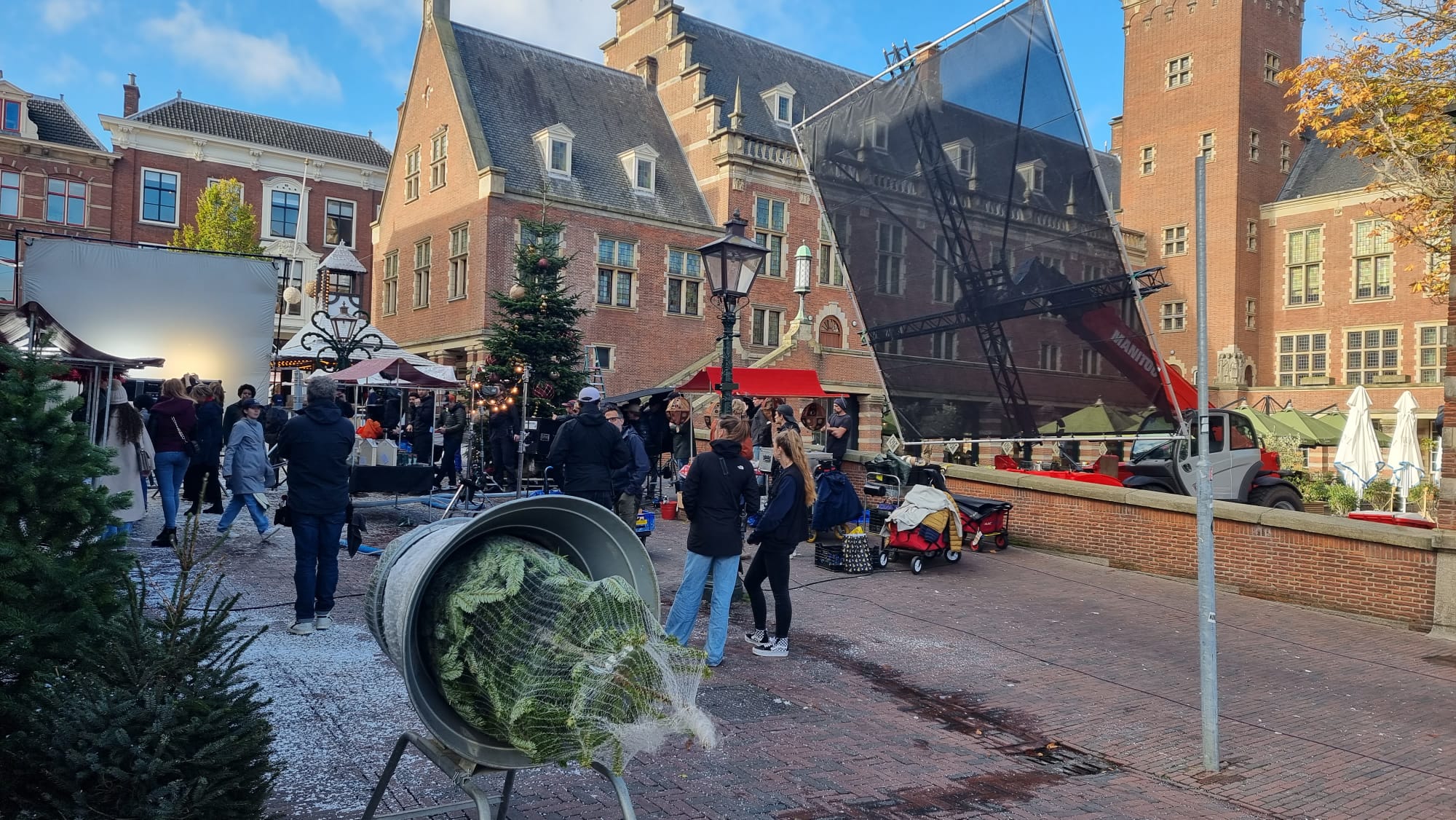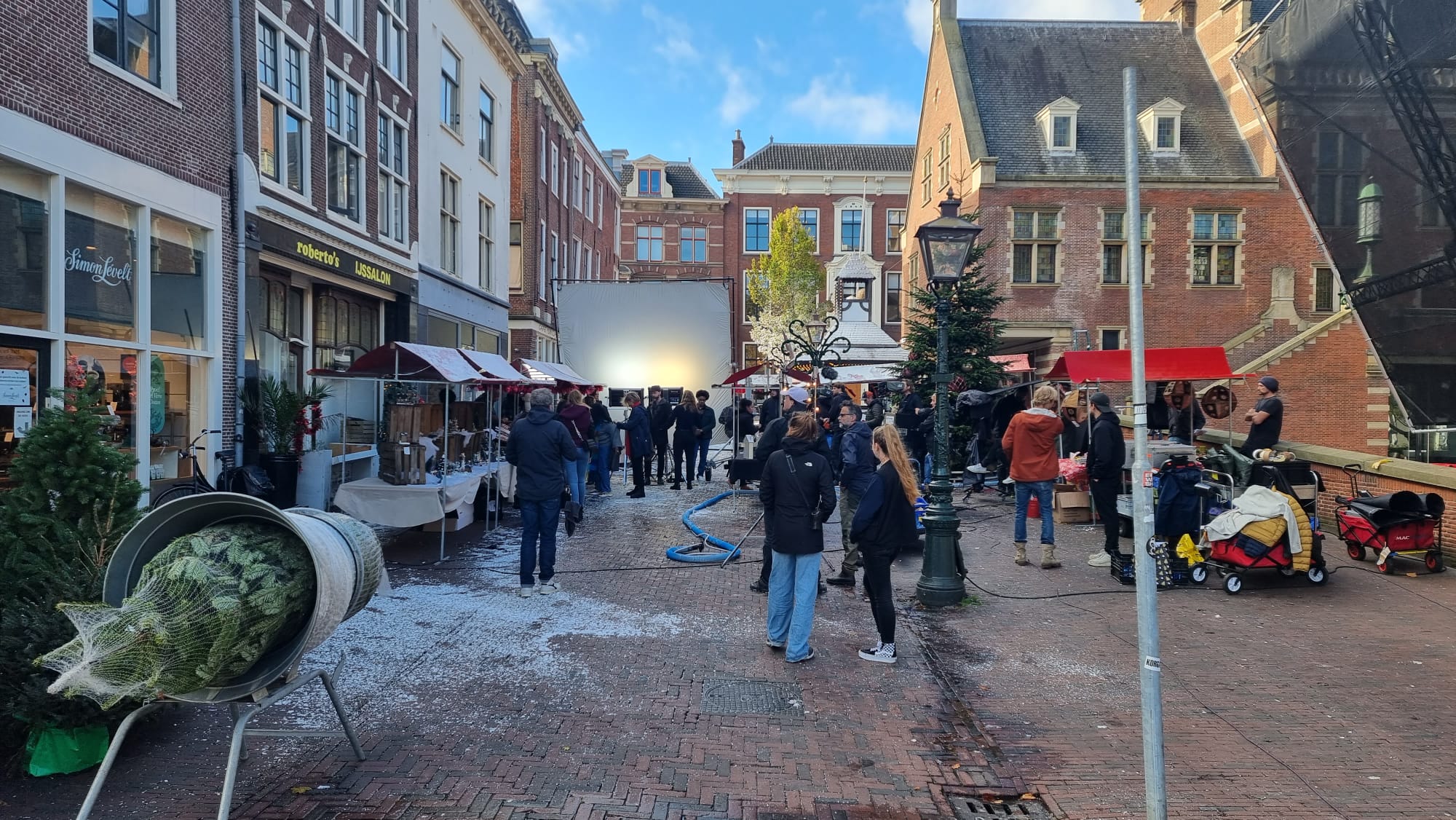 De omgeving van het Leidse stadhuis is maandagochtend gehuld in winterse taferelen. Veel sneeuw, kerstverlichting in kerstbomen en een kerstmarkt werden ingezet om een reclamespot op te nemen. Webwinkel Bol.com blijkt het oude centrum van Leiden als decor te gebruiken voor de opname van haar kerstcommercial.