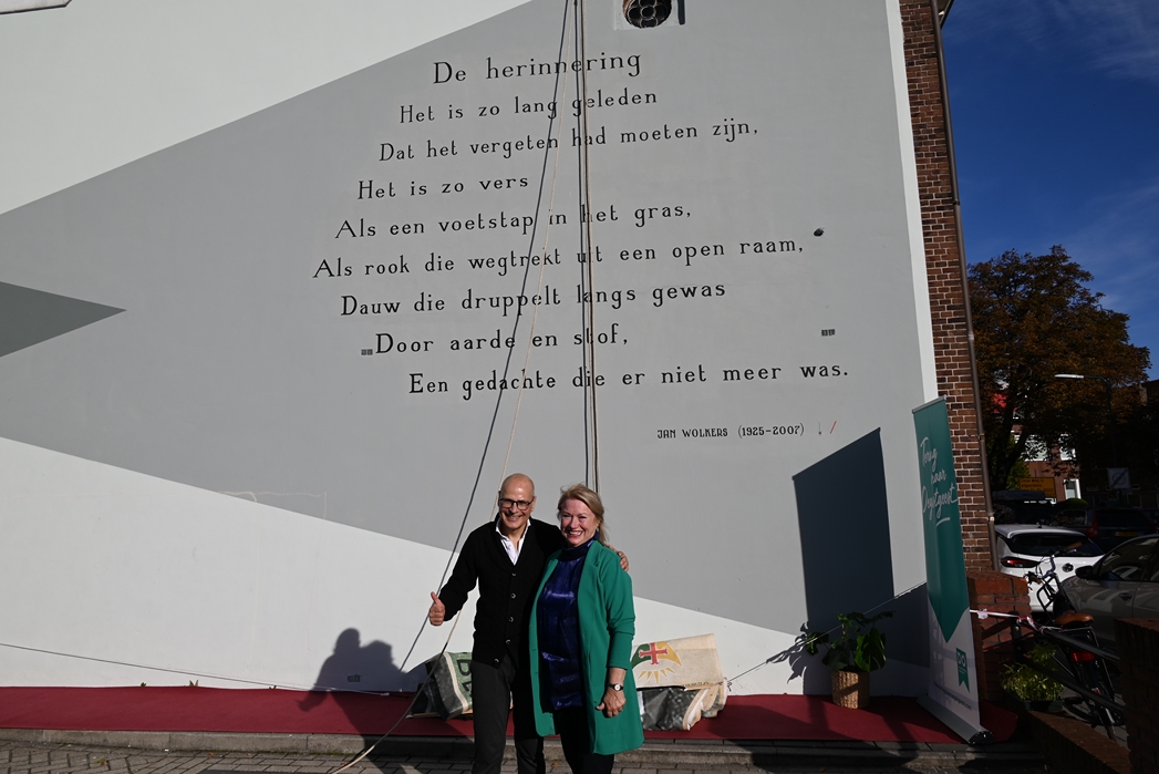 “Het was niet de bedoeling om vijf jaar na de onthulling hier weer te gaan staan”, vertelt Marjolein van der Jagt van Marketing Oegstgeest. “Het was diepe droevenis”, aldus Jetteke Bolten van Cultuurfonds Oegstgeest. De muur bleek niet van de juiste kwaliteit om het muurgedicht De Herinnering van Jan Wolkers aan te brengen. In vijf jaar tijd was er weinig meer van over. Vorige week werd het daarom na een grondige restauratie opnieuw onthuld.