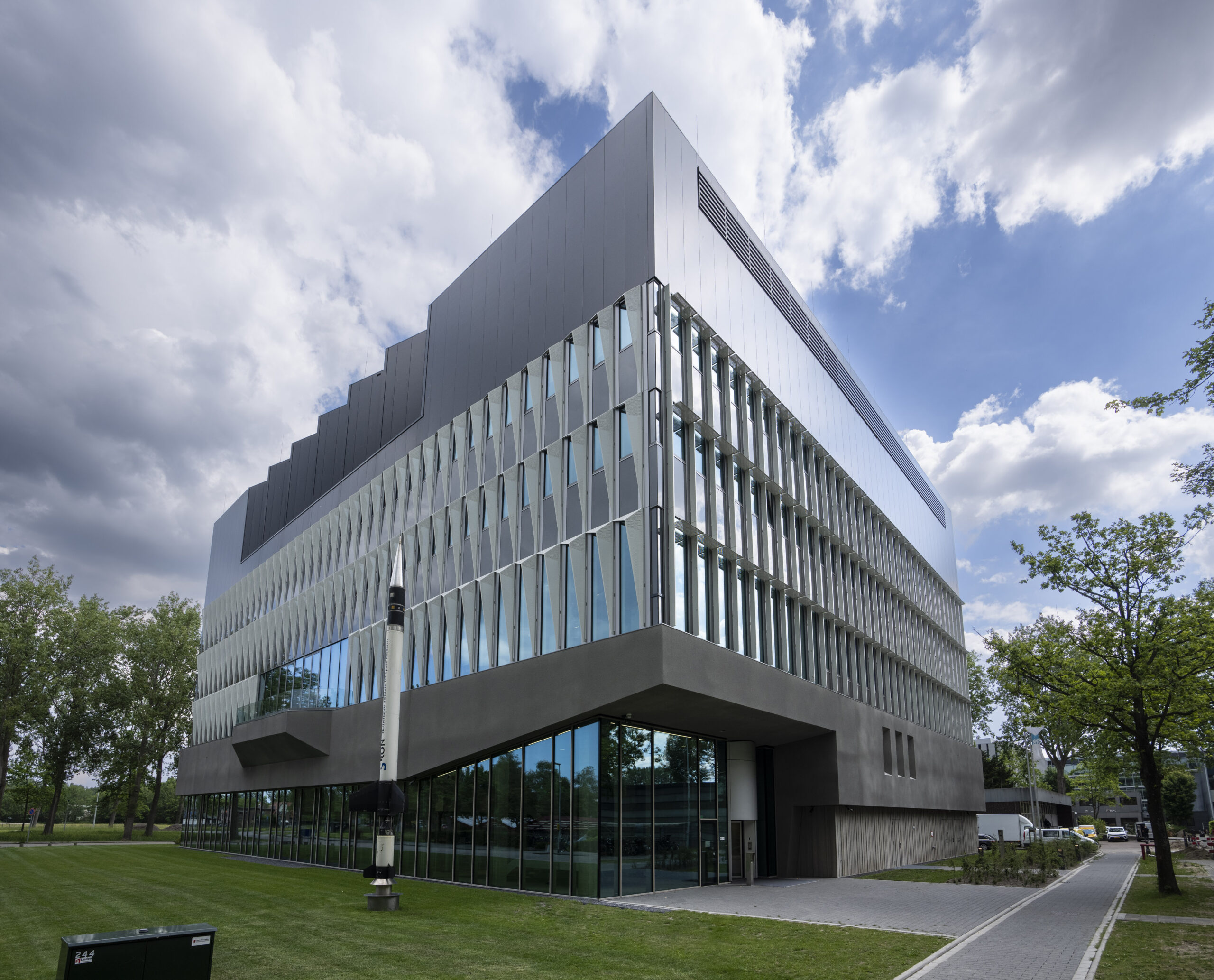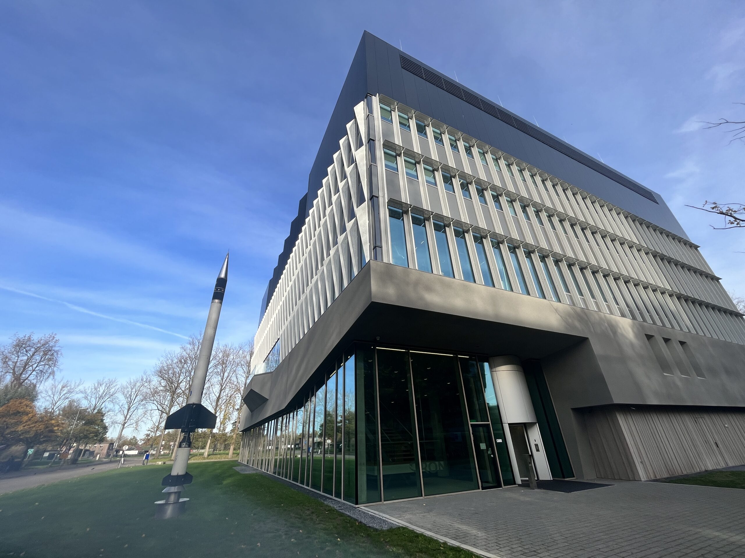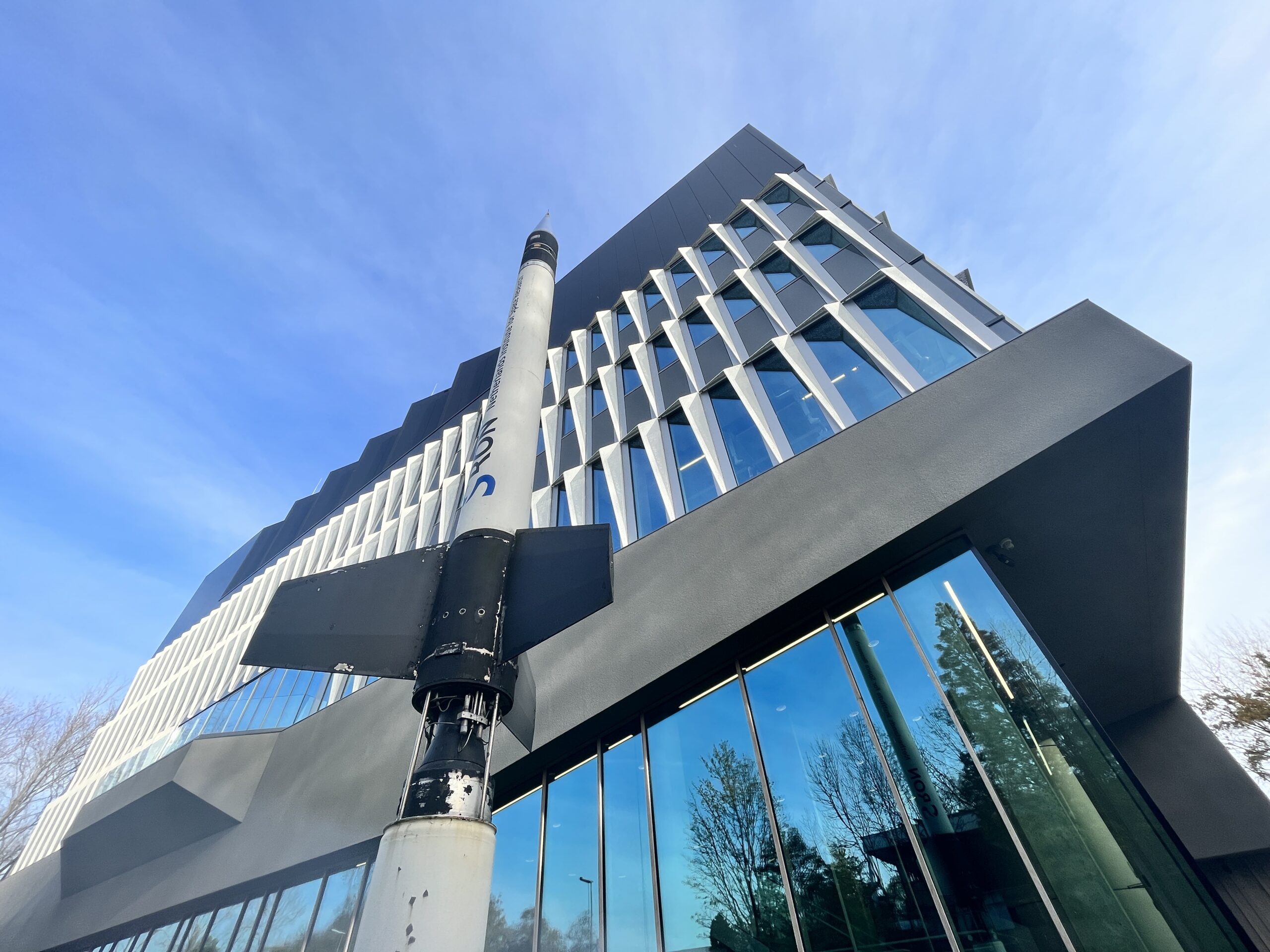 Het nieuwe, futuristisch ontworpen hoofdgebouw van SRON staat aan de Niels Bohrweg in Leiden. Een oude raket voor de deur laat zien dat hier gewerkt wordt in hogere sferen. Eigenlijk zou het gebouw waar 140 mensen werken in januari al geopend worden door de koning, maar dat ging wegens corona niet door. In plaats daarvan organiseert SRON nu een open dag voor de media.