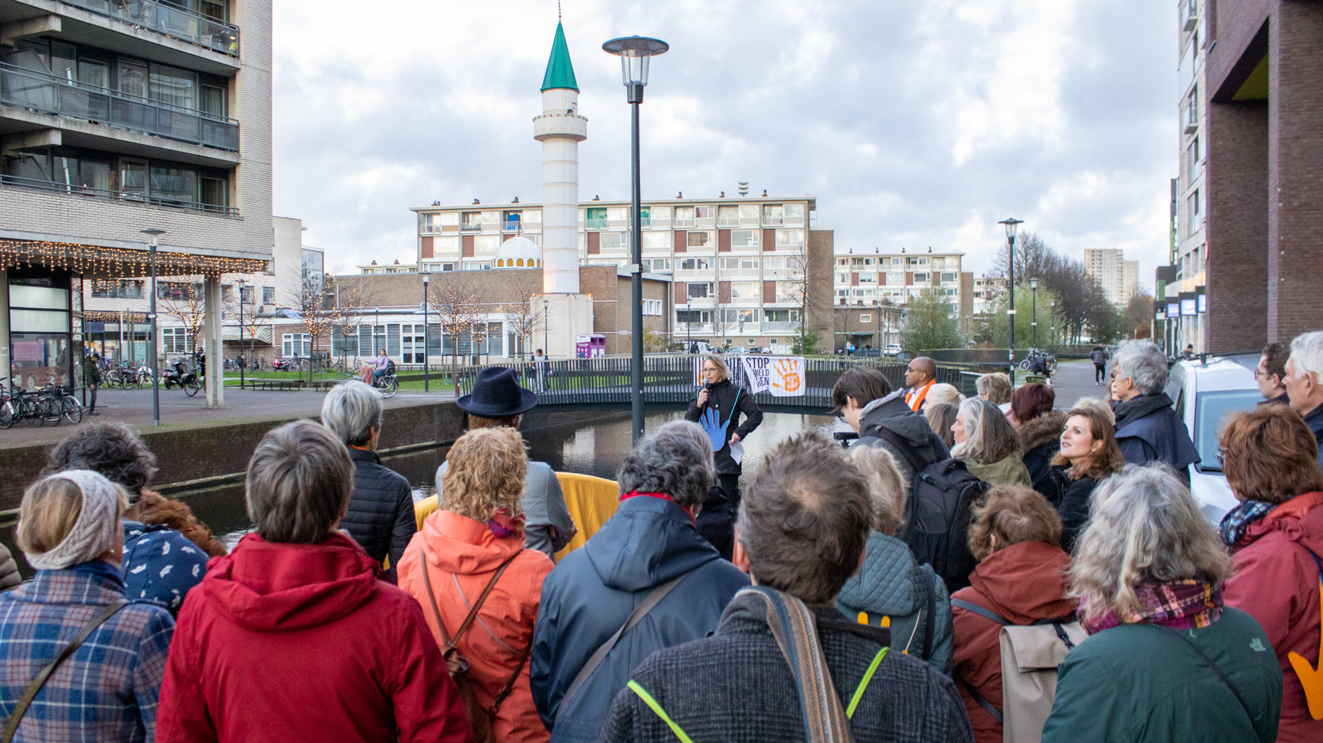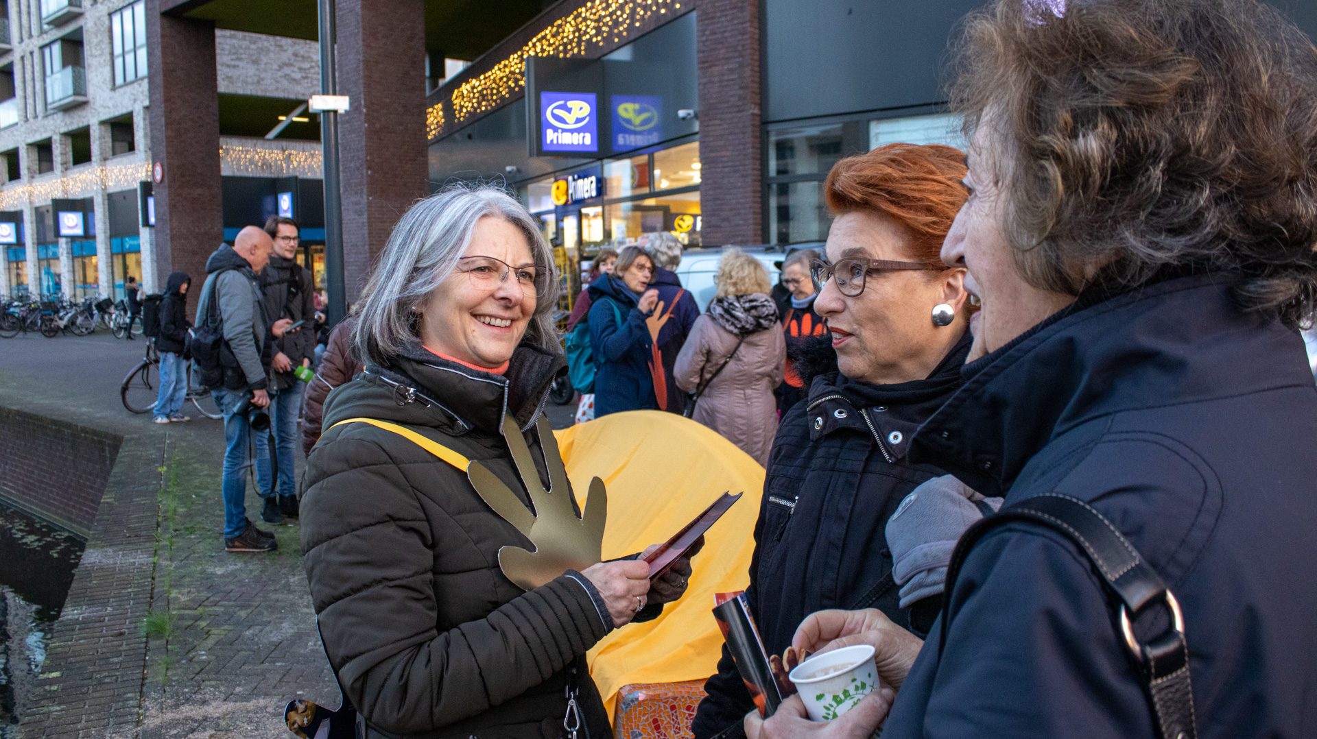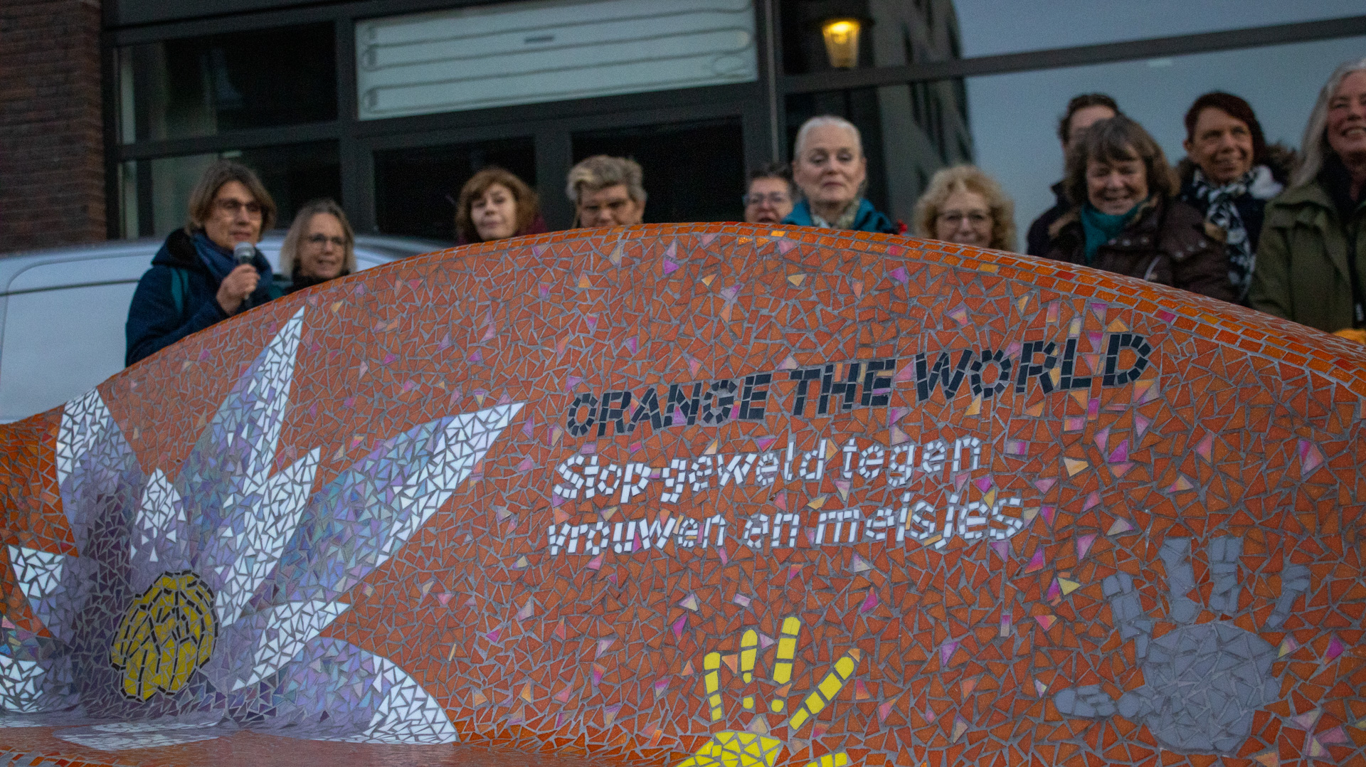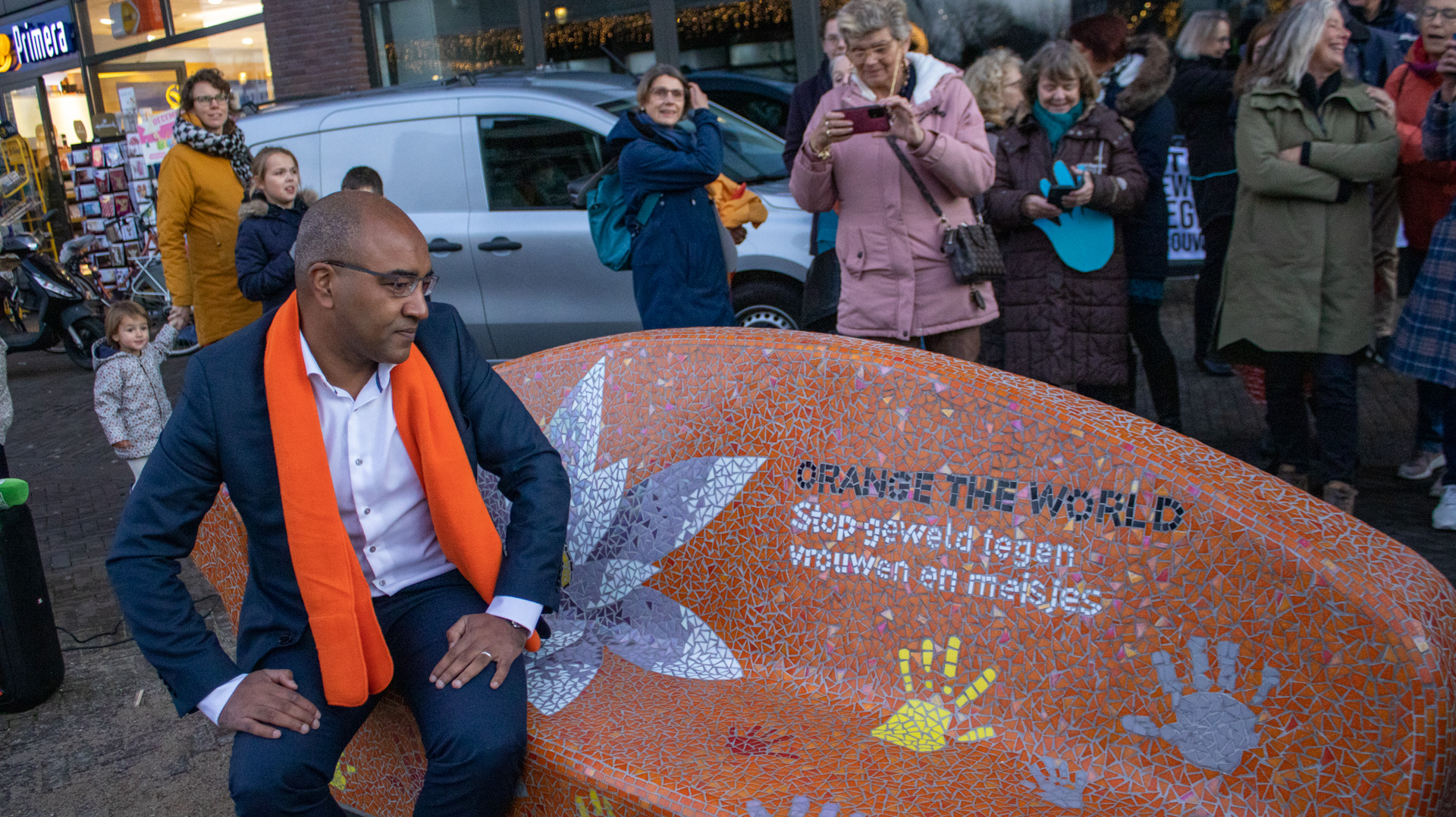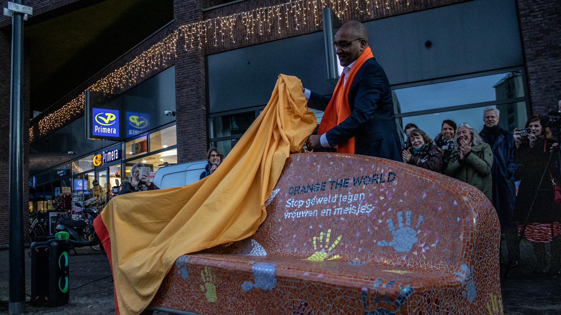 Het verlichten van de moskee werd vrijdagmiddag voorafgegaan door de onthulling van een heuse ‘Orange the World Social Sofa’ op het Kooiplein. Wethouder Abdelhaq Jermoumi nam het bankje, dat is gemaakt door de Soroptimistclub Leiden Aurora, officieel in gebruik.