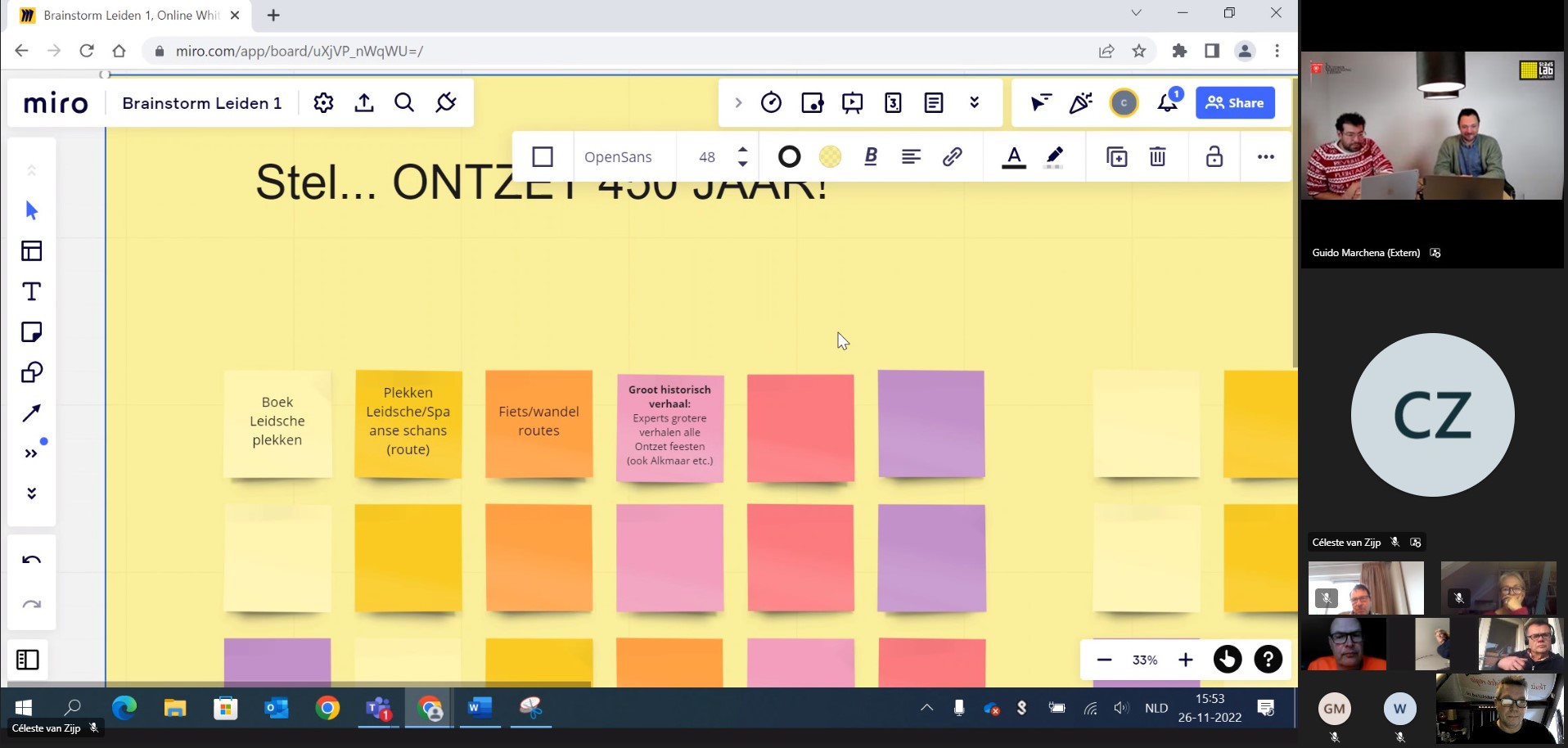 Degenen die er wel bij waren, lieten overigens wel volop van zich horen en dus kan Guido Marchena die het jubileumjaar coördineert, de komende tijd vooruit met het uitzoeken hoe realistisch en wenselijk de opgeworpen plannen zijn. Iedereen kon de gedachten de vrije loop laten. Marchena leidde de meedenksessie in met de woorden dat iedereen zich maar moest voorstellen de baas van Leiden te zijn en ook van de 3 October Vereeniging. “Oh ja, en geld speelt geen rol.”