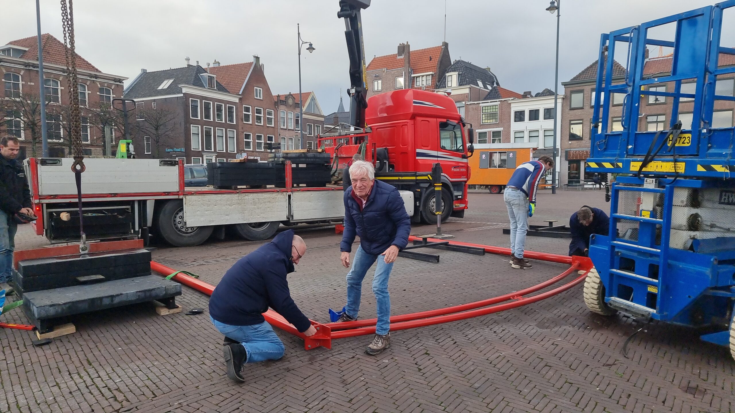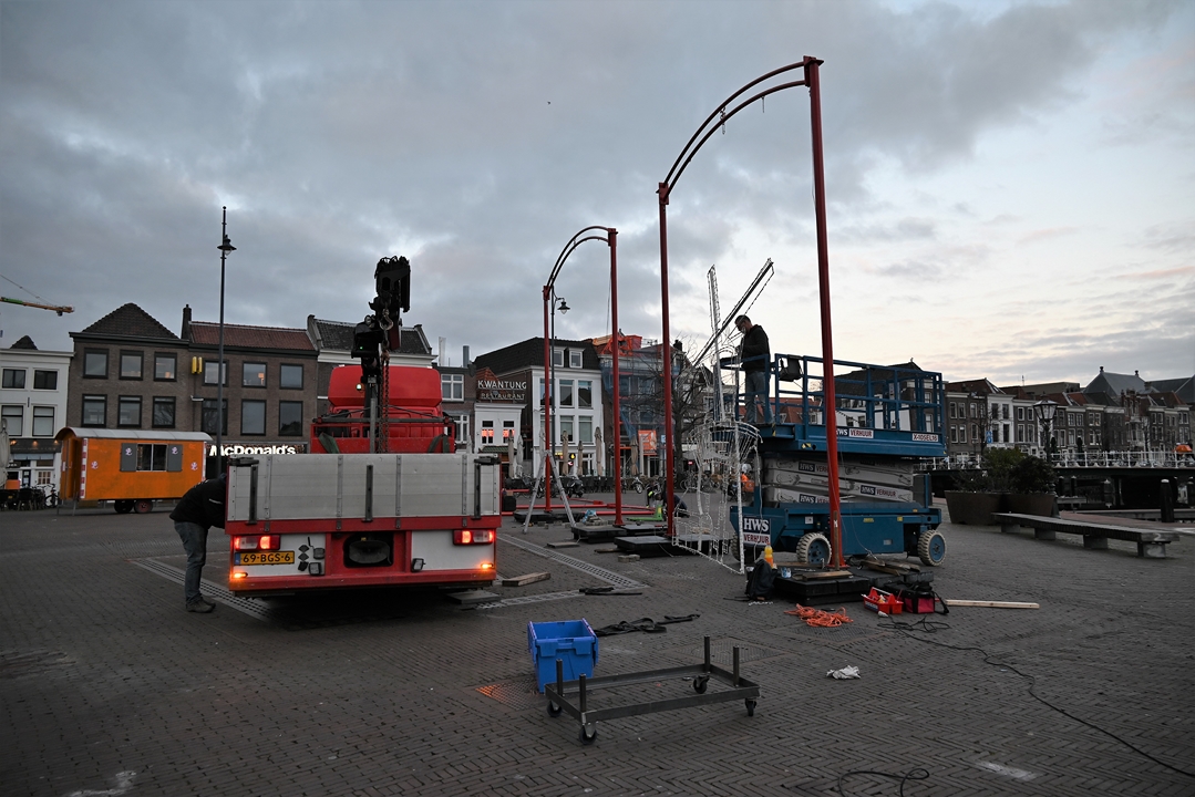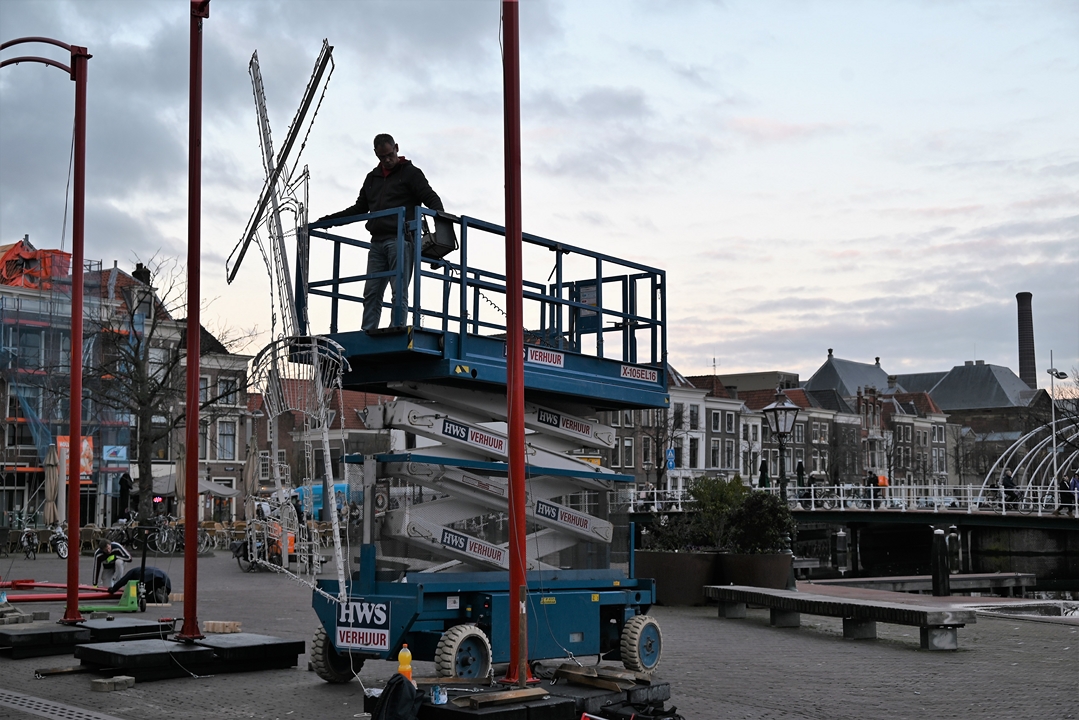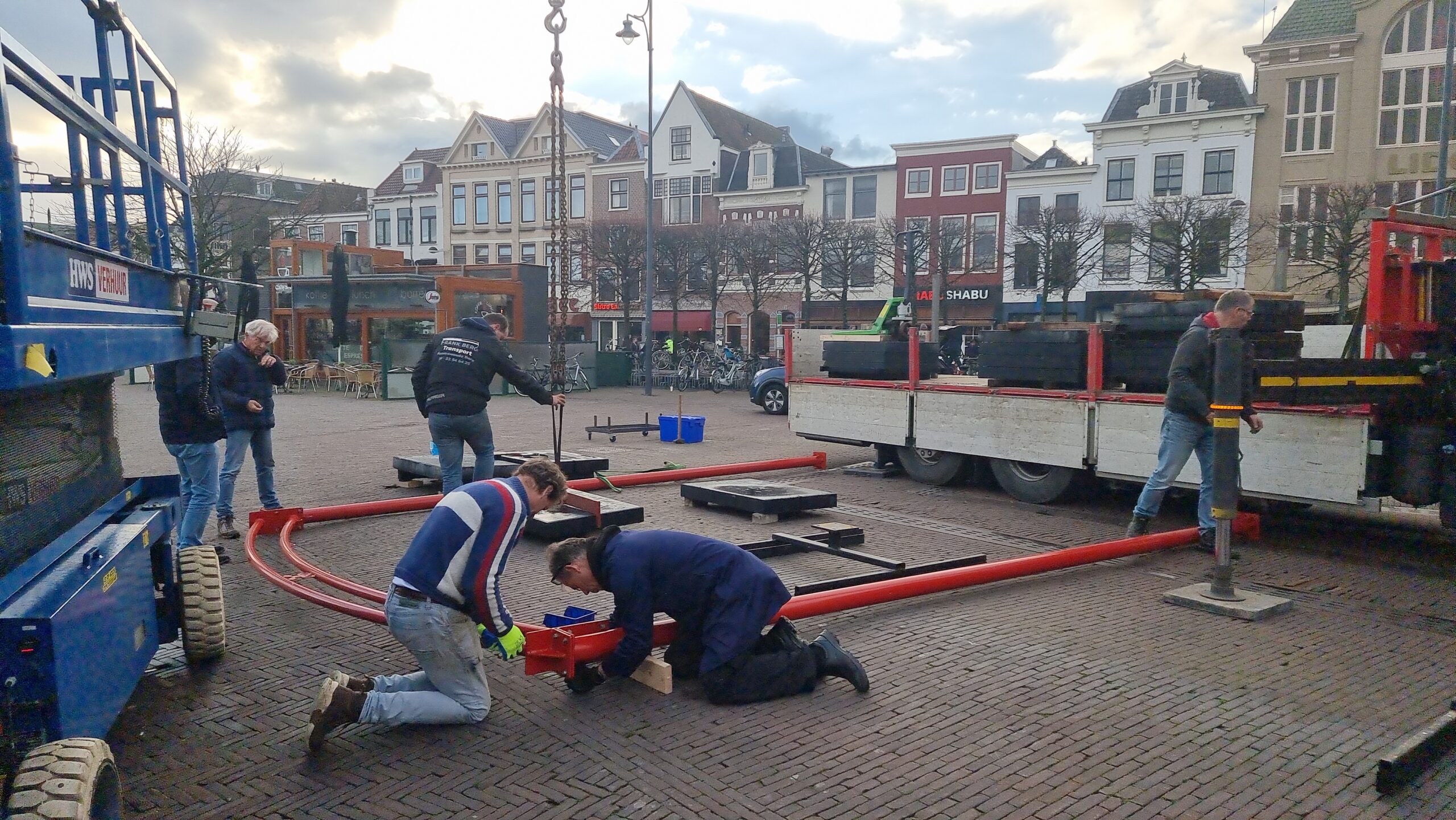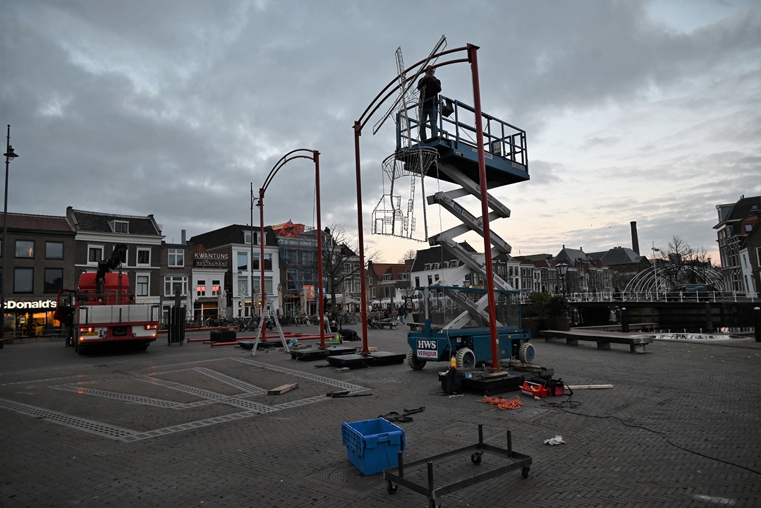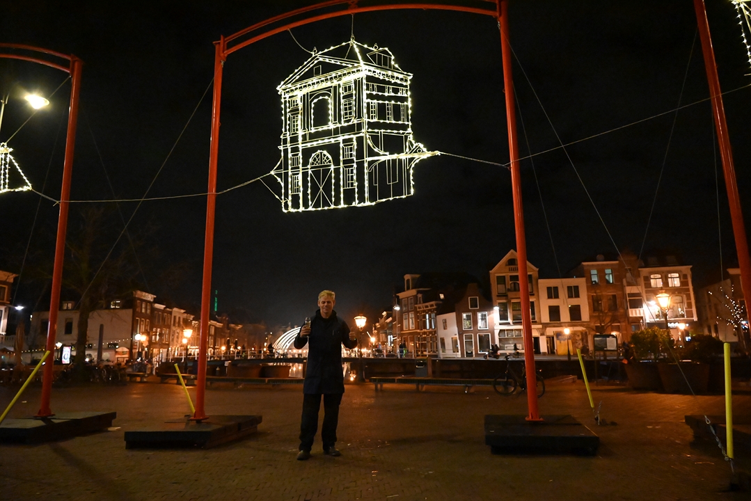 Dinsdagmiddag begon Haasbroek samen met broer Arthur en wat hulp van vrienden met de opbouw van de enorme frames waar de verlichte kunstwerken in hangen. Einde van de middag kon als eerste Molen de Valk ontstoken worden. Rond 20.30 uur was alles klaar en werden alle figuren in het licht gezet. Ze blijven staan tot en met zondag 8 januari. Dat is de periode dat op het water van de Nieuwe Rijn ook de drijvende ijsbaan ligt.
