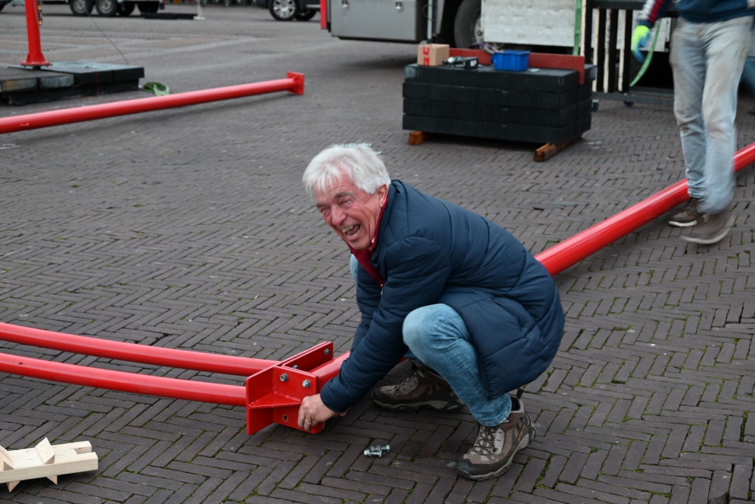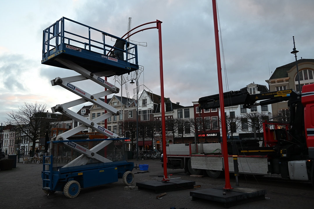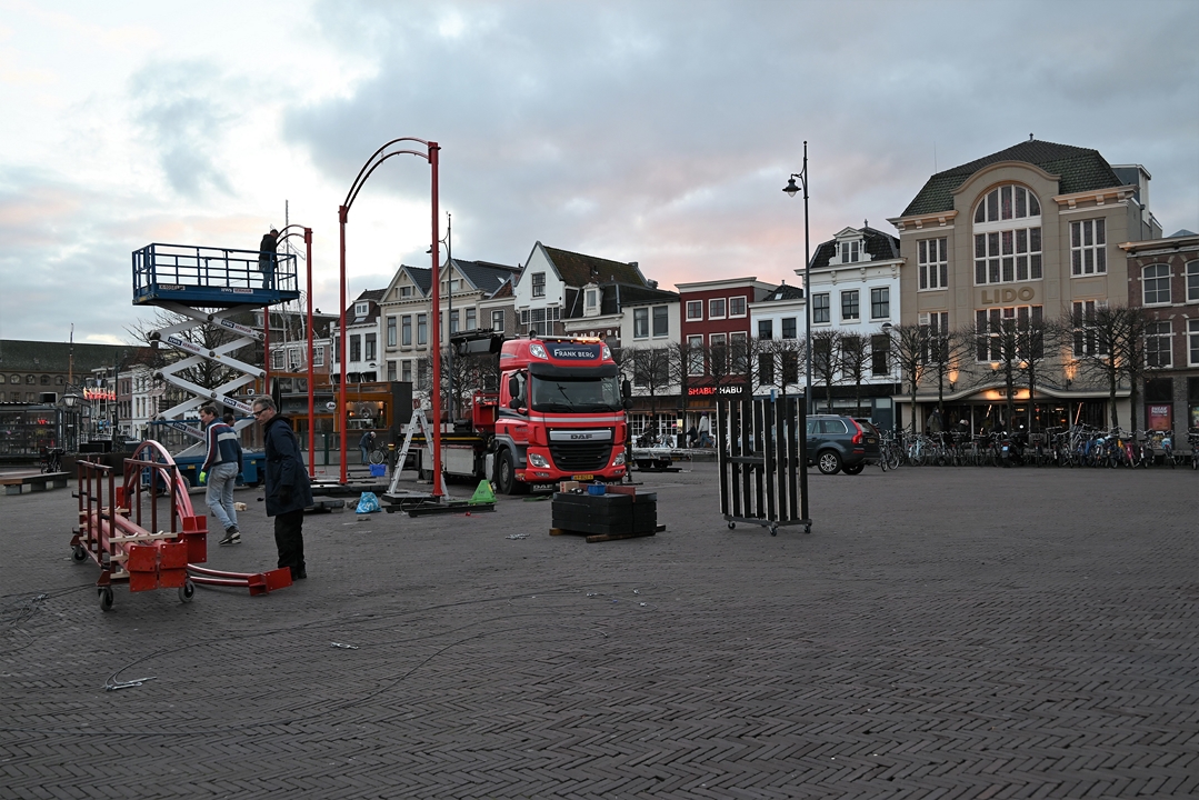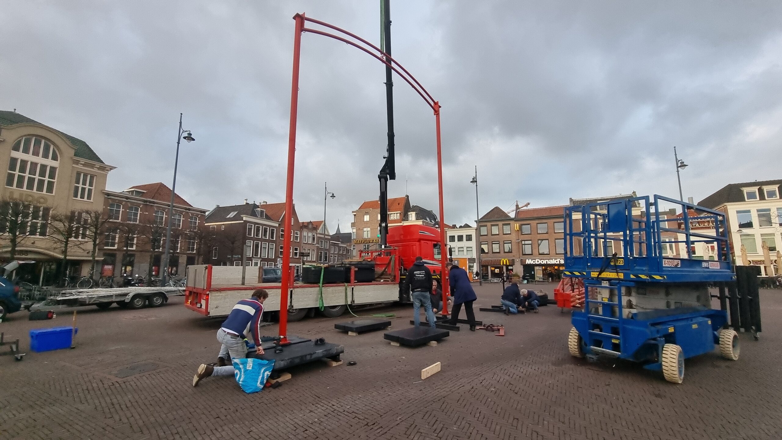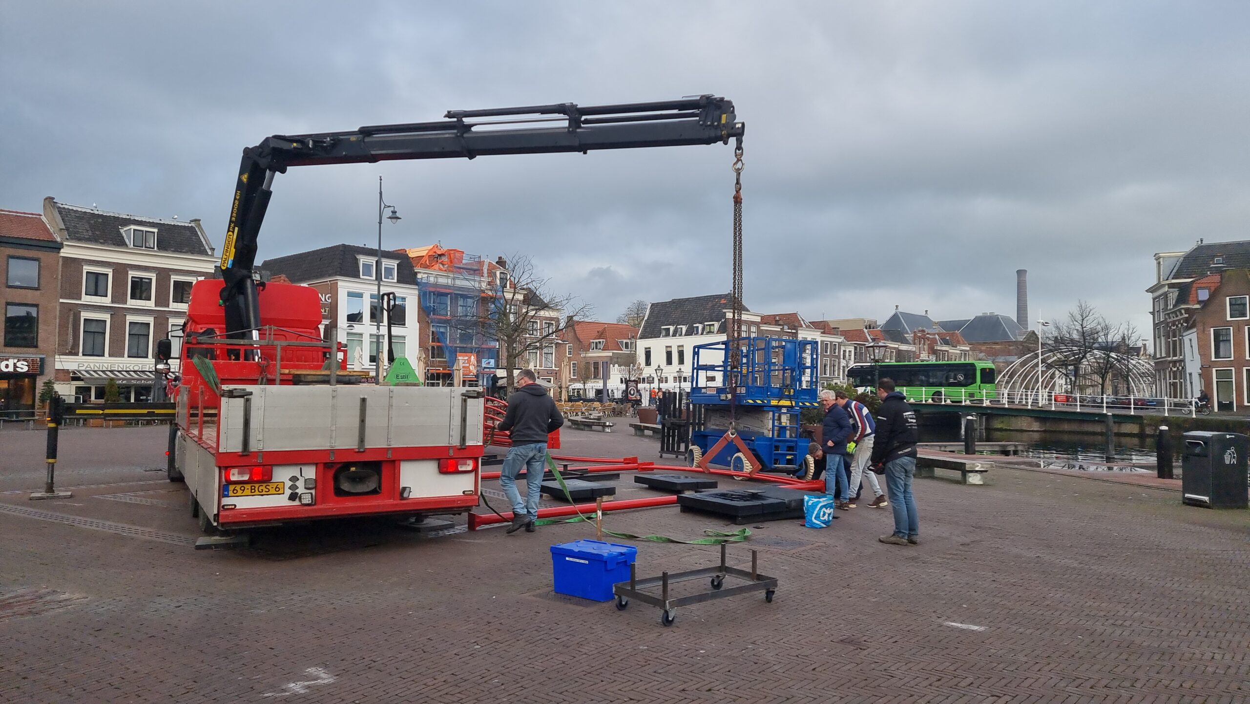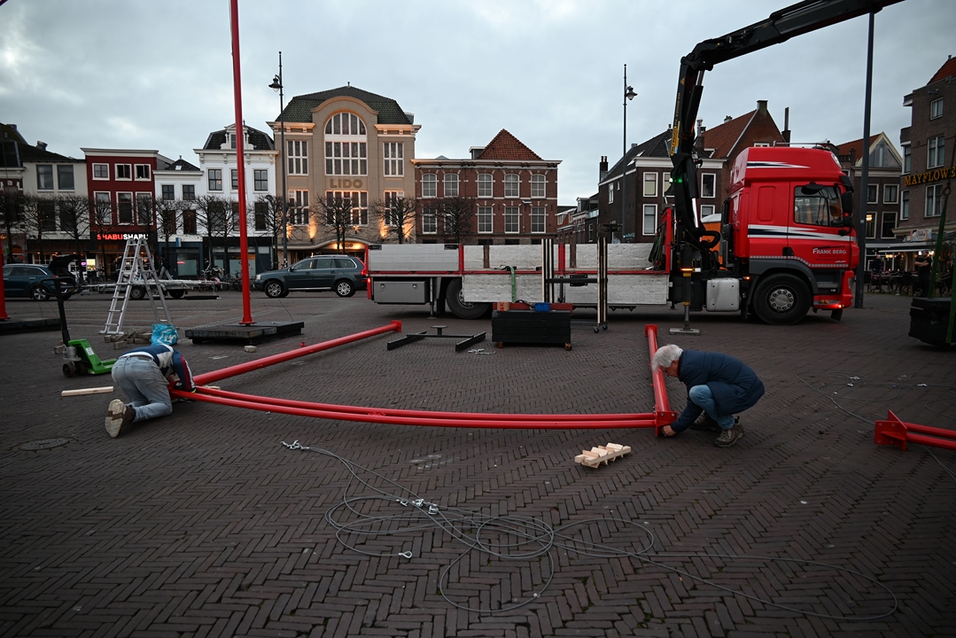 Dinsdagmiddag begon Haasbroek samen met broer Arthur en wat hulp van vrienden met de opbouw van de enorme frames waar de verlichte kunstwerken in hangen. Einde van de middag kon als eerste Molen de Valk ontstoken worden. Rond 20.30 uur was alles klaar en werden alle figuren in het licht gezet. Ze blijven staan tot en met zondag 8 januari. Dat is de periode dat op het water van de Nieuwe Rijn ook de drijvende ijsbaan ligt.