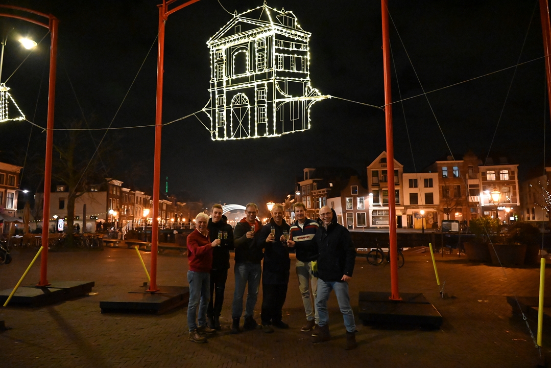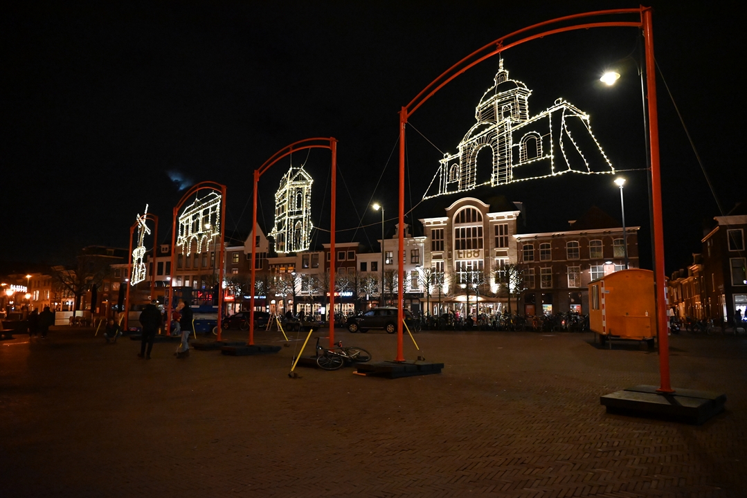 Skyline Leiden brandt weer. Leidenaar Edwin Haasbroek maakte de metalen figuren vorig jaar in opdracht van Centrummanagement Leiden voor extra sfeer in de winterperiode. Gisteren is het kunstwerk weer opgebouwd.