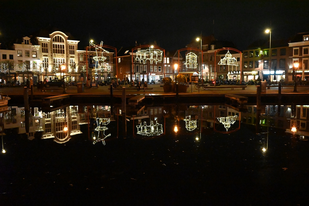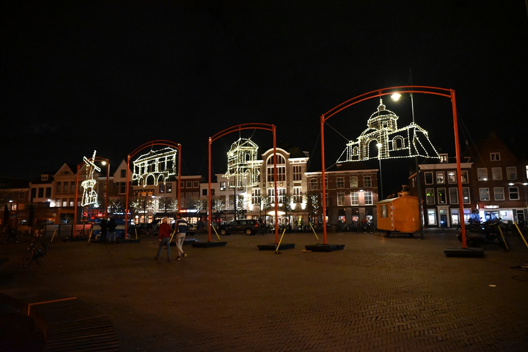 De vier verlichte ornamenten beelden een aantal herkenbare plekken in het centrum van Leiden uit en vormen zo als het ware de skyline van de binnenstad. Het gaat om Molen de Valk, de Koornbeursbrug, de Waag en de Morspoort.
