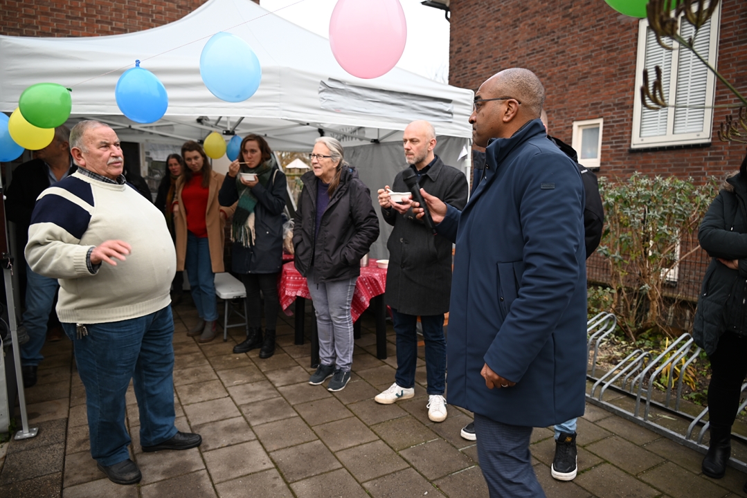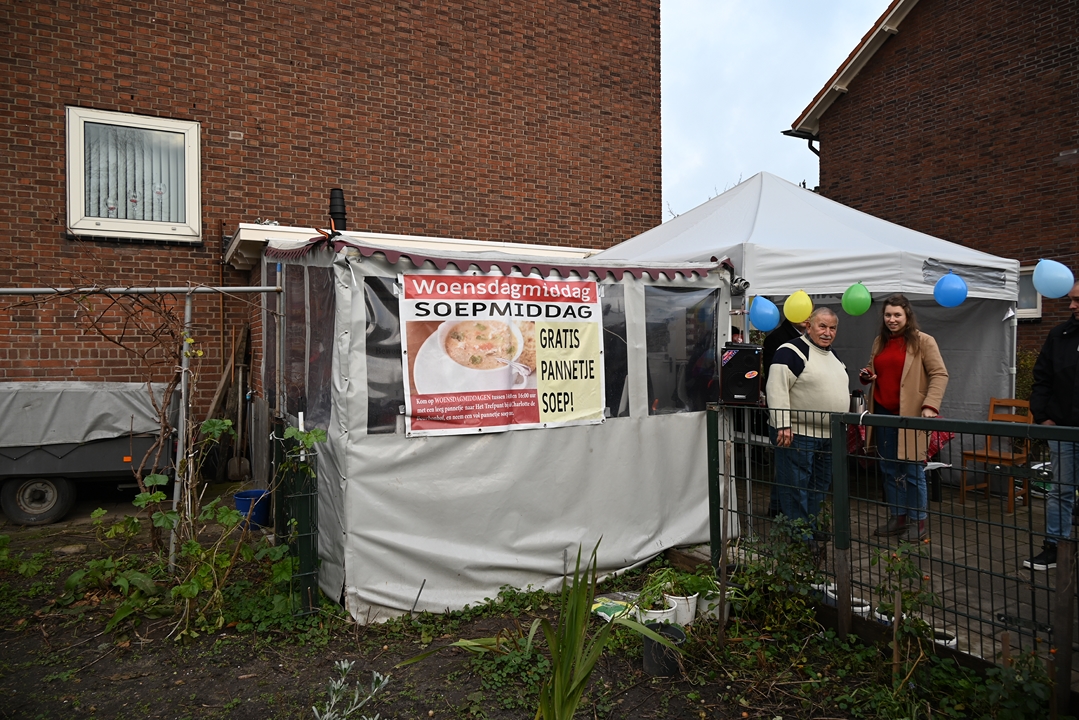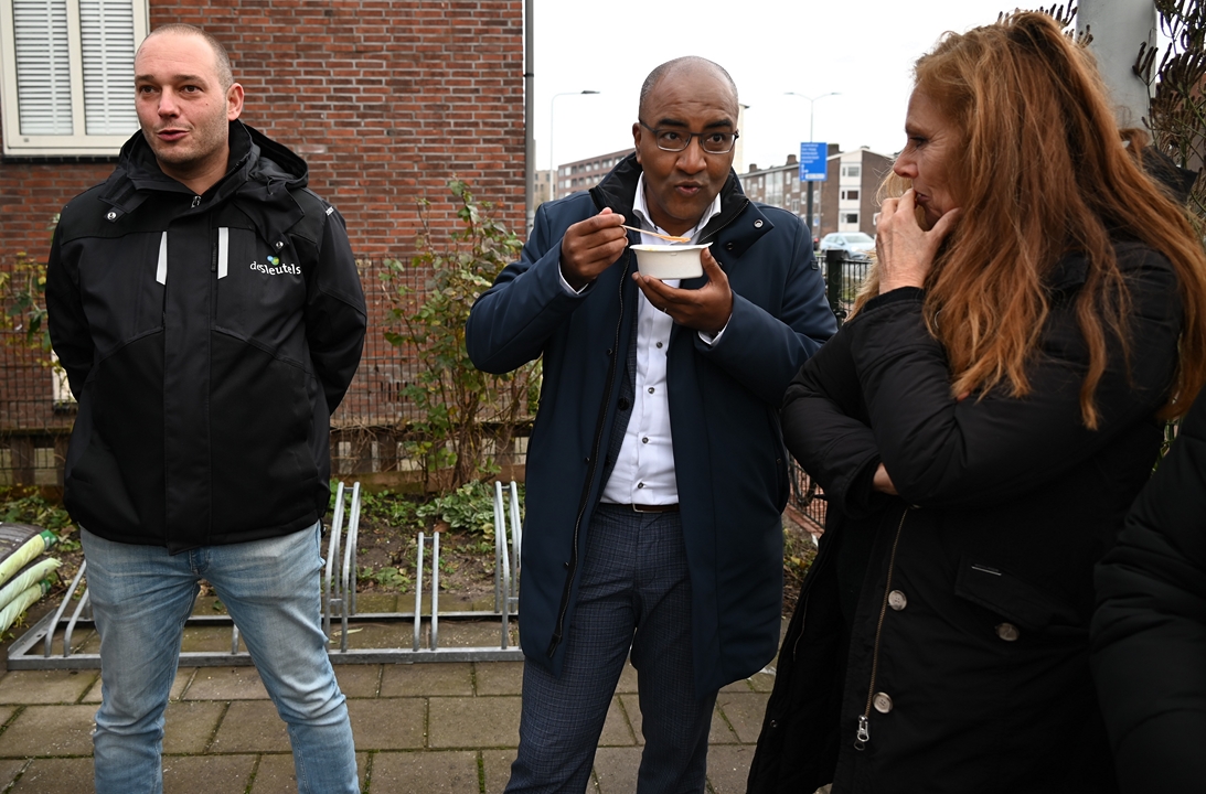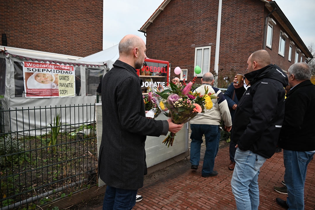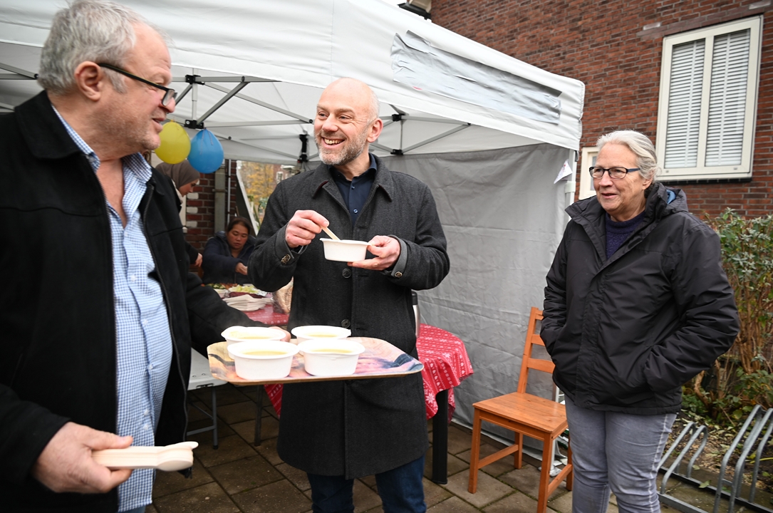 Buurtbewoners weten Trefpunt de Hoven bij de Charlotte de Bourbonhof al langer te vinden. Sinds een jaar of zes deelt Kundak wekelijks op woensdagmiddagen gratis soep uit. Die soep was er ook bij de onthulling en voor de gelegenheid in extra grote hoeveelheden.