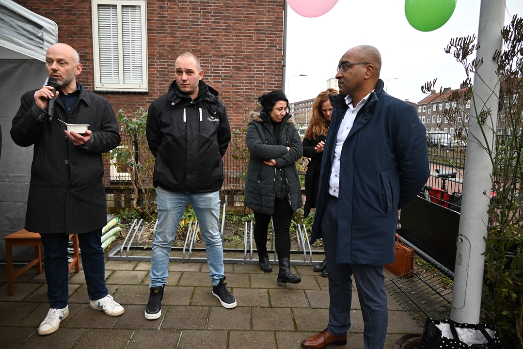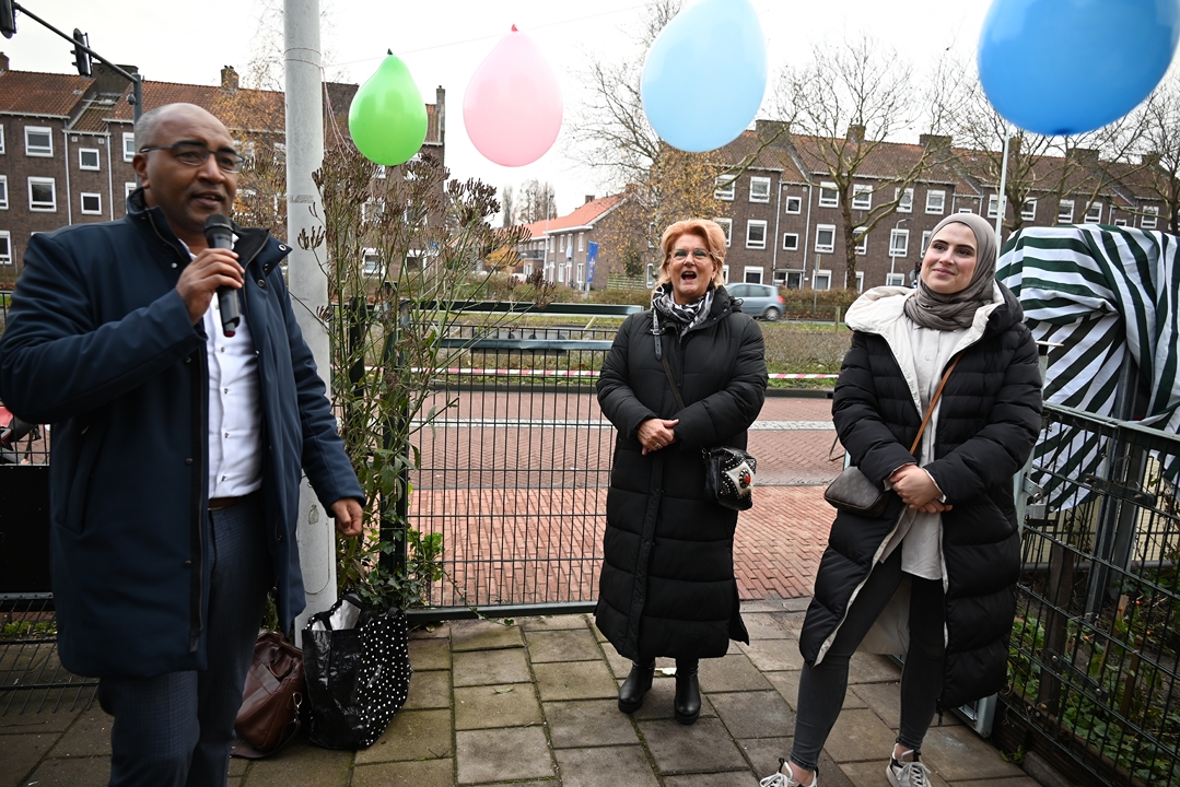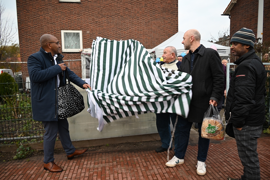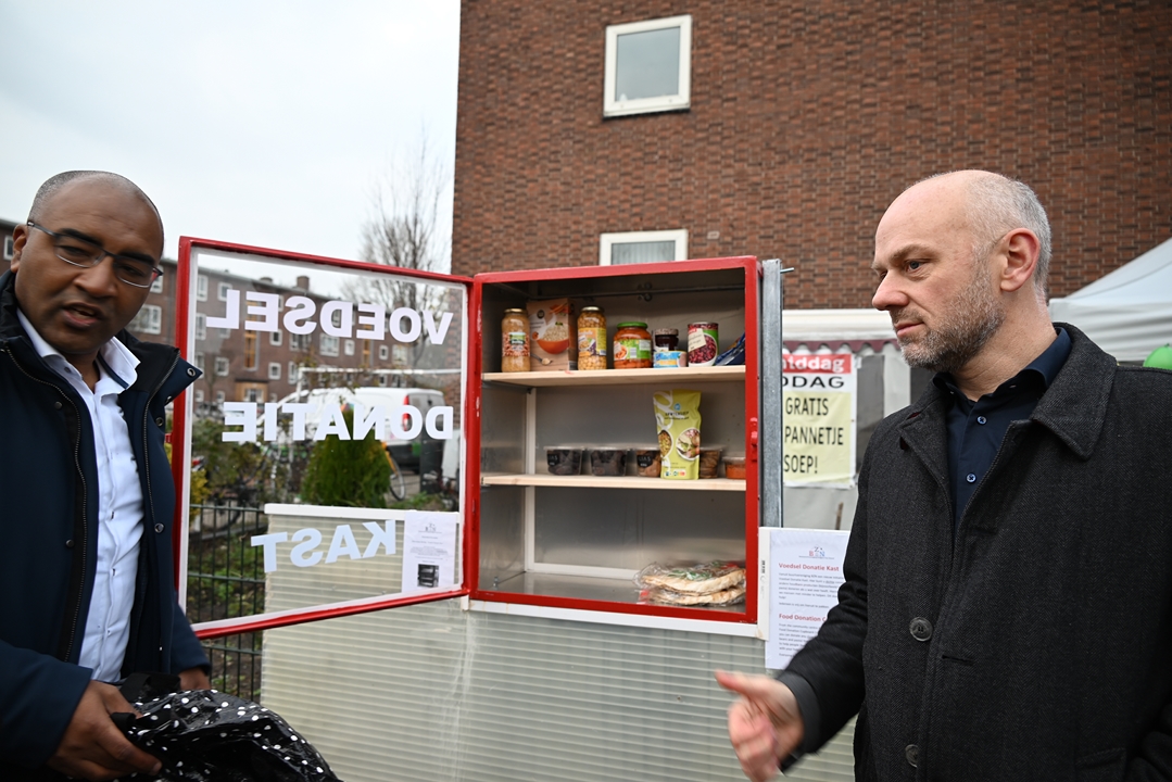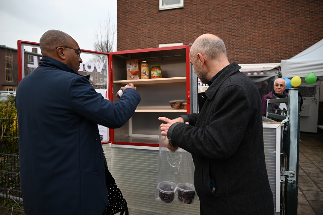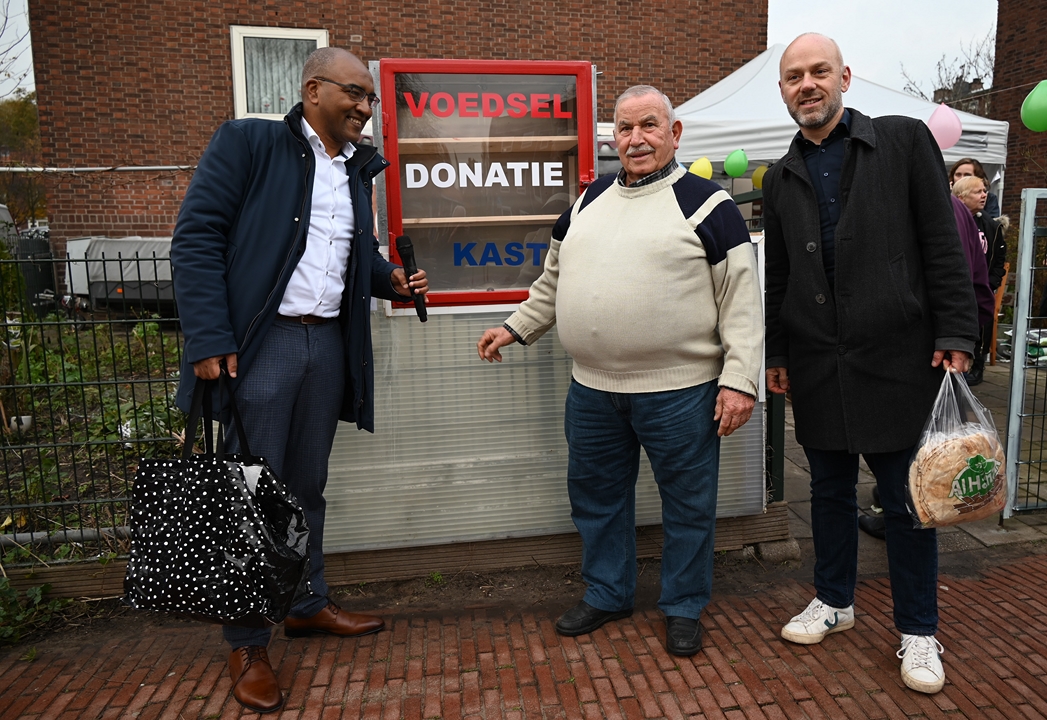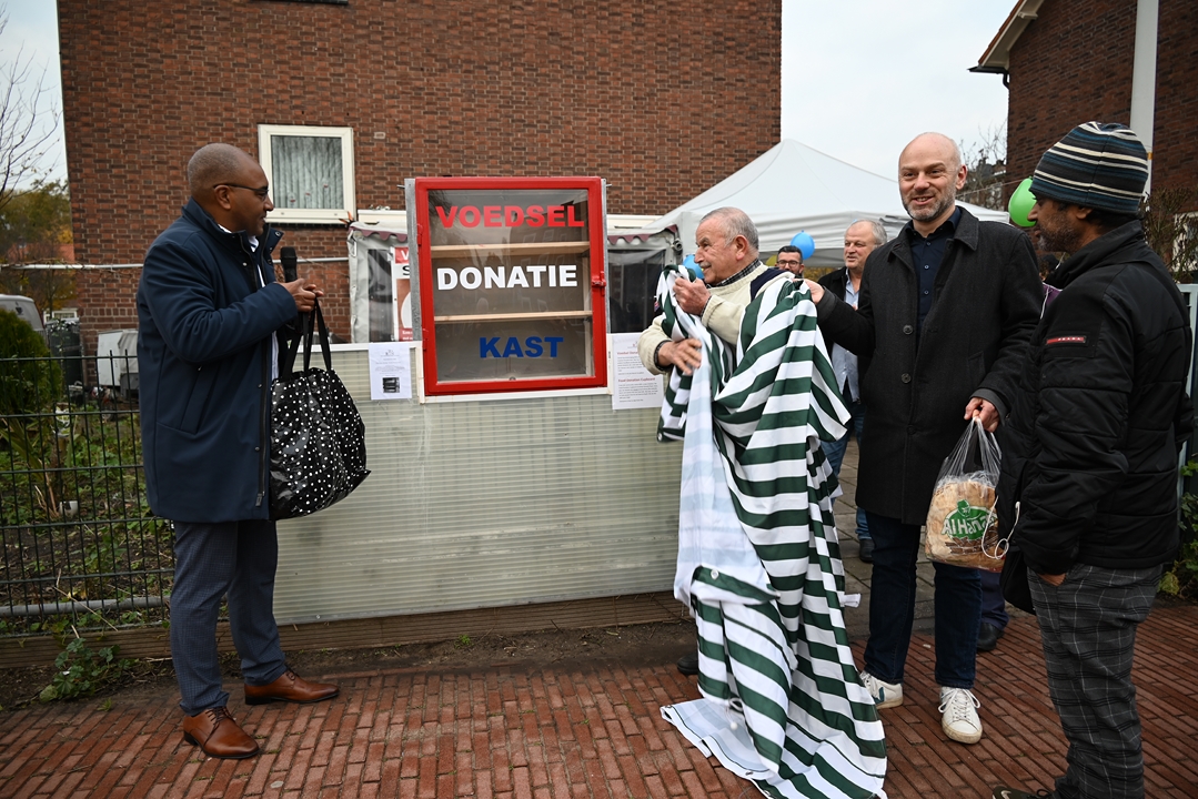 De voedselkast staat bij het onderkomen van de bewonersvereniging aan het Charlotte de Bourbonhof. Ongeveer naast de eerste flatwoning waar wethouder Abdelhaq Jermoumi als jongetje van vier in Leiden kwam wonen toen hij met zijn ouders naar Nederland kwam. De wethouder bedankte Ali Kundak van de ‘Zwijgers van Noord’ bij de onthulling: “Een mooi initiatief dat helaas in deze tijd hard nodig is.”