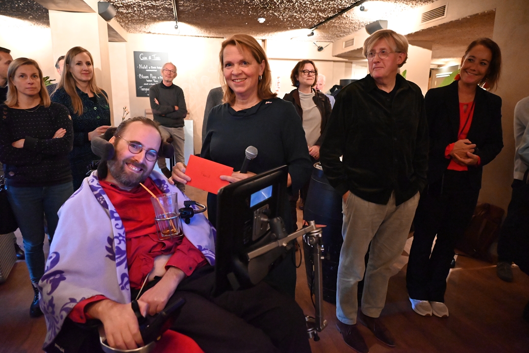Tevreden kijken de bewoners van het GewoonWonen-project om zich heen in hun nieuwe appartement. Het complex aan de Middelstegracht biedt zelfstandige huisvesting aan mensen met een progressieve spierziekte die dagelijks zorg nodig hebben. Donderdag was de oplevering.