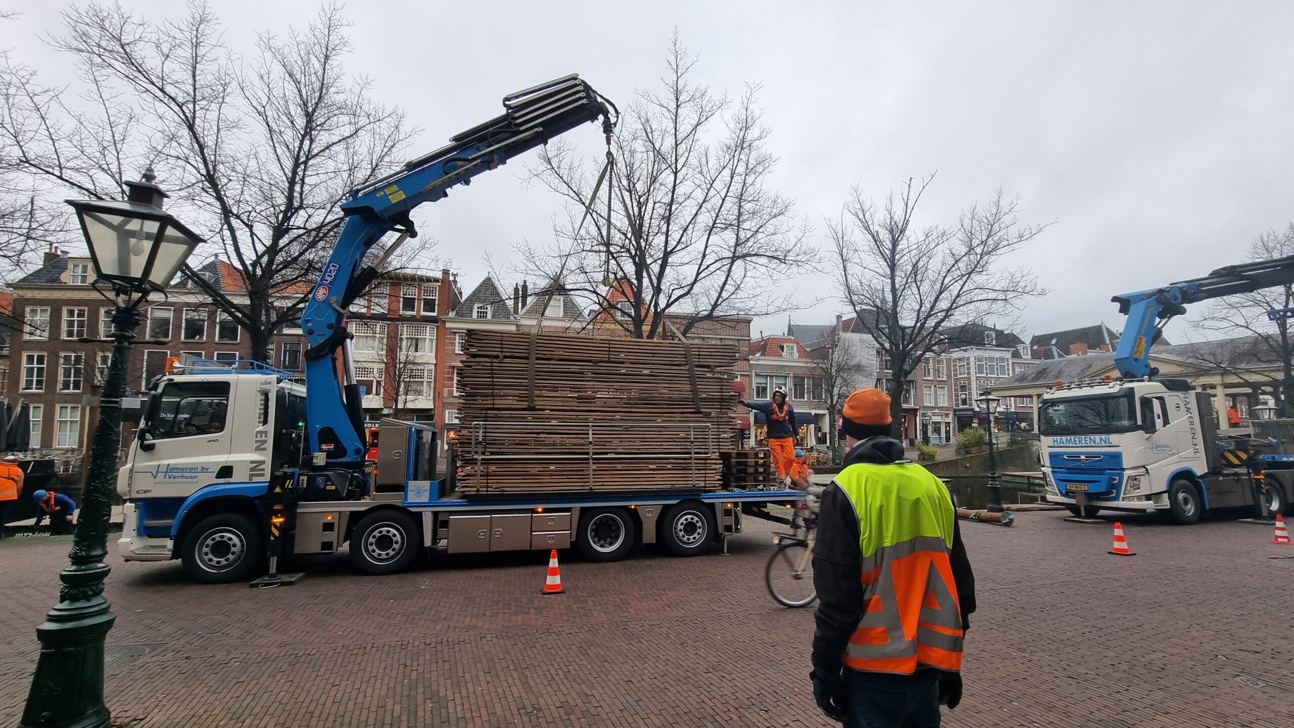 Nog een paar dagen en dan kan er weer geschaatst worden in het centrum van Leiden. Maandagmorgen is in alle vroegte de opbouw begonnen van de Drijvende IJsbaan die vrijdag open gaat.