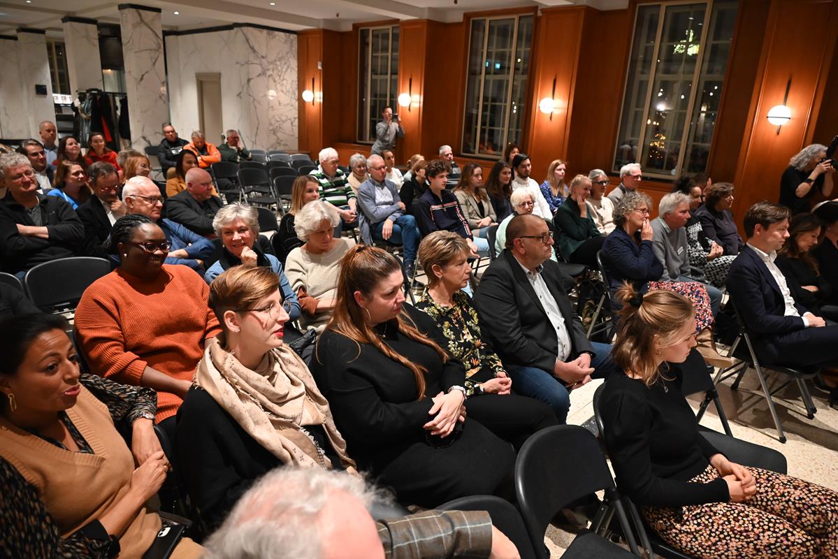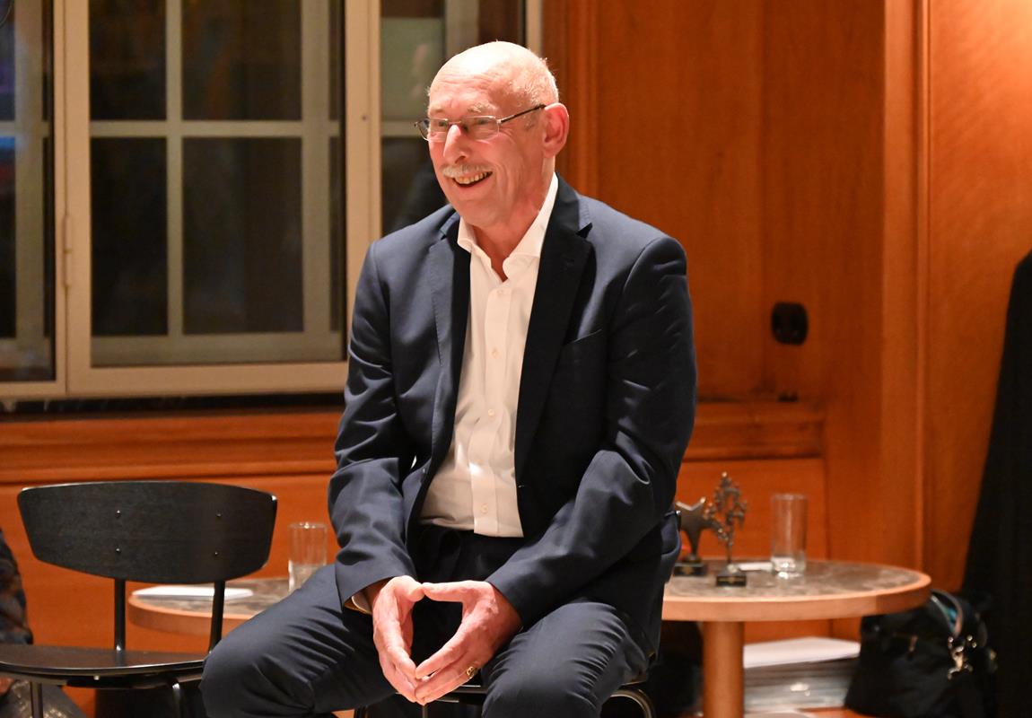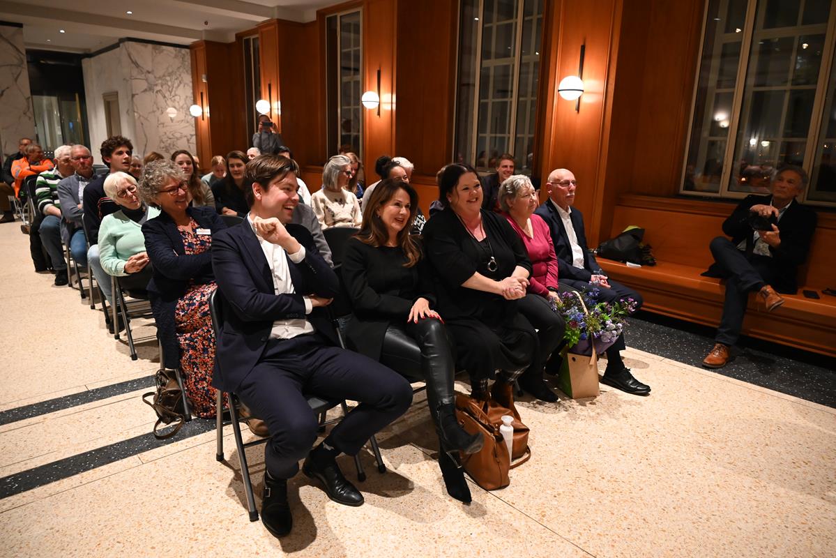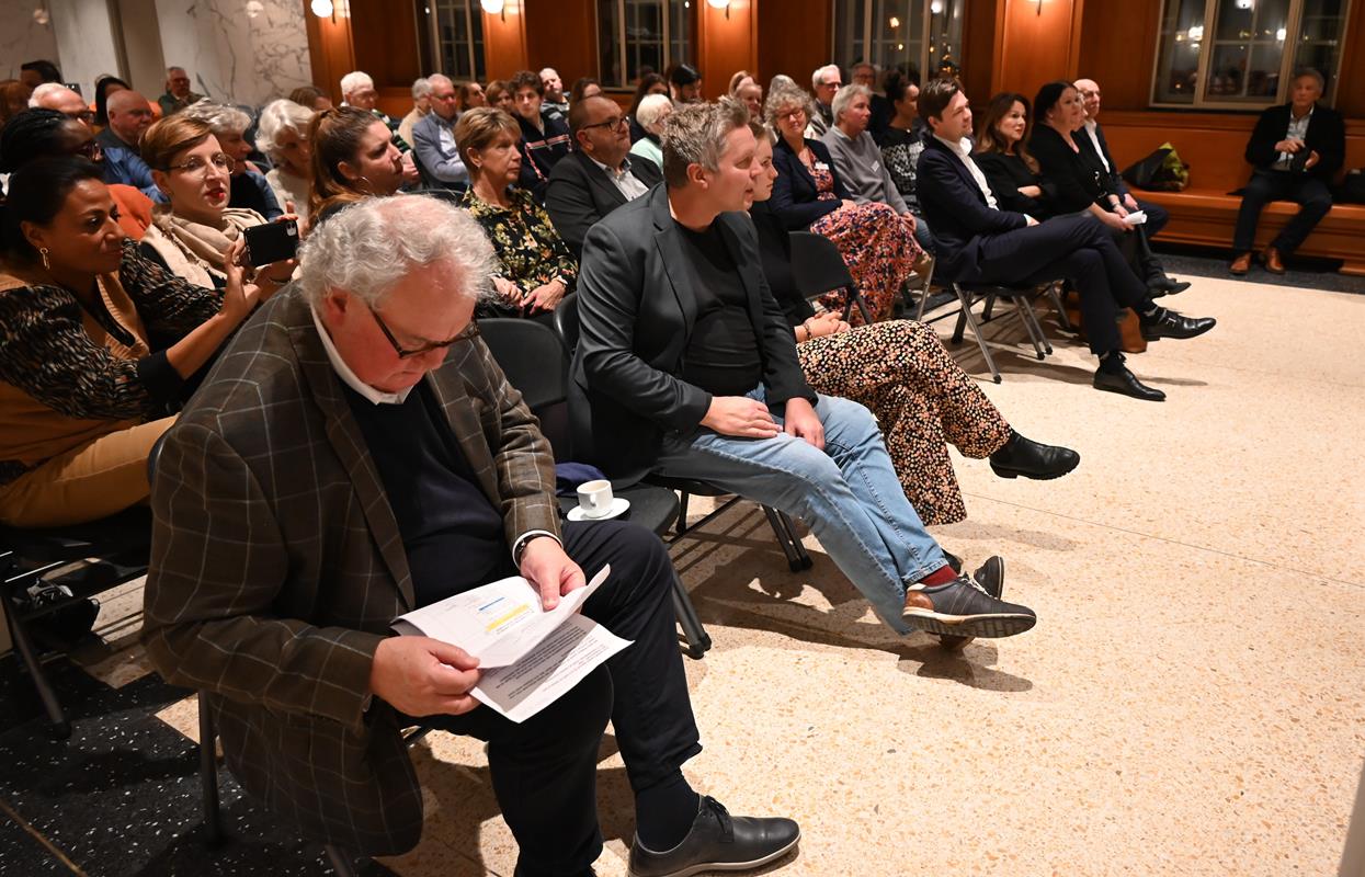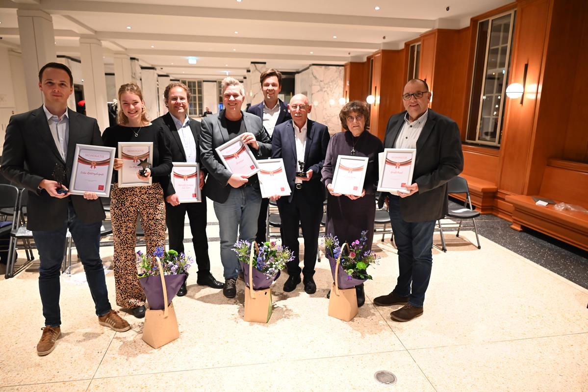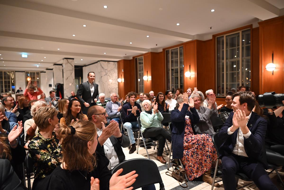 Verslaggever Casper Chaudron in gesprek met onder meer jurylid Claas Griffioen, Pieter Naber van de Leidse Reddingsbrigade en vrijwilliger van het jaar Nico Massaar.