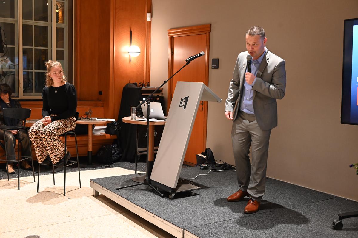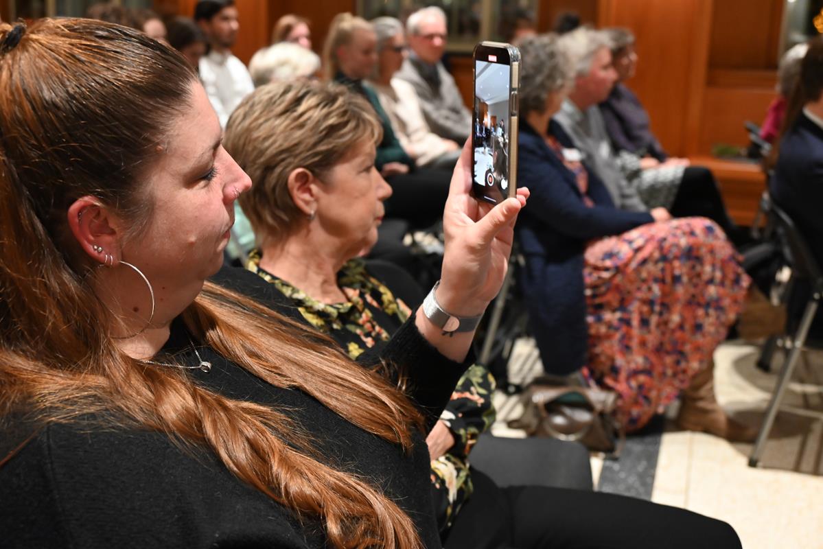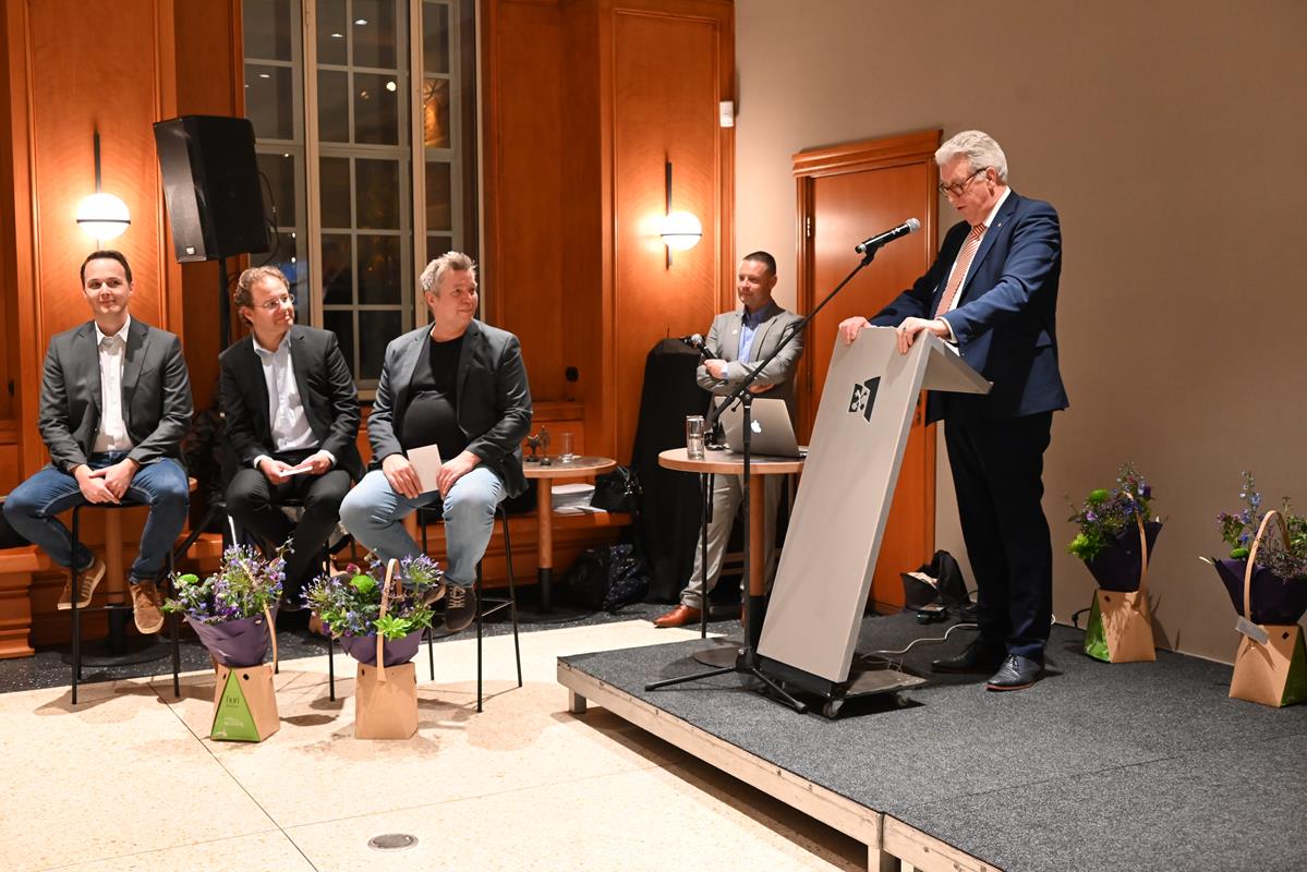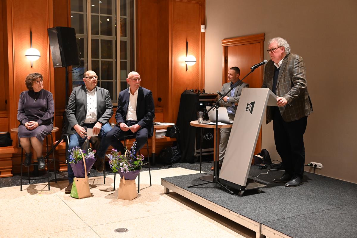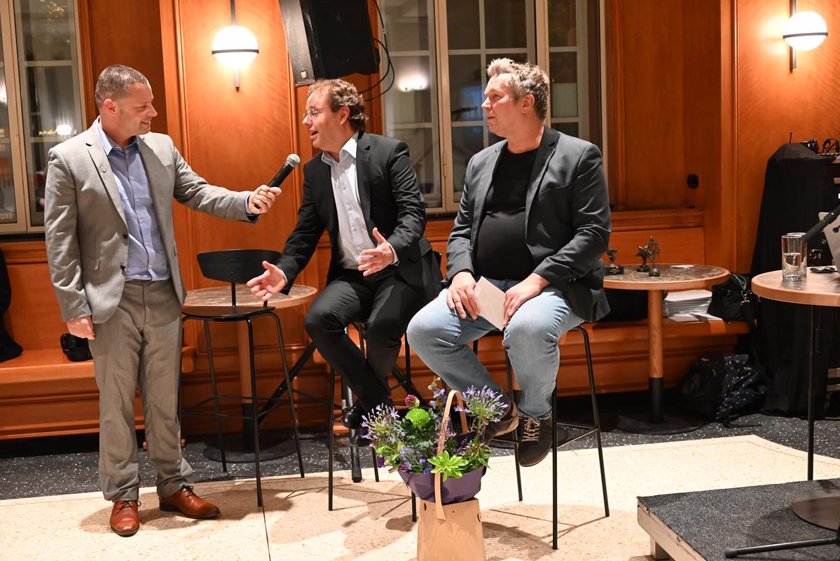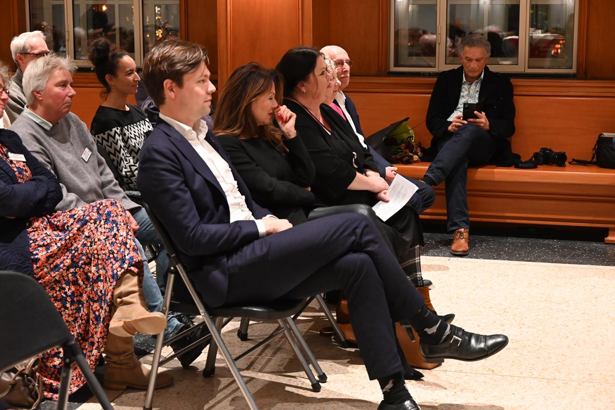 Verslaggever Casper Chaudron in gesprek met onder meer jurylid Claas Griffioen, Pieter Naber van de Leidse Reddingsbrigade en vrijwilliger van het jaar Nico Massaar.