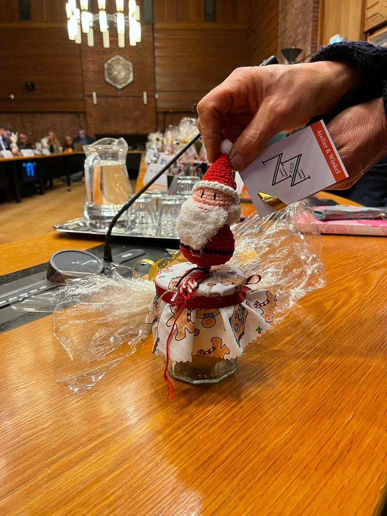 “Ik had aan Gemiva gevraagd of ze een kerstpresentje konden maken bij atelier Zij aan Zij in de Schoolstraat”, vertelt Stemerdink na afloop van de vergadering. “Daarbij dacht ik aan een kerststukje, maar ze hebben er iets veel mooiers van gemaakt.”