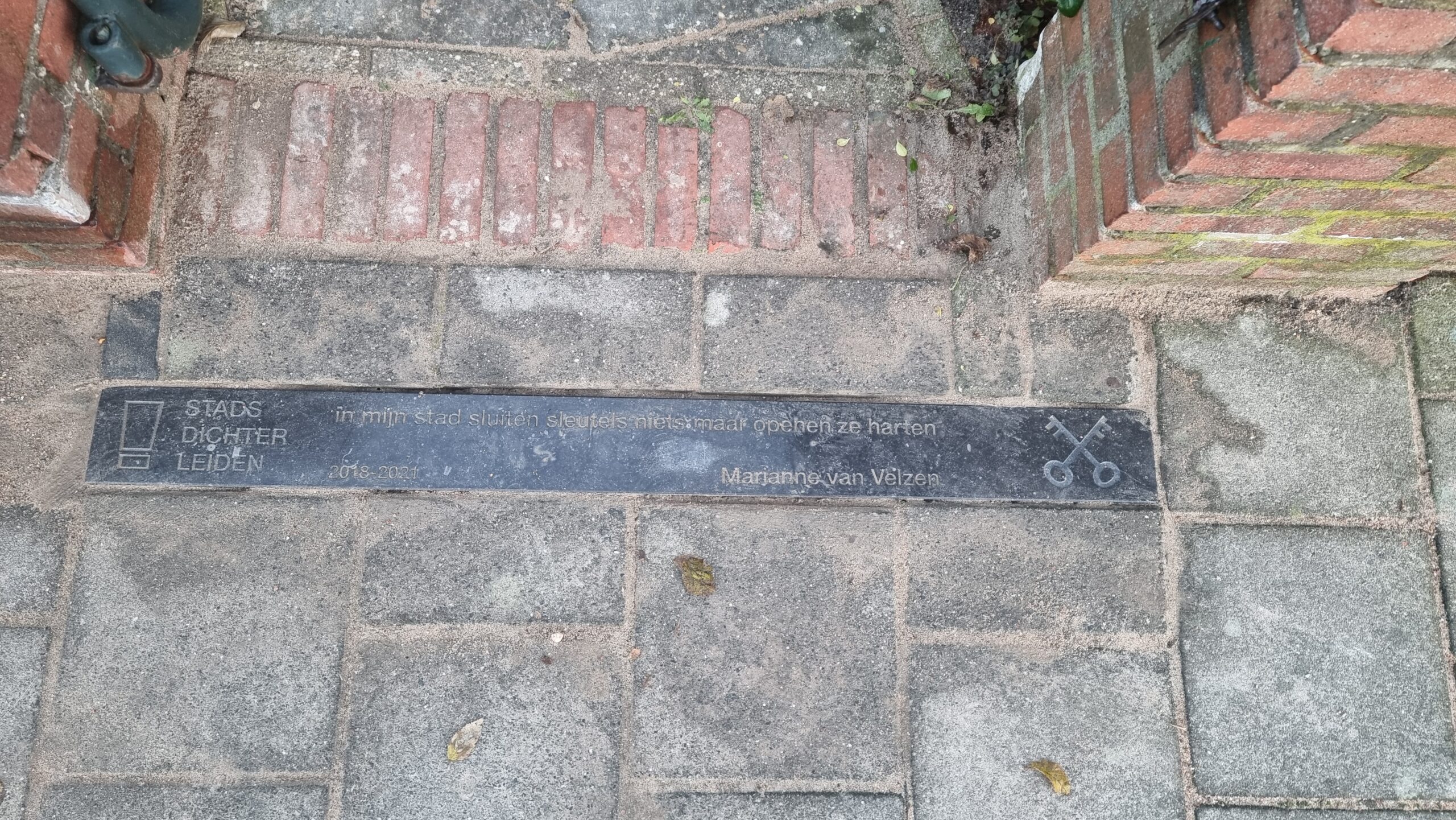 Vrijdagmiddag was het de beurt aan Marianne van Velzen die tussen 2018 en mei van dit jaar stadsdichter van Leiden was. Voor haar woning aan de Leiderdorpse Okkenrode ligt nu een steen met de passage ‘In mijn stad sluiten sleutels niets, maar openen ze harten’.