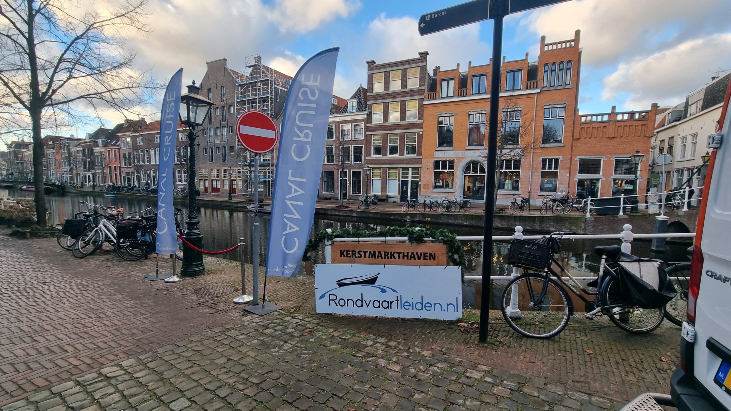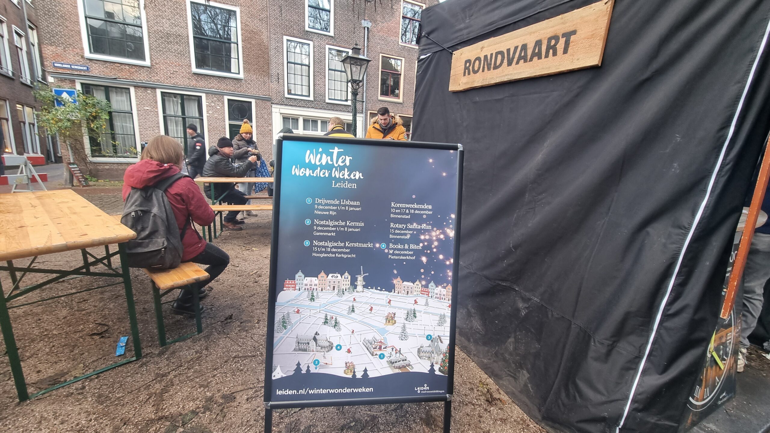 Rondvaart Leiden verzorgt elk uur een afvaart vanaf de kerstmarkt voor een rondje door winters Leiden.