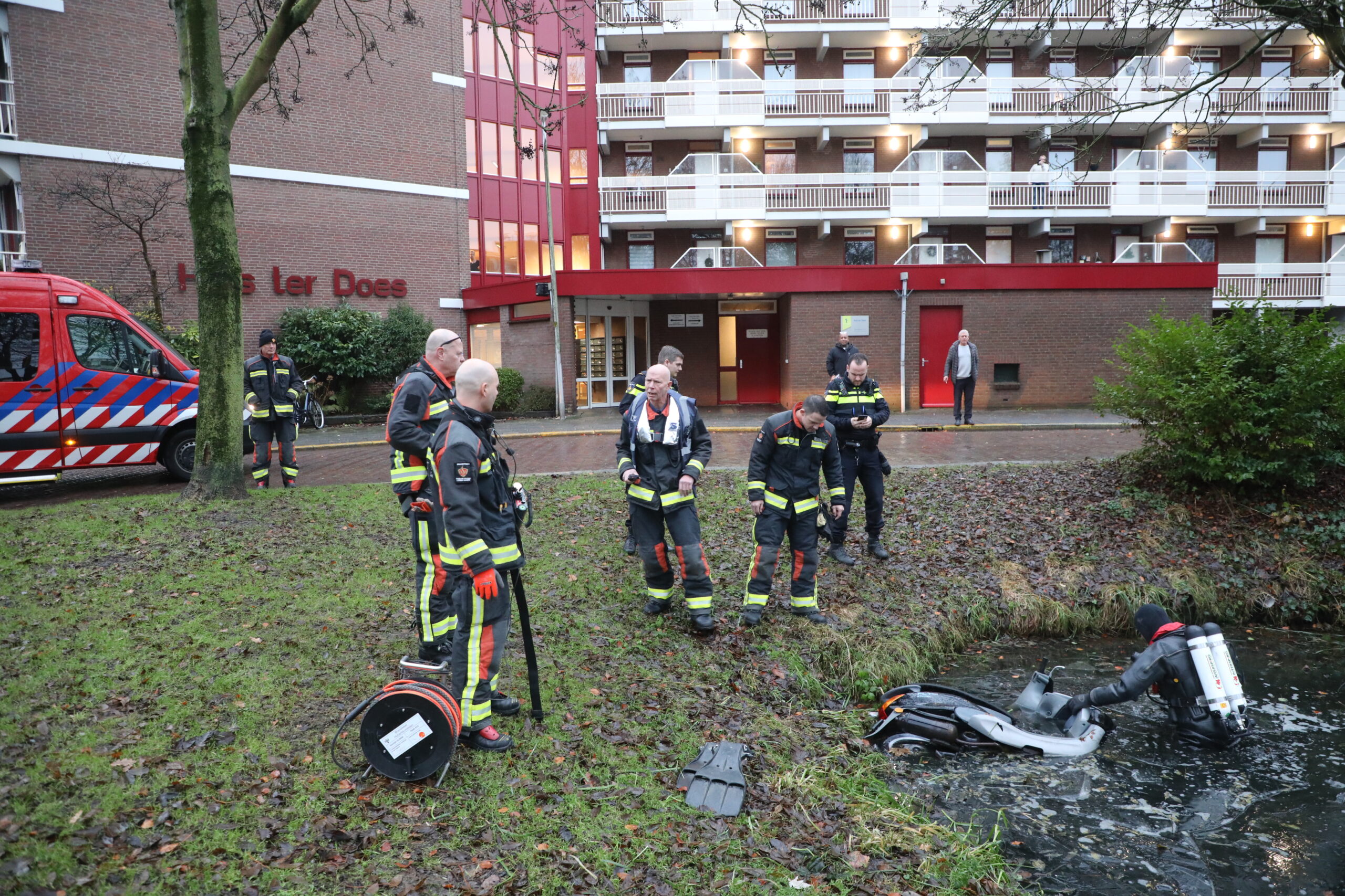 De scooter is door de brandweer uit het water gehaald. De politie zoekt uit wie de eigenaar van de scooter is.